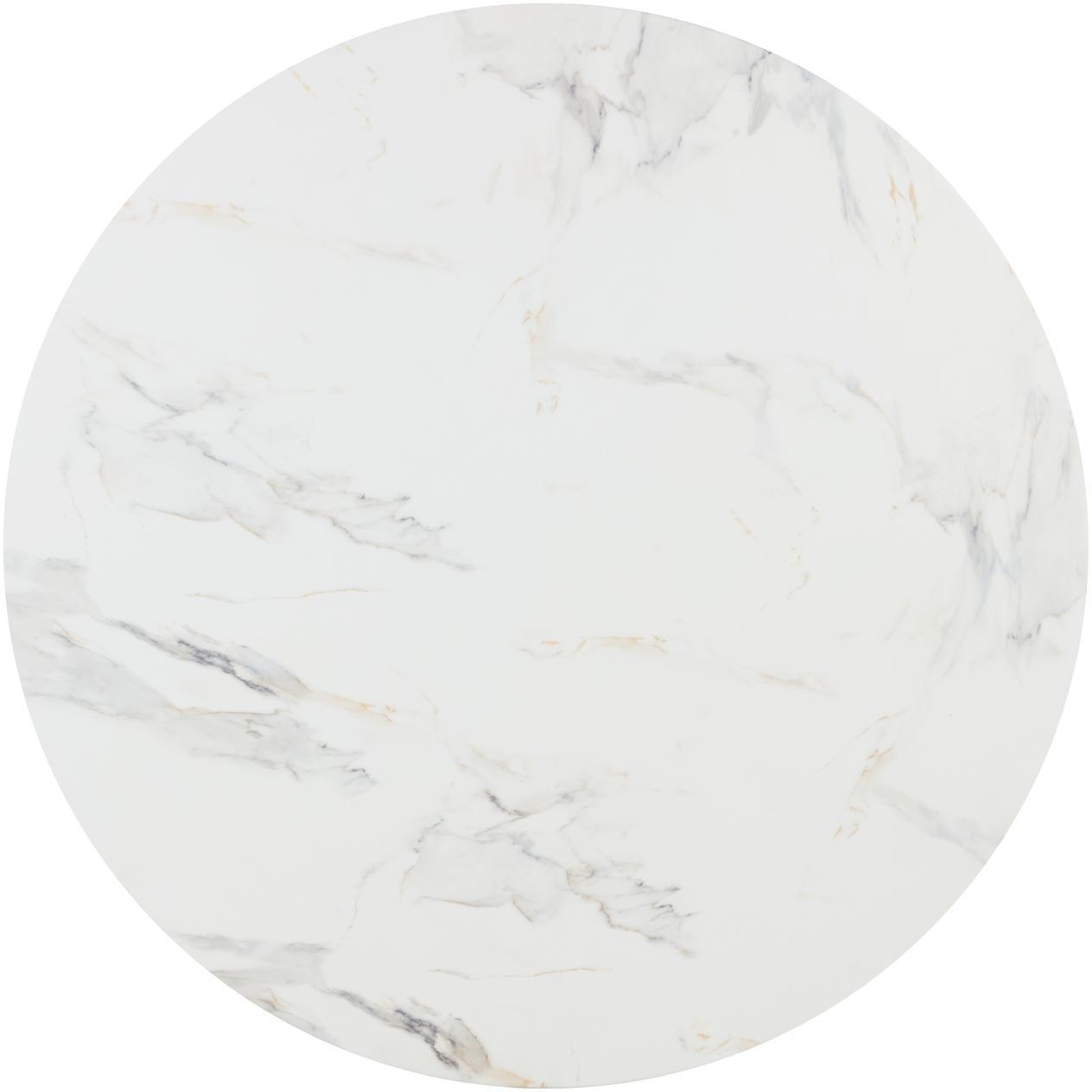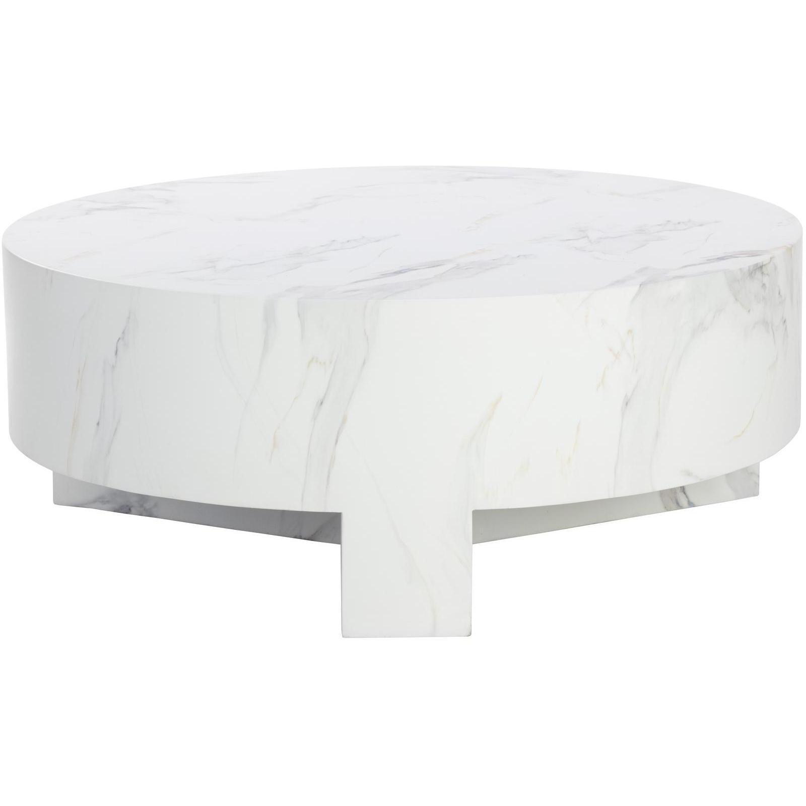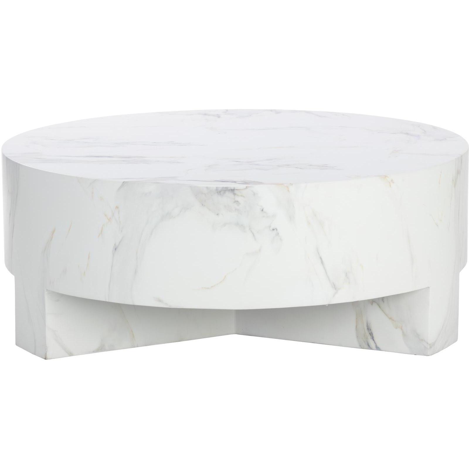 Infuse modern simplicity into any space with this alluring coffee table. Features a circular tabletop with a cutout base. Crafted from sealed concrete with a white Calacatta marble finish and its signature warm veining. This marble finish can have unique veining, pitting, fissures, micro-cracks and colour variations that add to the uniqueness and beauty of each piece.