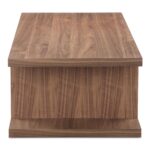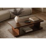The Miri coffee table features an open-shelf design with ample storage, celebrating mid-century modern style fused with practical functionality. Its timeless and foundational structure is effortlessly adaptable, complementing diverse interior styles. Its versatile walnut-tone finish allows it to integrate seamlessly into any color scheme.