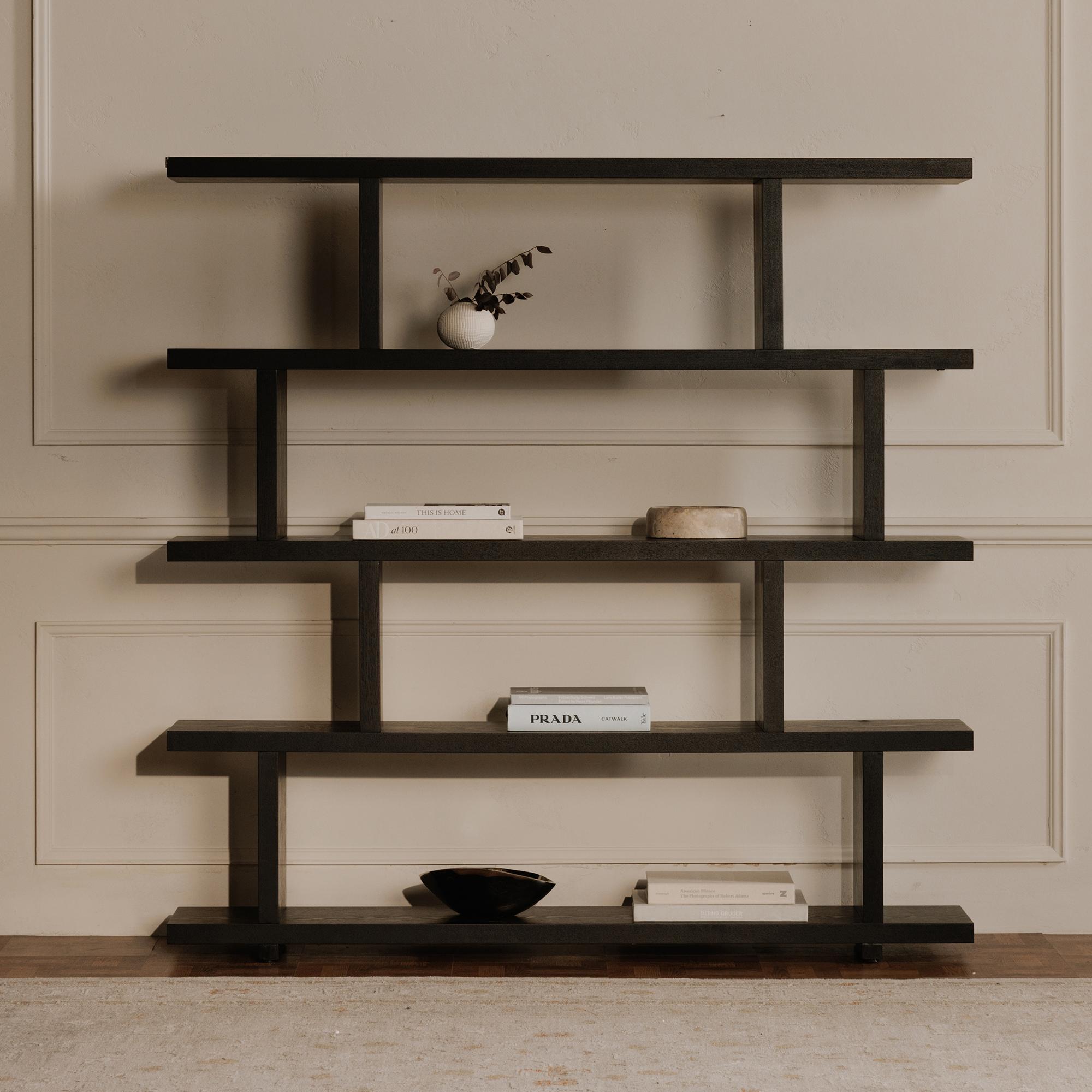 The Miri shelf’s open concept and Mid-Century Modern style make it an ideal space divider and/or bookshelf. Slide two shelving units together to create a larger seamless unit with five levels of space. Made with black ash veneer over MDF, this shelf is a testament to versatility in design.