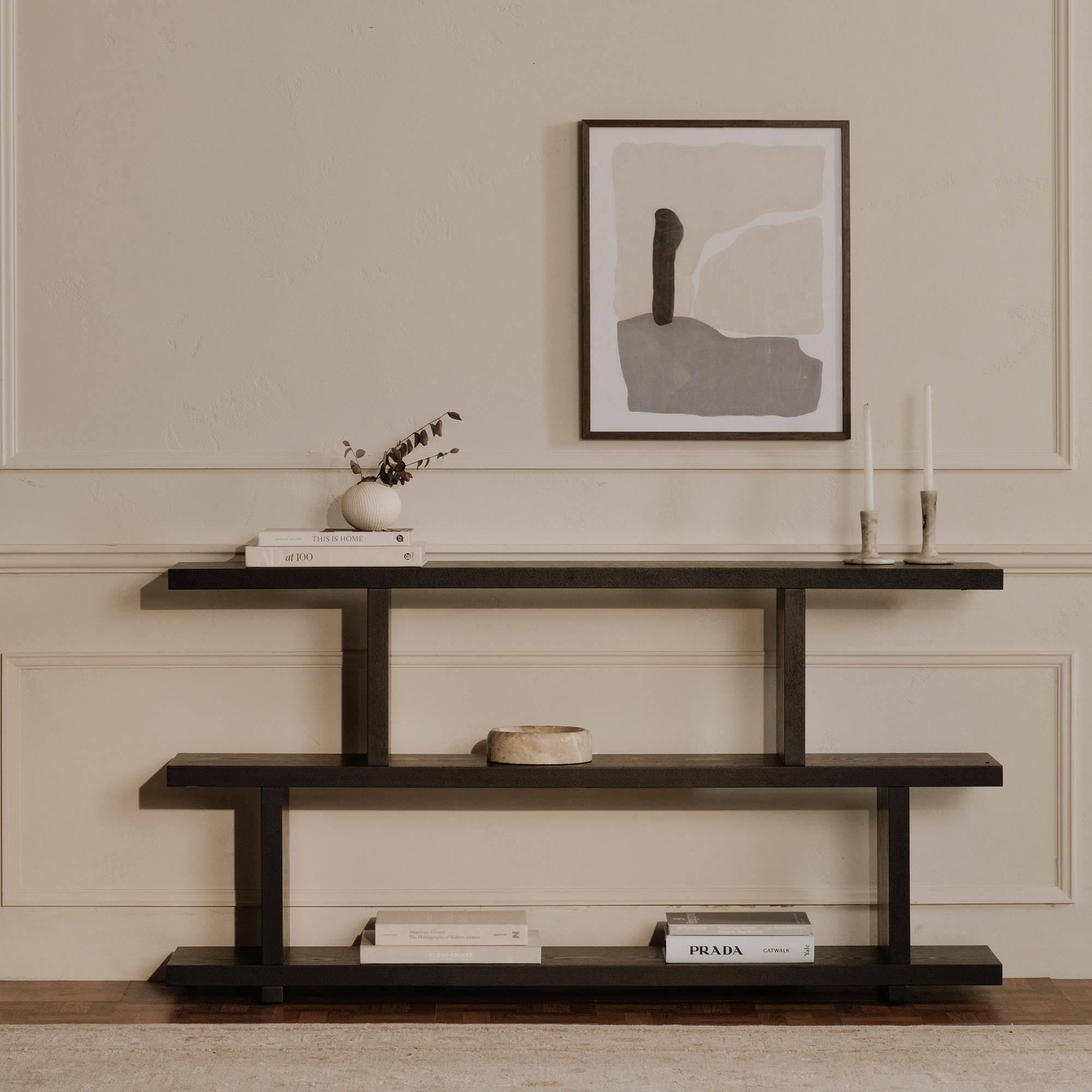 The Miri shelf’s open concept and Mid-Century Modern style make it an ideal space divider and/or bookshelf. Slide two shelving units together to create a larger seamless unit with three levels of space. Made with black ash veneer over MDF, this shelf is a testament to versatility in design.