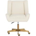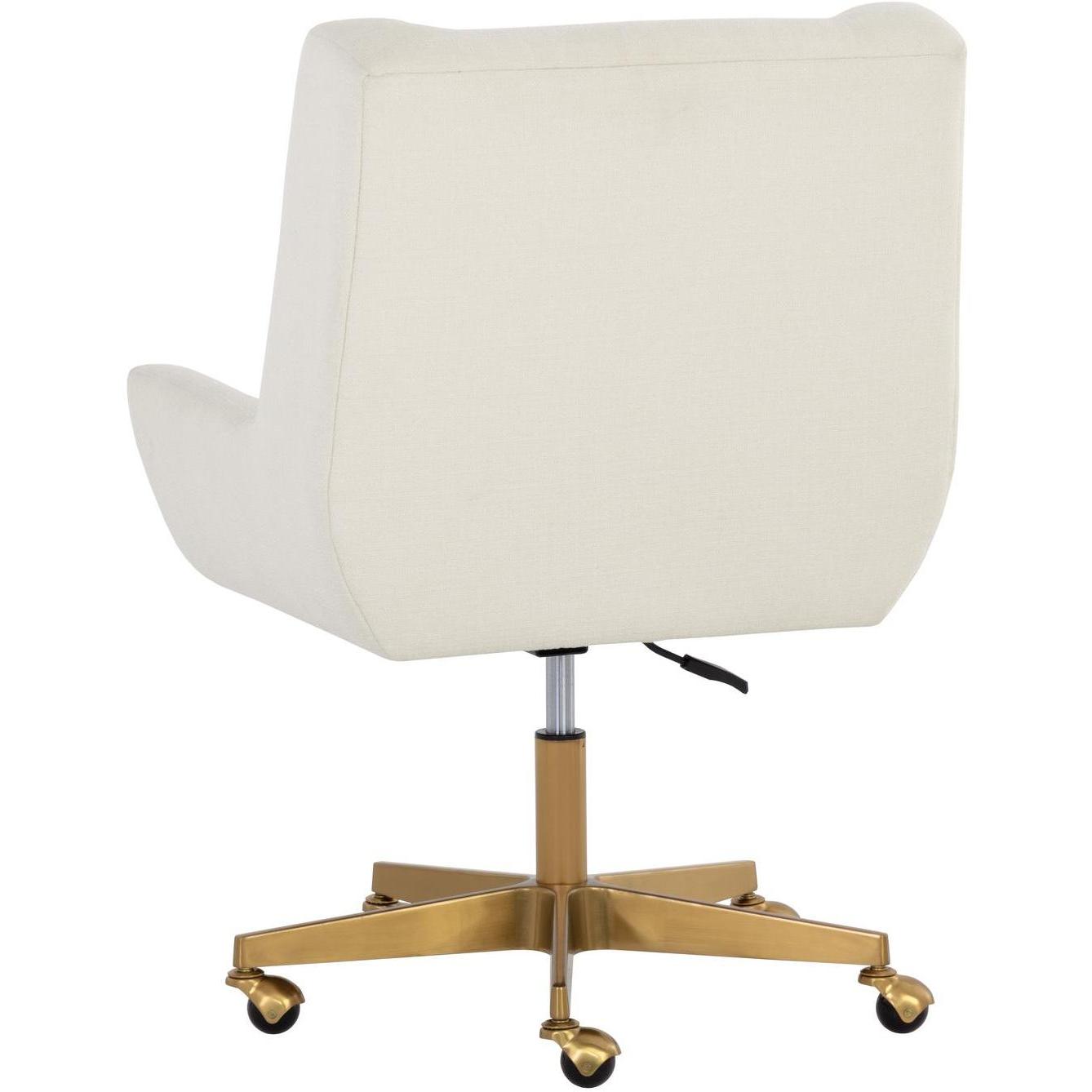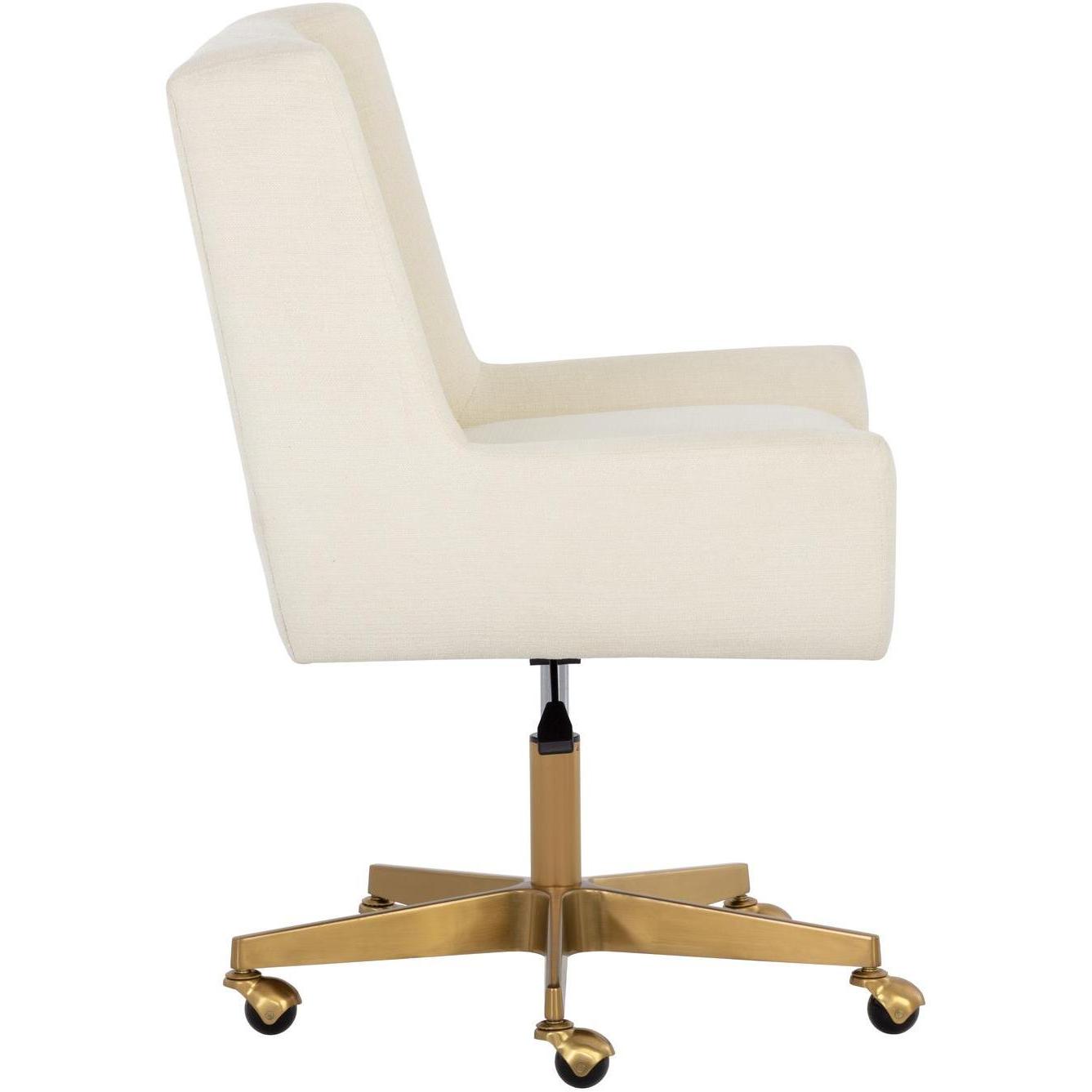 Add a hint of modern glamour to any workspace with this grand office chair. Stocked in zenith alabaster performance fabric. Completed with a matte gold stainless steel base with added castors for mobility. Performance fabric is moisture repellent, durable and easy to clean.