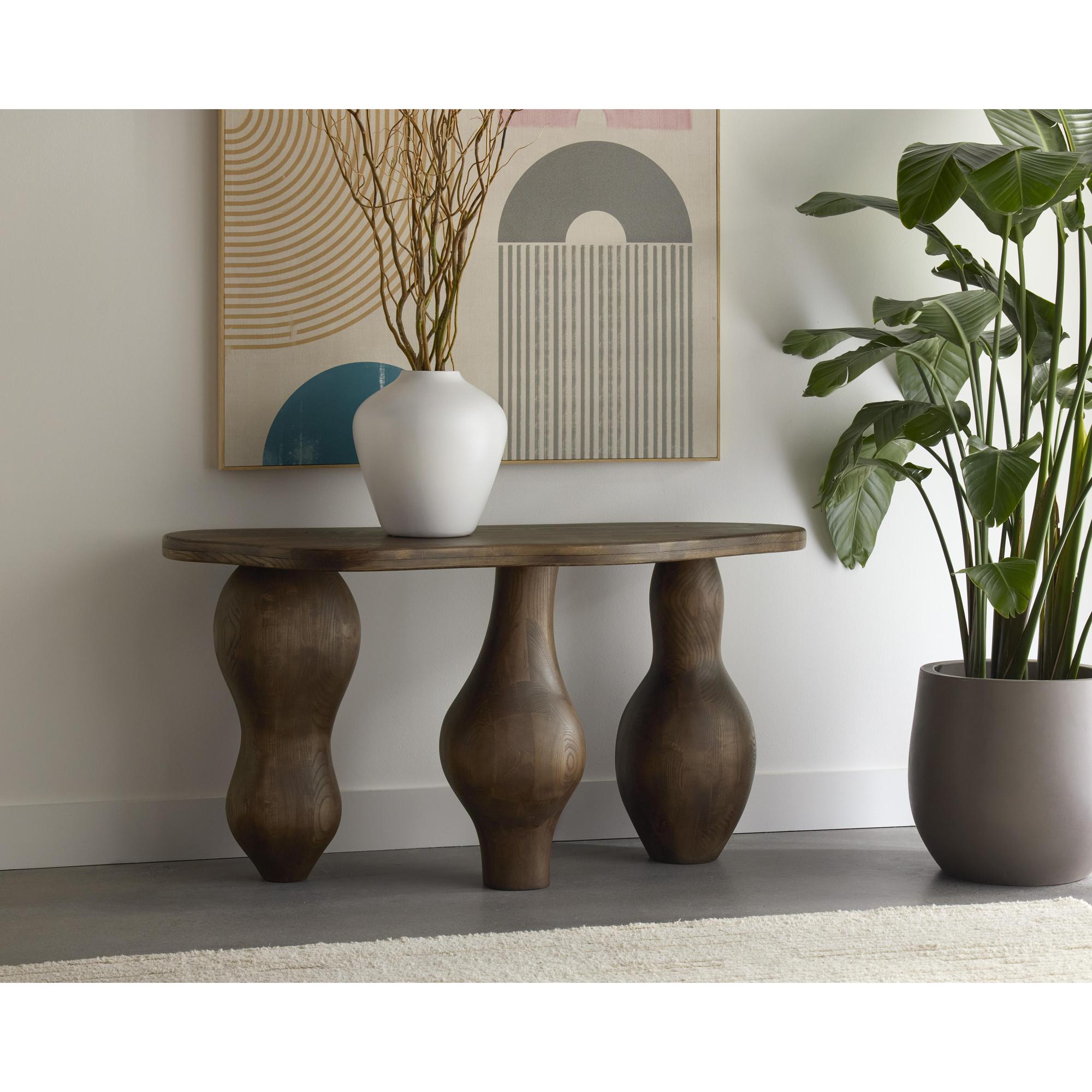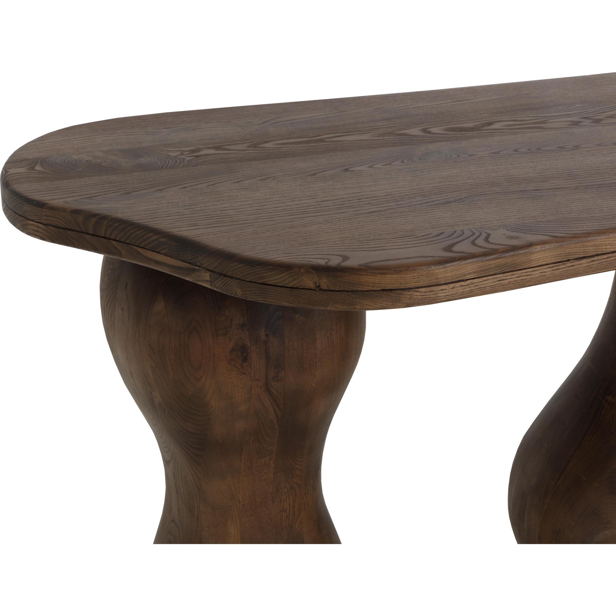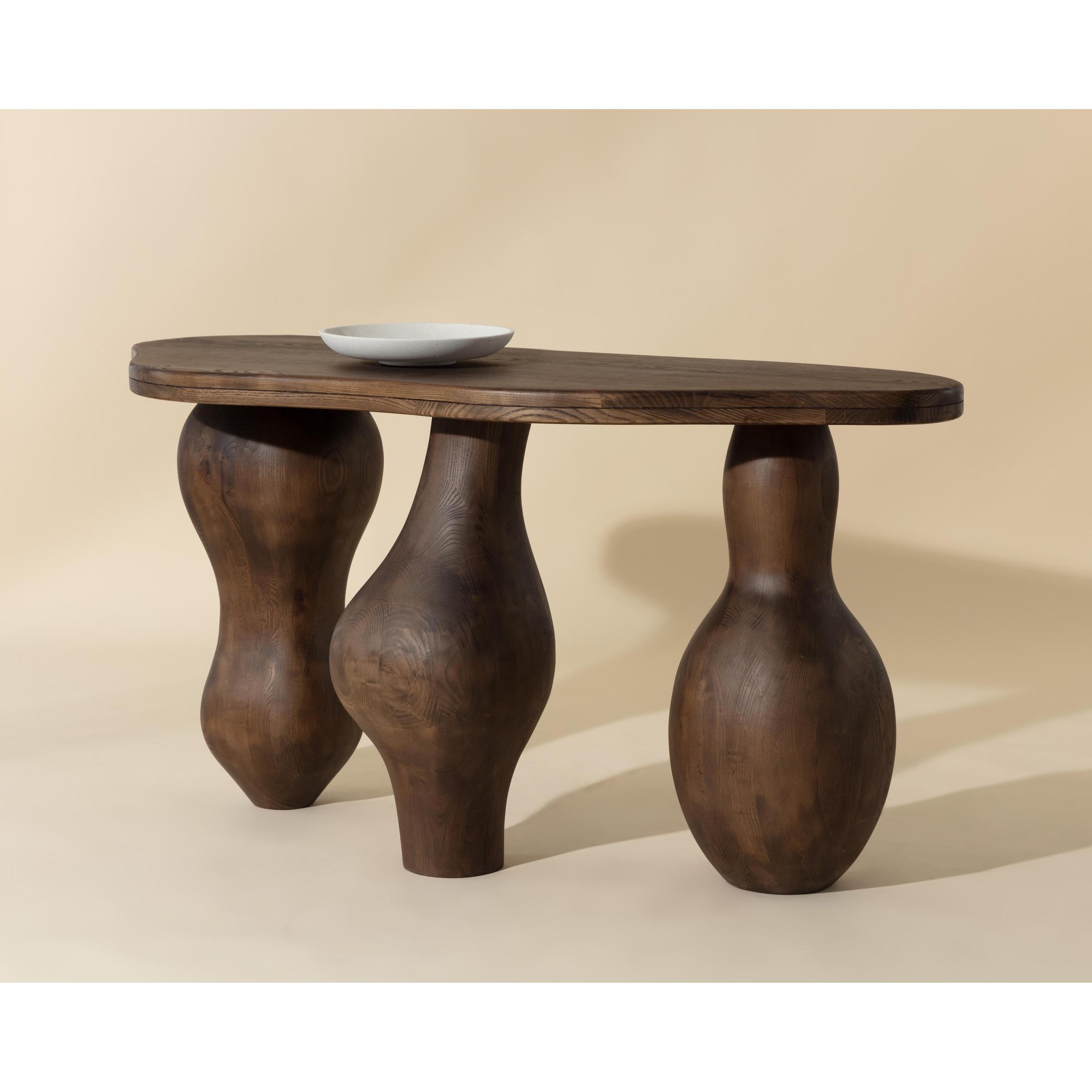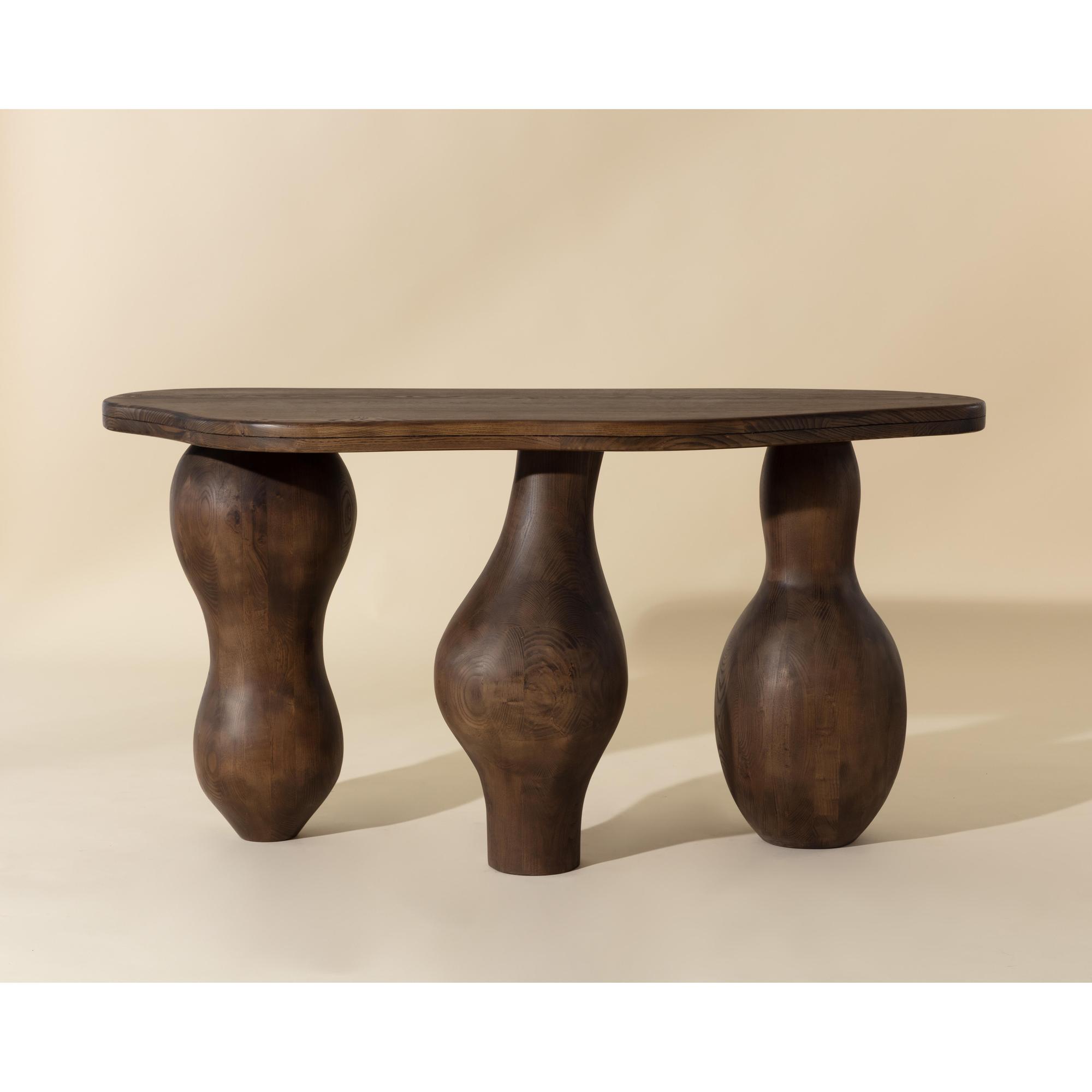 The Miro Console expresses the uniqueness of organic-inspired modern design with its droplet legs and top. Masterfully sculpted in solid polished brown ash wood and with a smooth asymmetrical top, this console showcases the beauty in irregularity.