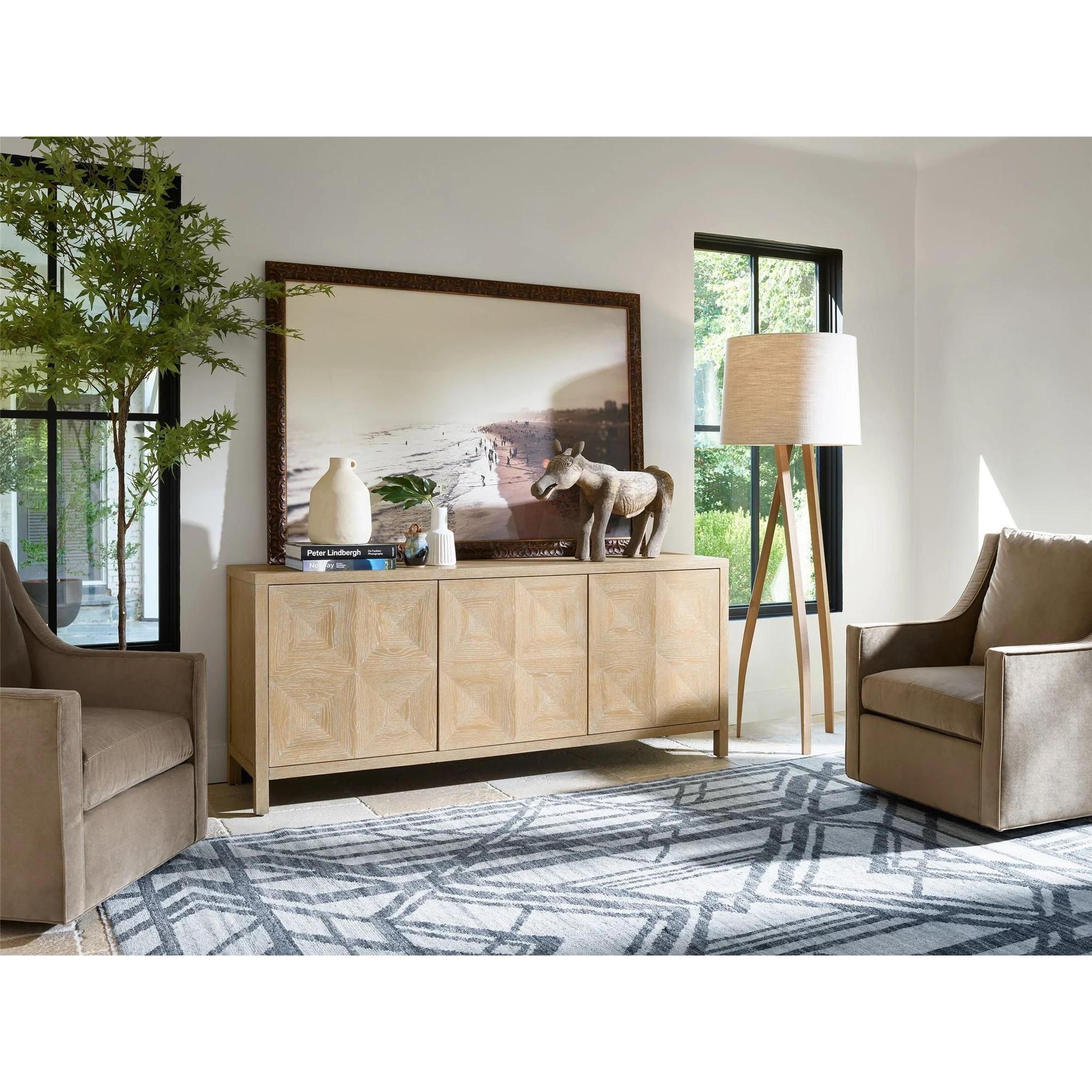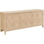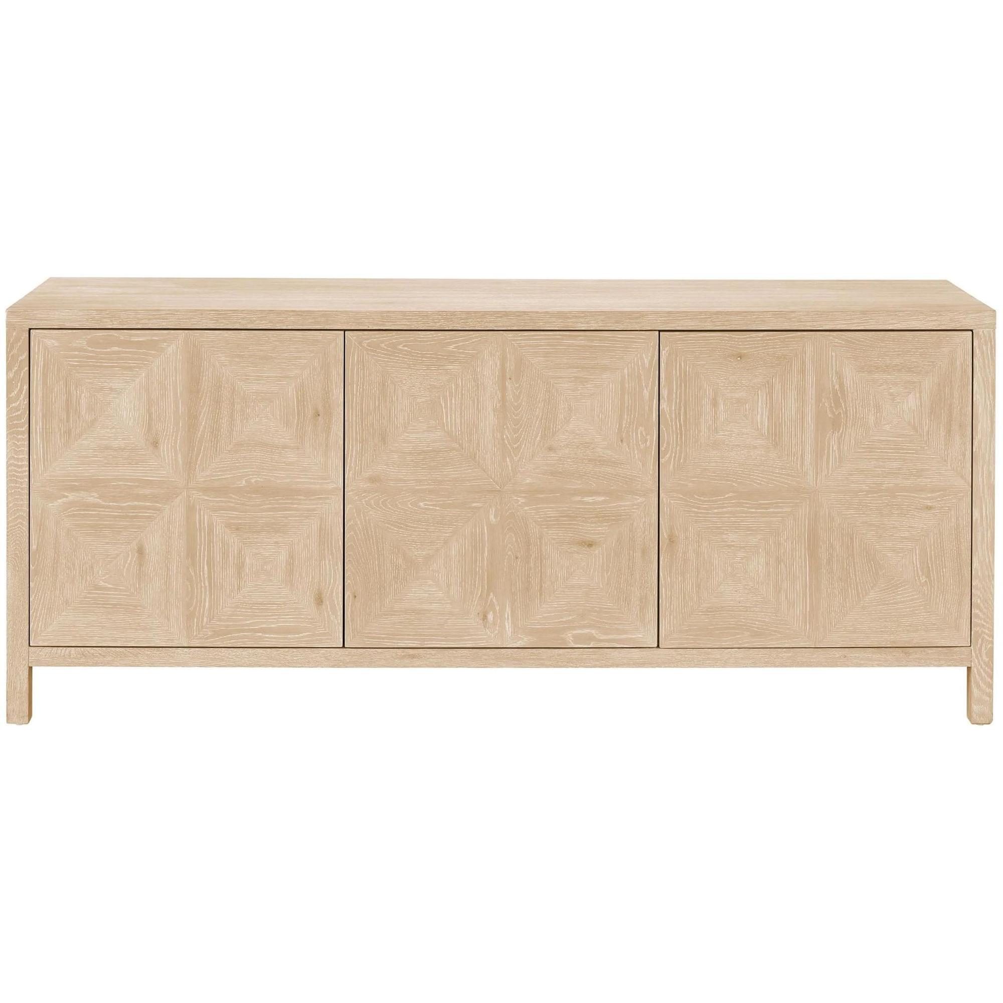 Introduce elegance into living spaces with the Sadie Credenza in a natural oak finish. This stunning storage piece features three doors with adjustable shelves, encased in a subtly etched, geometric-inspired silhouette.