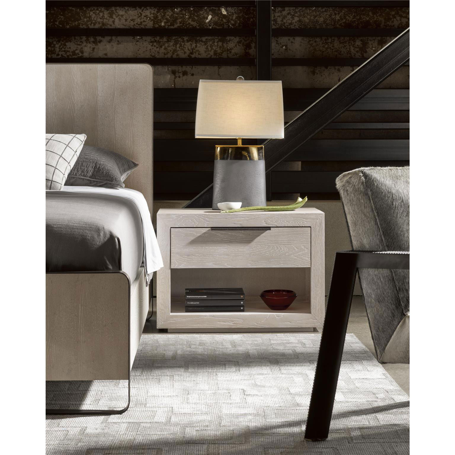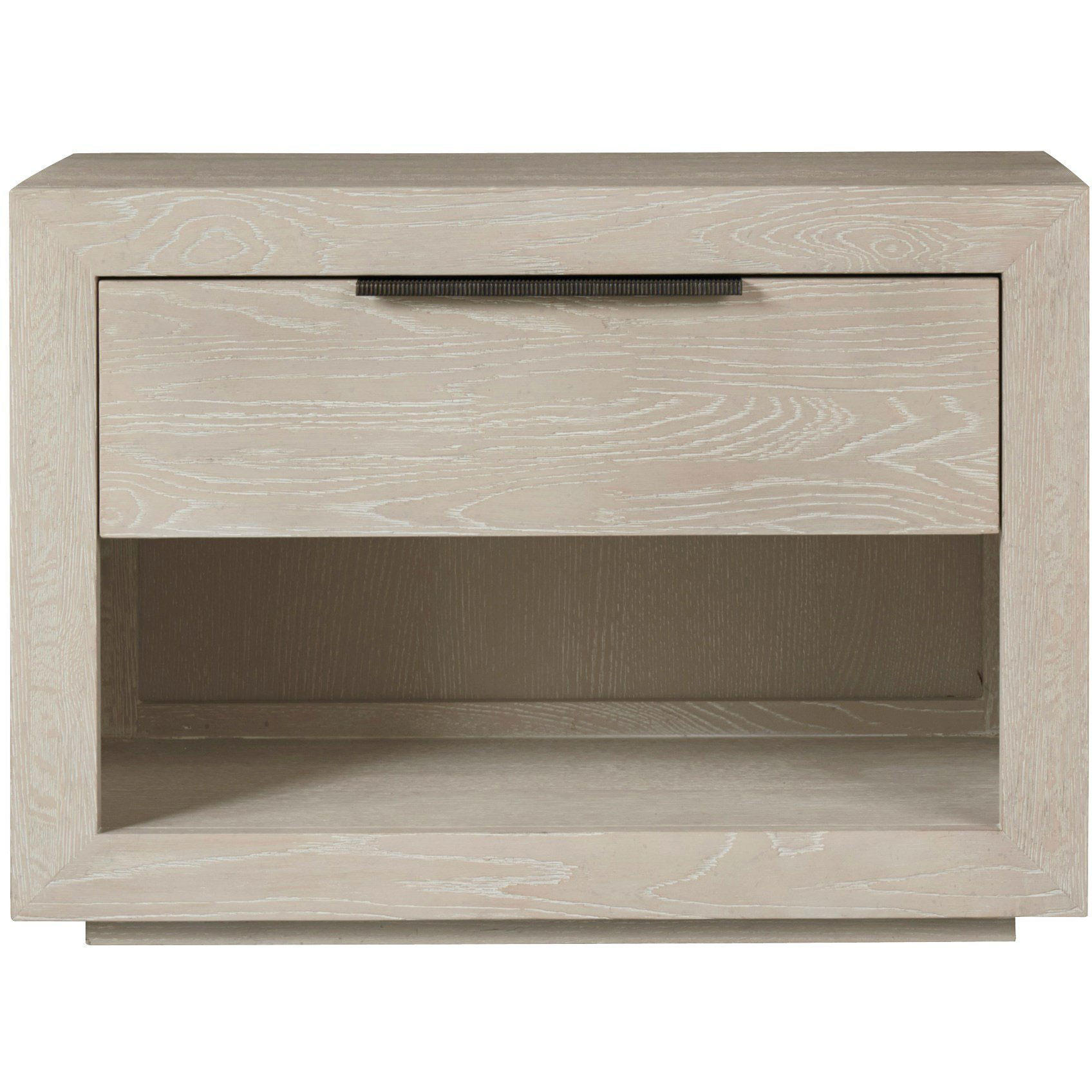 The Huston Nightstand is a perfectly sized bedside accent, showcasing one enclosed top drawer, a lower open display area, and a calming Quartz finish.