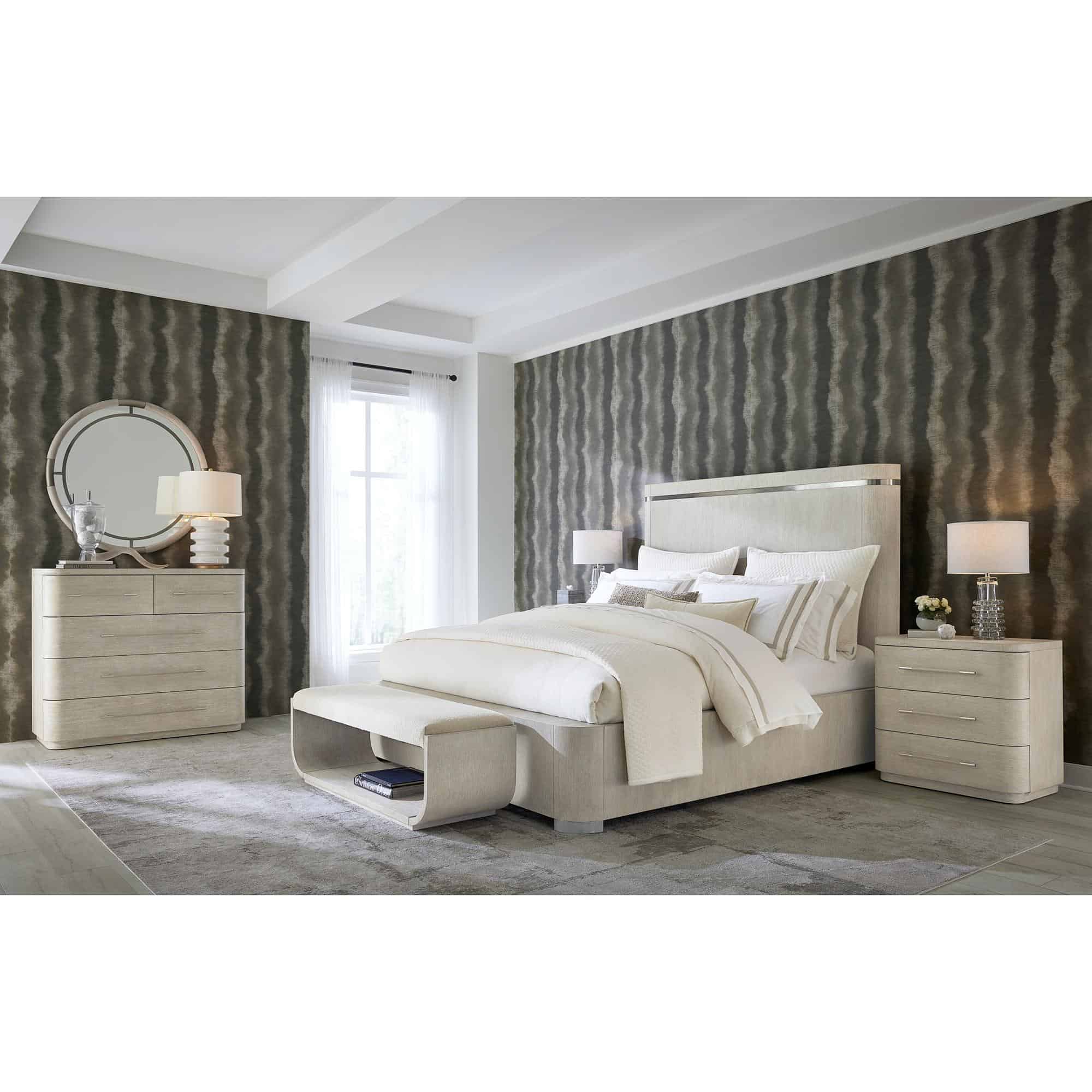 Finish: Diamond finish: flat cut quartered oak veneers with wire-brush detailing in a light finish with crystal-like alabaster and pewter hues delivering a soft sophistication. Warm pewter metal trim and metal wrapped feet.