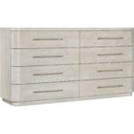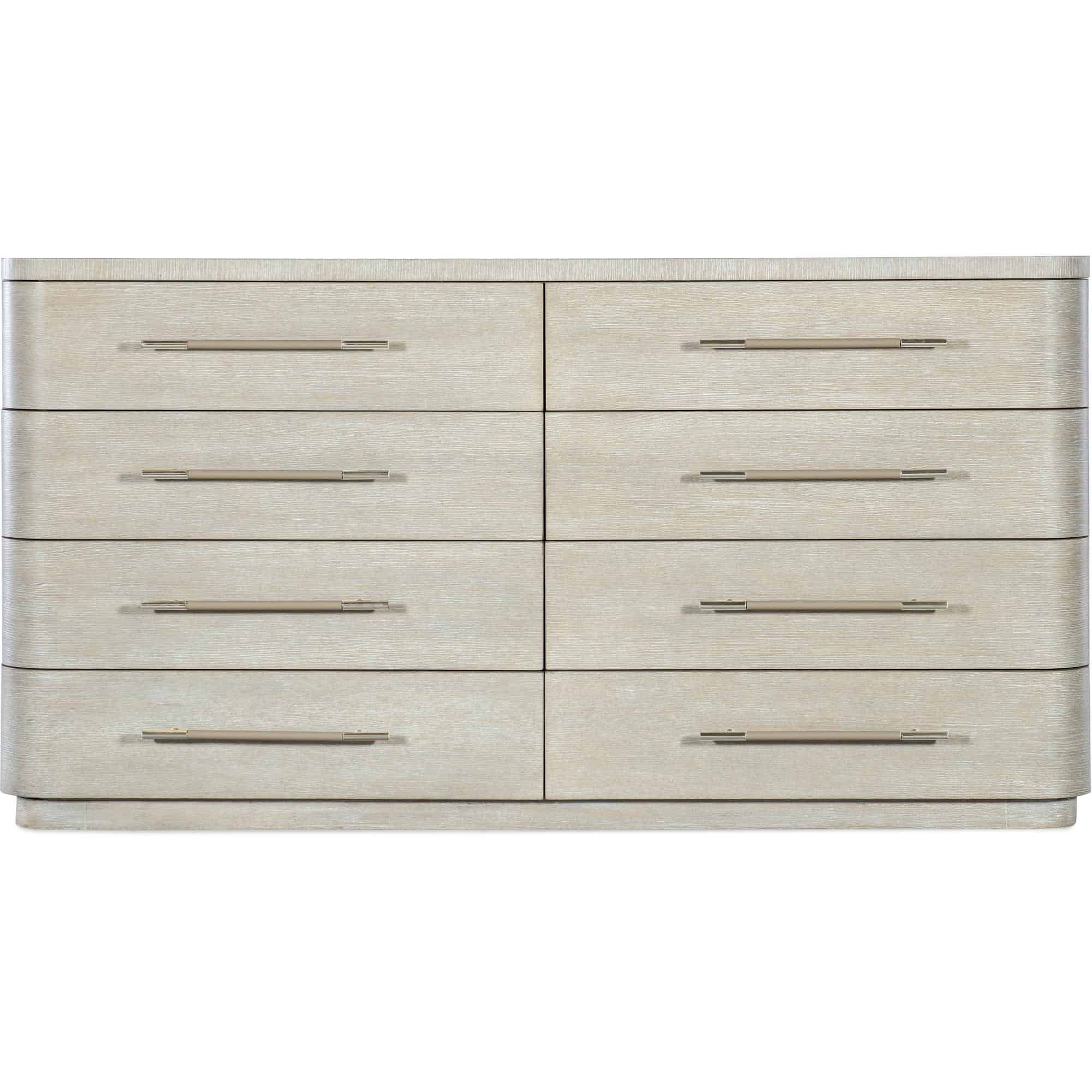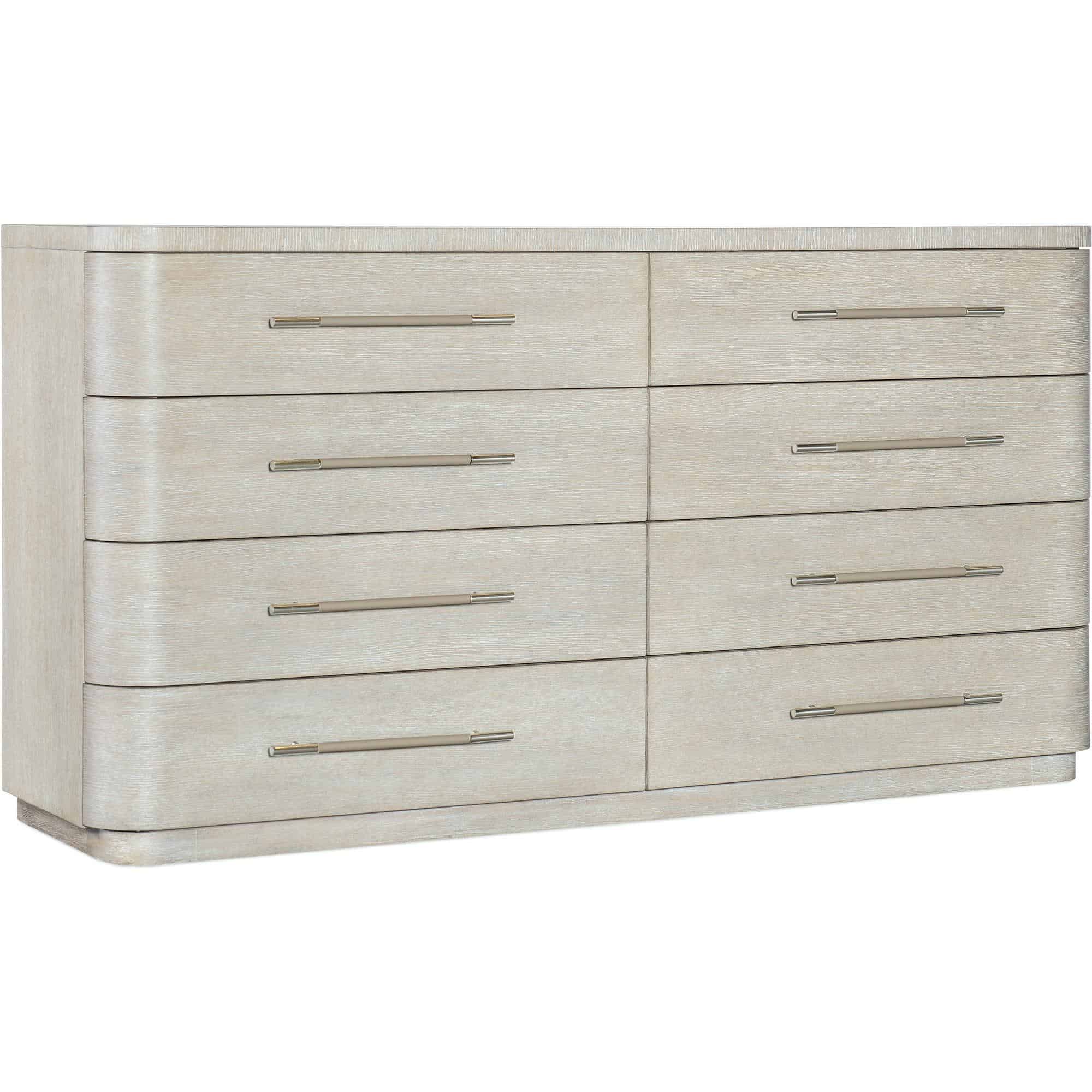 Finish: Diamond finish: flat cut quartered oak veneers with wire-brush detailing in a light finish with crystal-like alabaster and pewter hues delivering a soft sophistication. Warm pewter bar pulls wrapped in leather.