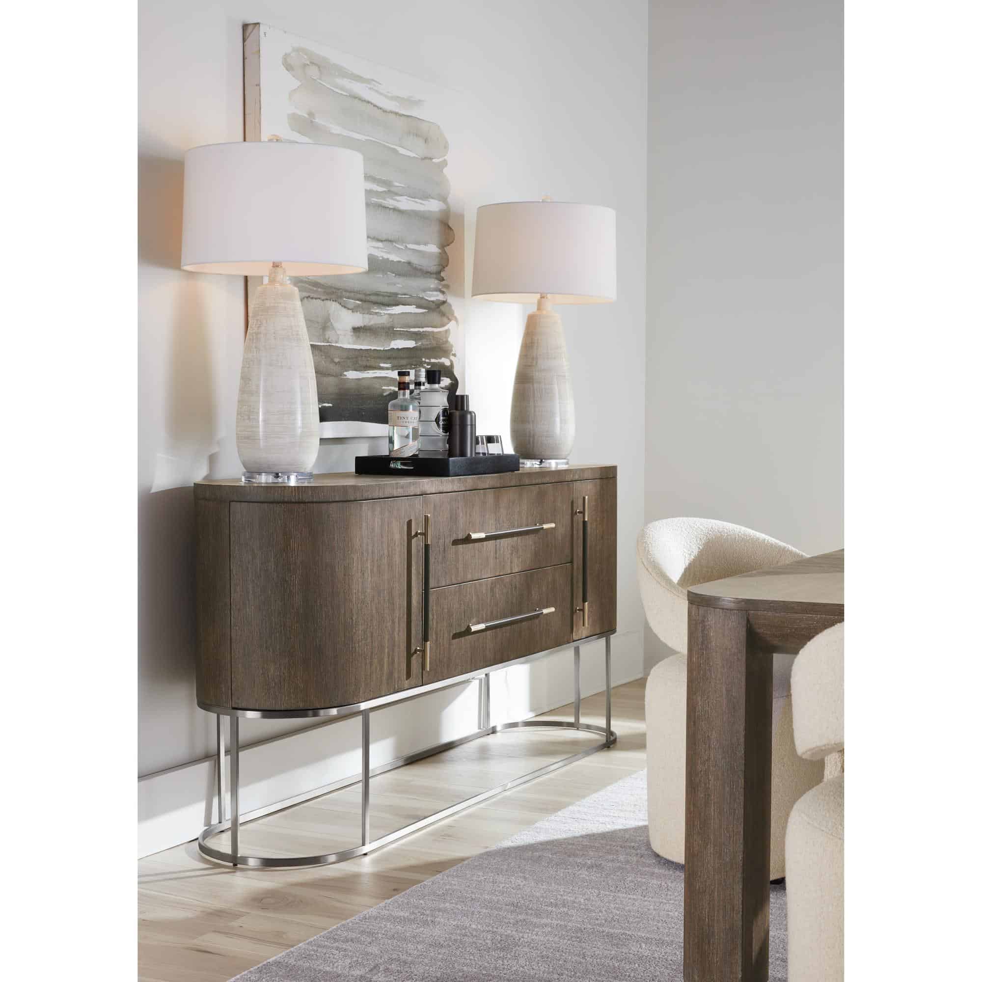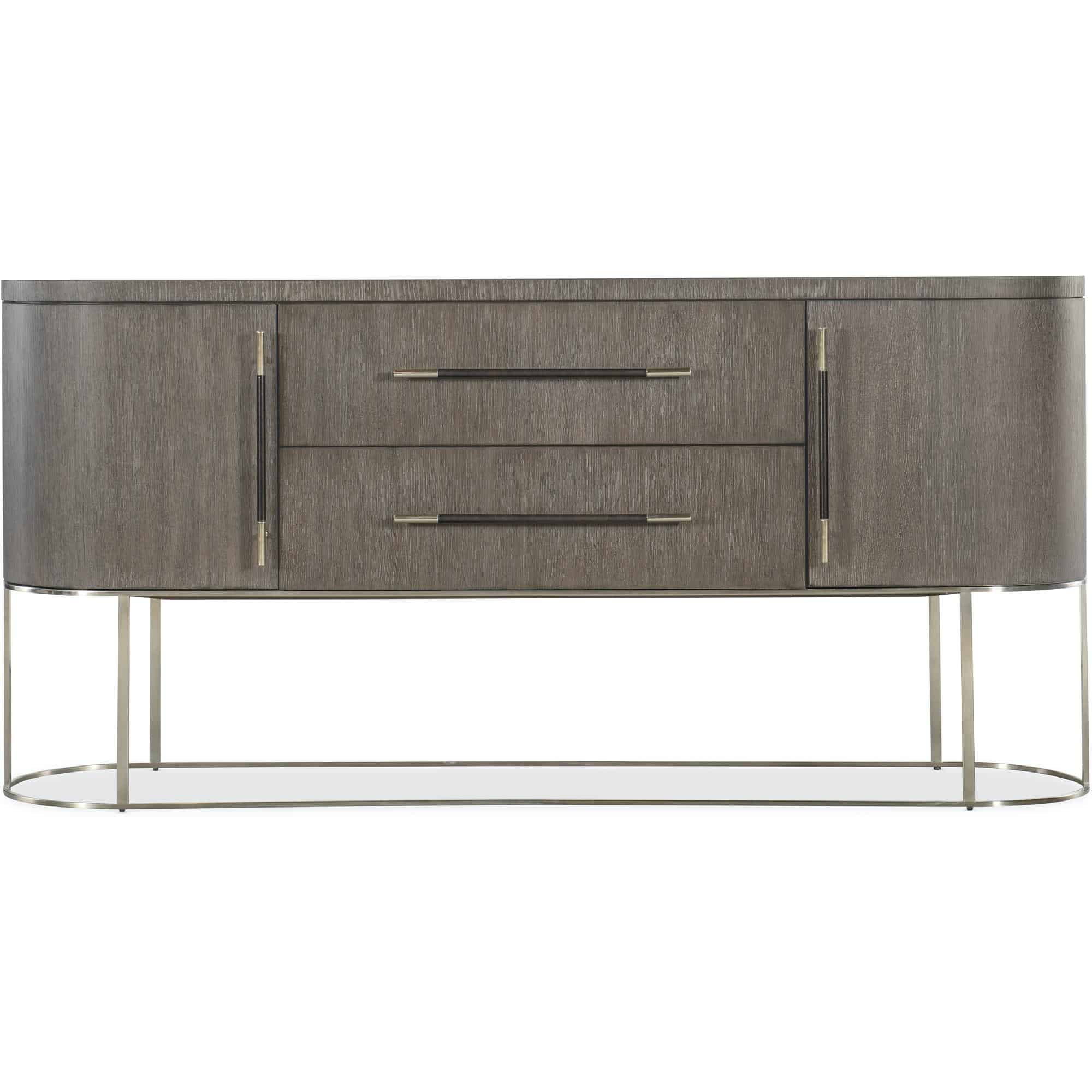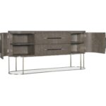 Finish: Mink finish: flat cut quartered oak veneers with wire-brush detailing in a dark, earthy brown with notes of black delivering a timeless aesthetic. Brushed metal in warm pewter finish. Bar pulls are warm pewter metal and wrapped in leather.