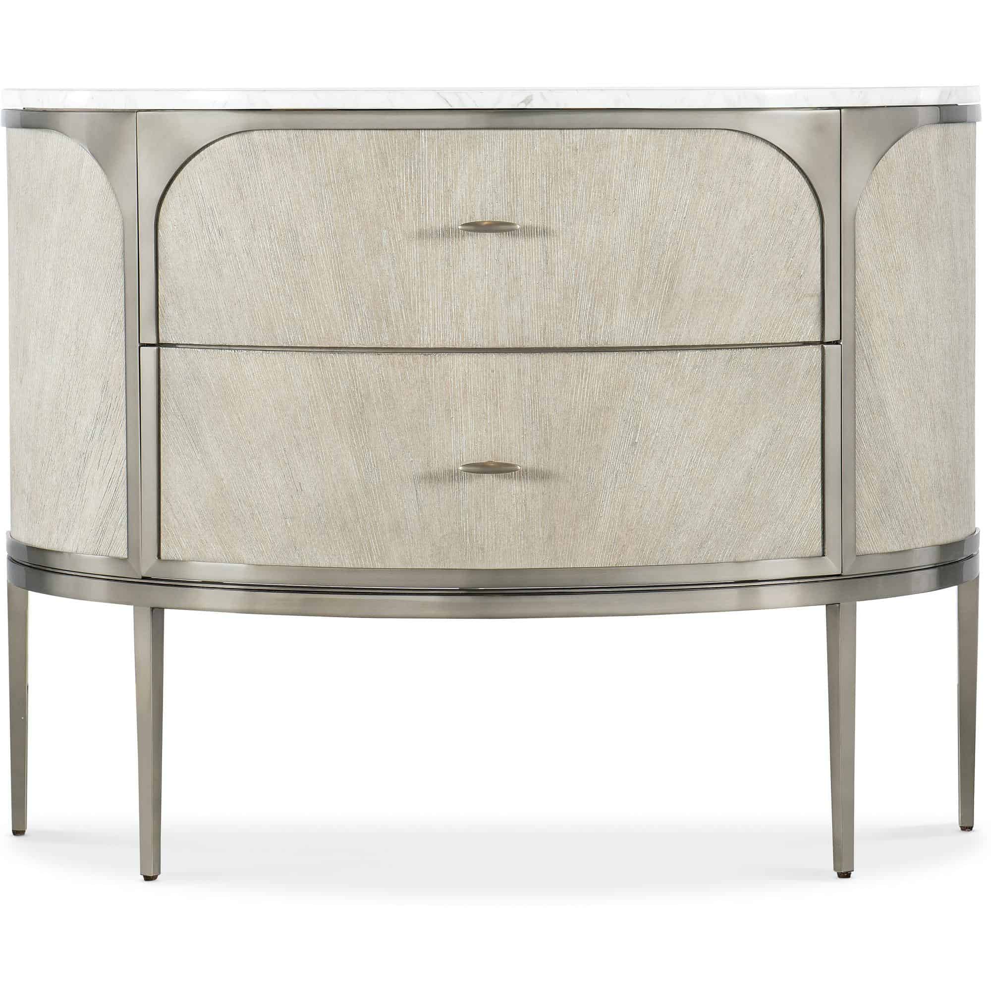 Finish: Diamond finish: flat cut quartered oak veneers with wire-brush detailing in a light finish with crystal-like alabaster and pewter hues delivering a soft sophistication. Warm pewter metal and t-shaped pulls.