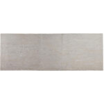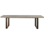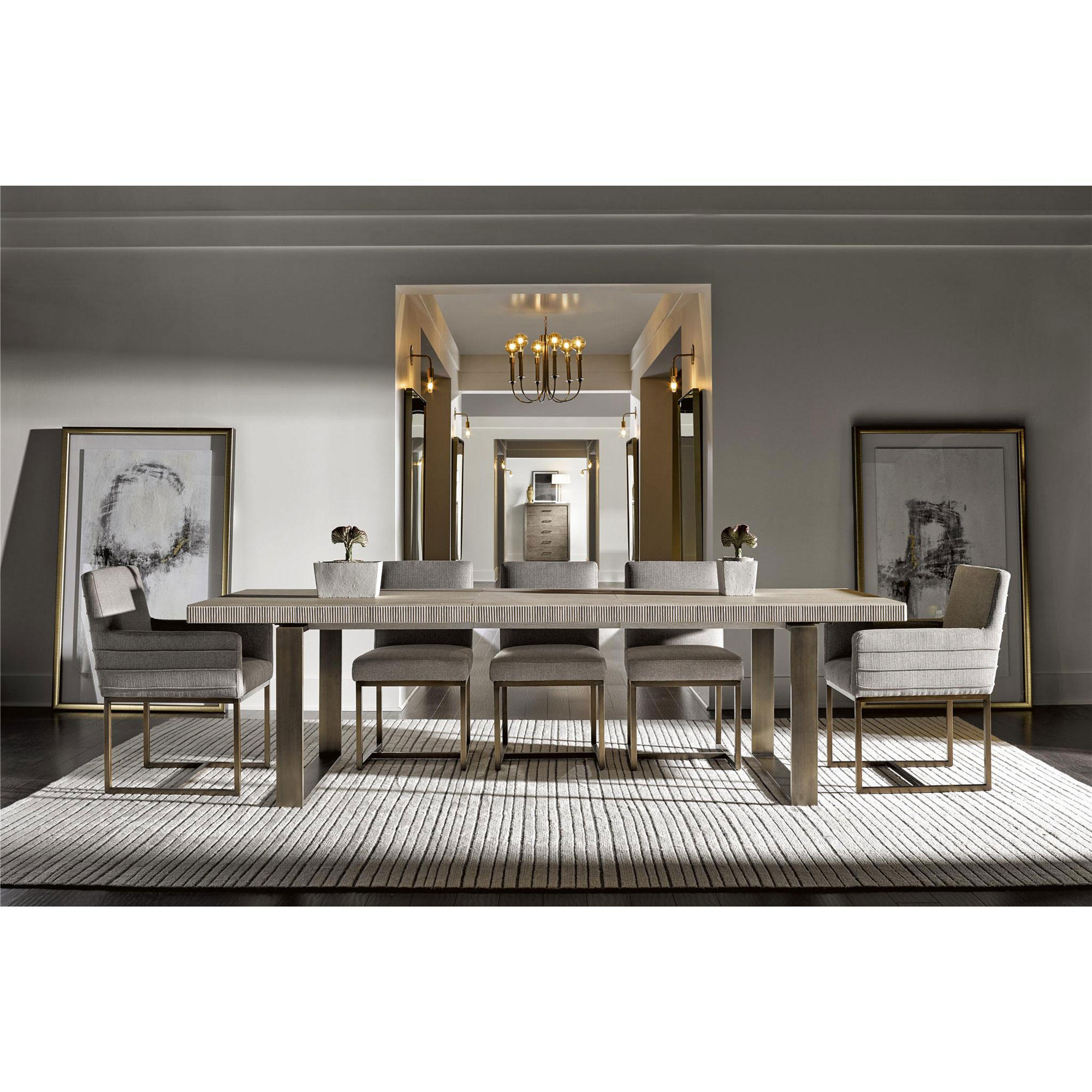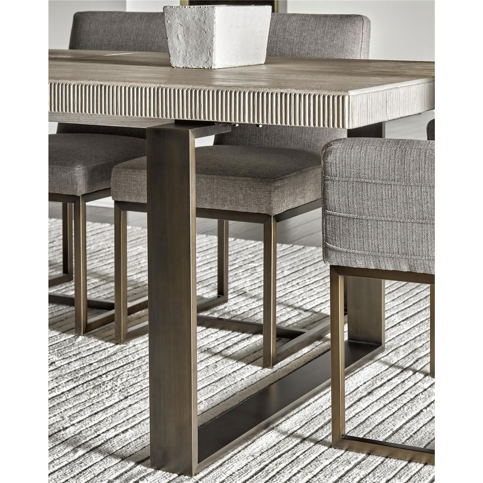 The Robards Rectangular Dining Table artfully juxtaposes a lustrous bronze base against a delicately ridged, matte-finished wood, creating a bold dining room statement piece.