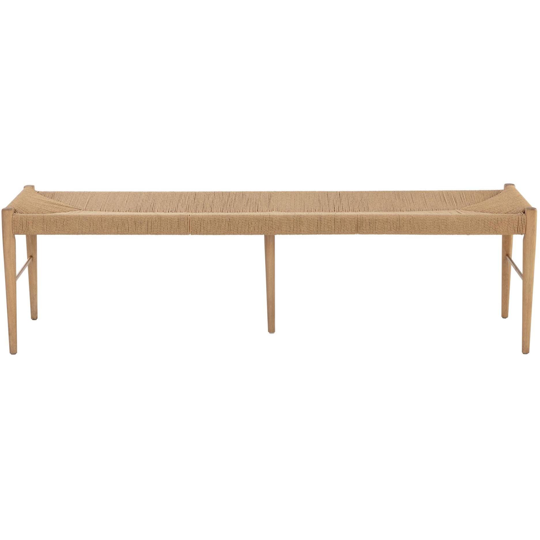 The Moira bench brings together a sleek modern silhouette with a coastal look. Features sturdy seating made from natural paper rope and a white wash oak frame. Brass painted stretcher bars complete the design. As wood is an organic, porous material, these pieces will contain natural variation of texture and may also exhibit fine indentations and cracks. Wood pieces will also display a disparity of colour and grain, and visible knots and burls that add to the character of each piece. Due to the natural contents of natural paper rope, it is advised to minimize contact with strongly dyed fabrics to avoid discolouration and/or colour transfer.