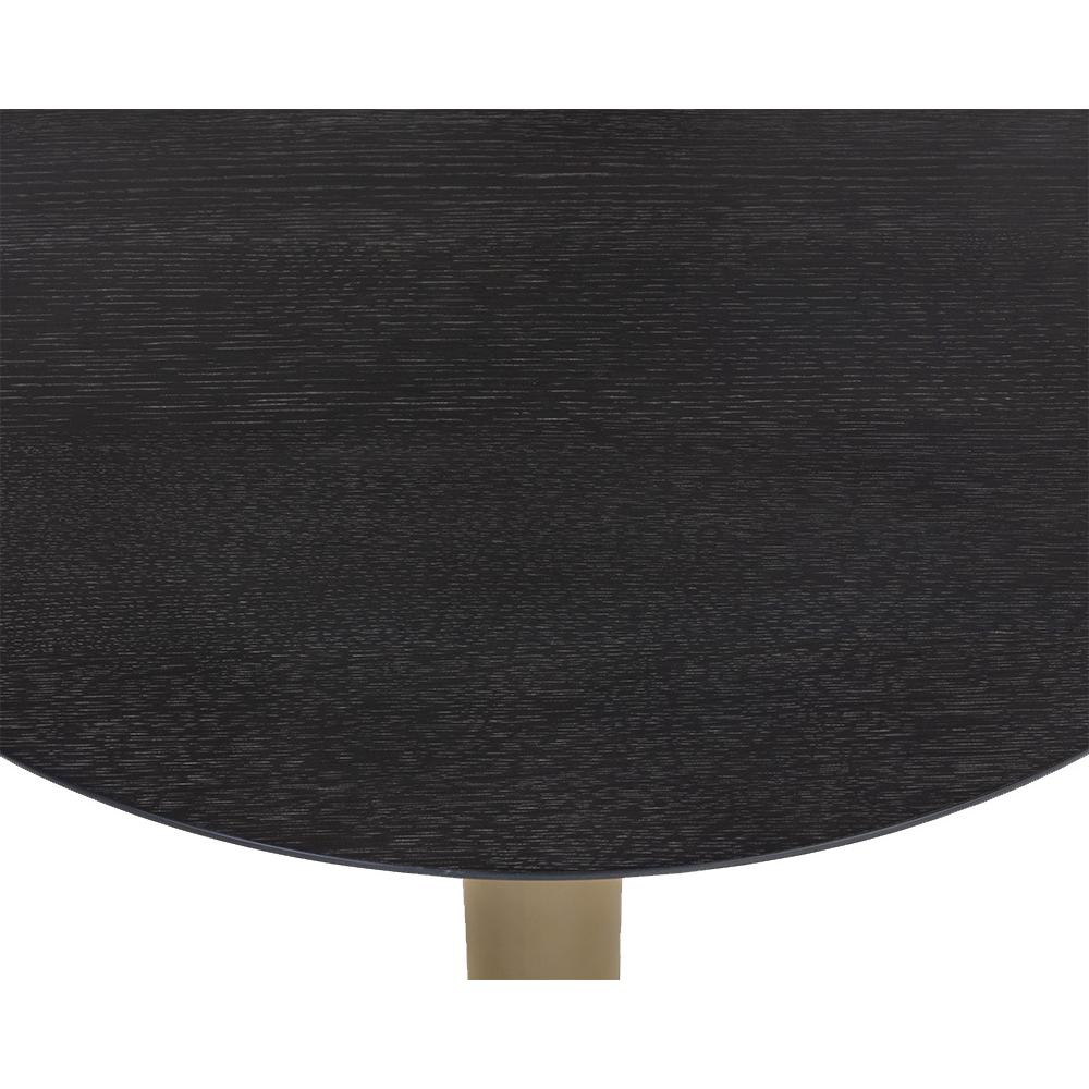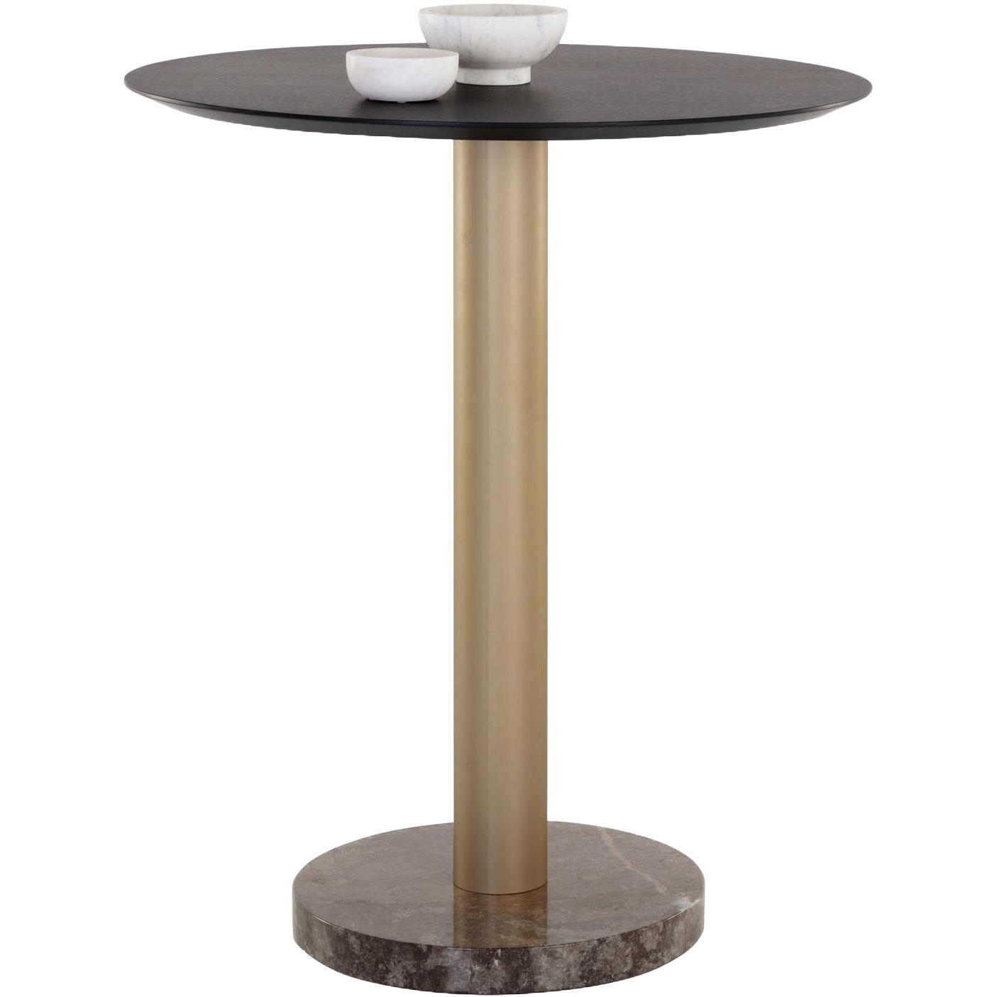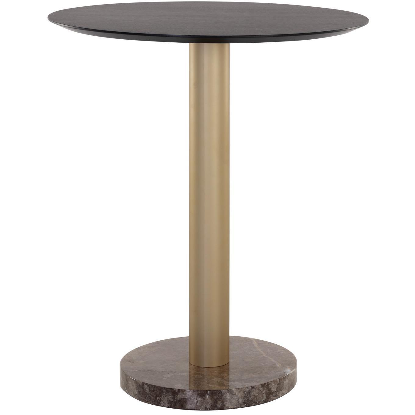 This bar table offers a modern look with an organic feel. Features a substantial light grey marble top and brushed gold iron base with a charcoal grey finished oak wood veneer top. As marble is a natural material, unique veining, pitting, fissures, micro-cracks and colour variations are all characteristics that add to the uniqueness and beauty of each piece.