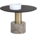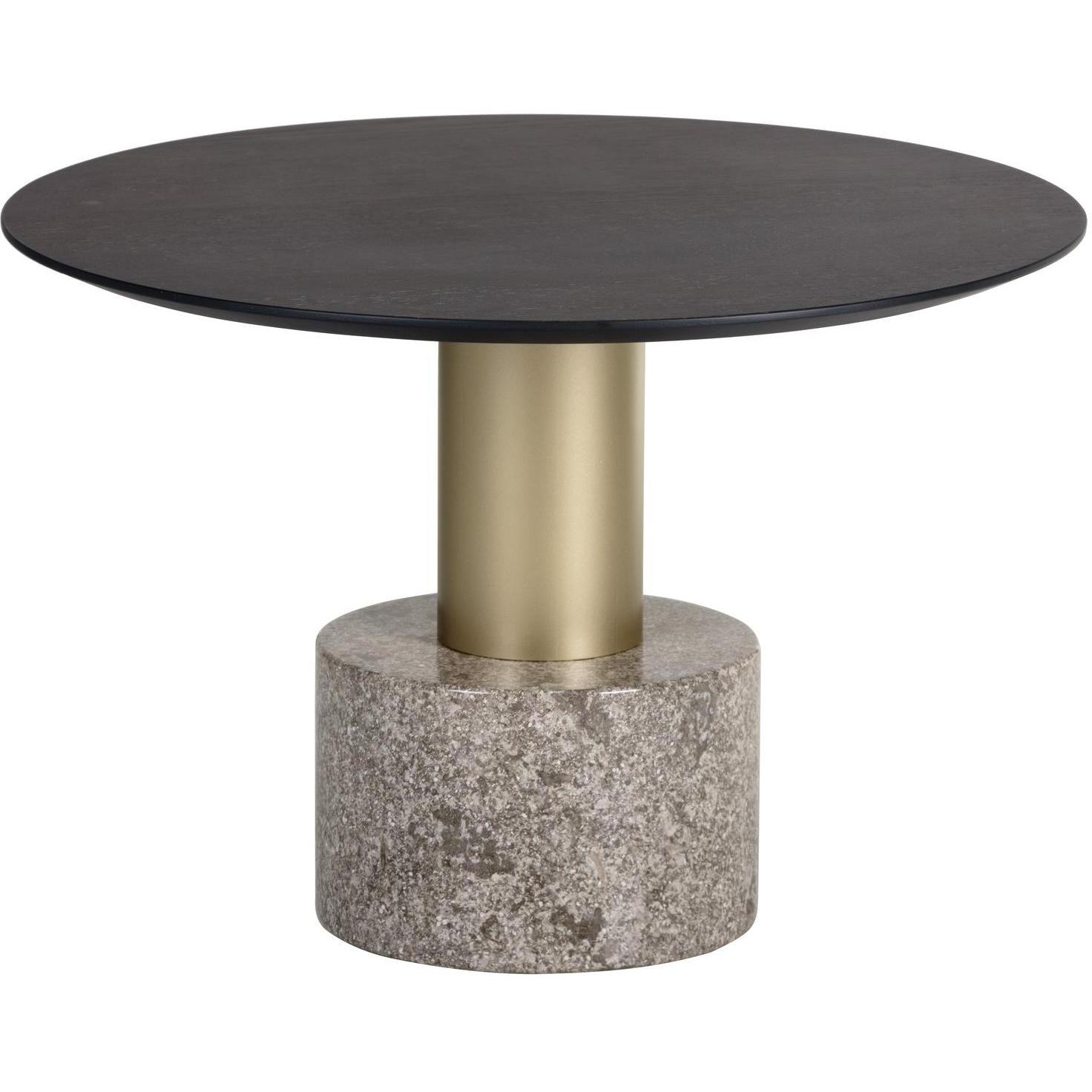 This coffee table offers a modern look with an organic feel. Features a substantial light grey marble and brushed gold iron base with a charcoal grey finished oak veneer top. Also available with a light grey marble and dark grey iron base with a raw umber finished oak veneer top. Pair with matching end table for added dimension. As marble is a natural material, unique veining, pitting, fissures, micro-cracks and colour variations are all characteristics that add to the uniqueness and beauty of each piece.