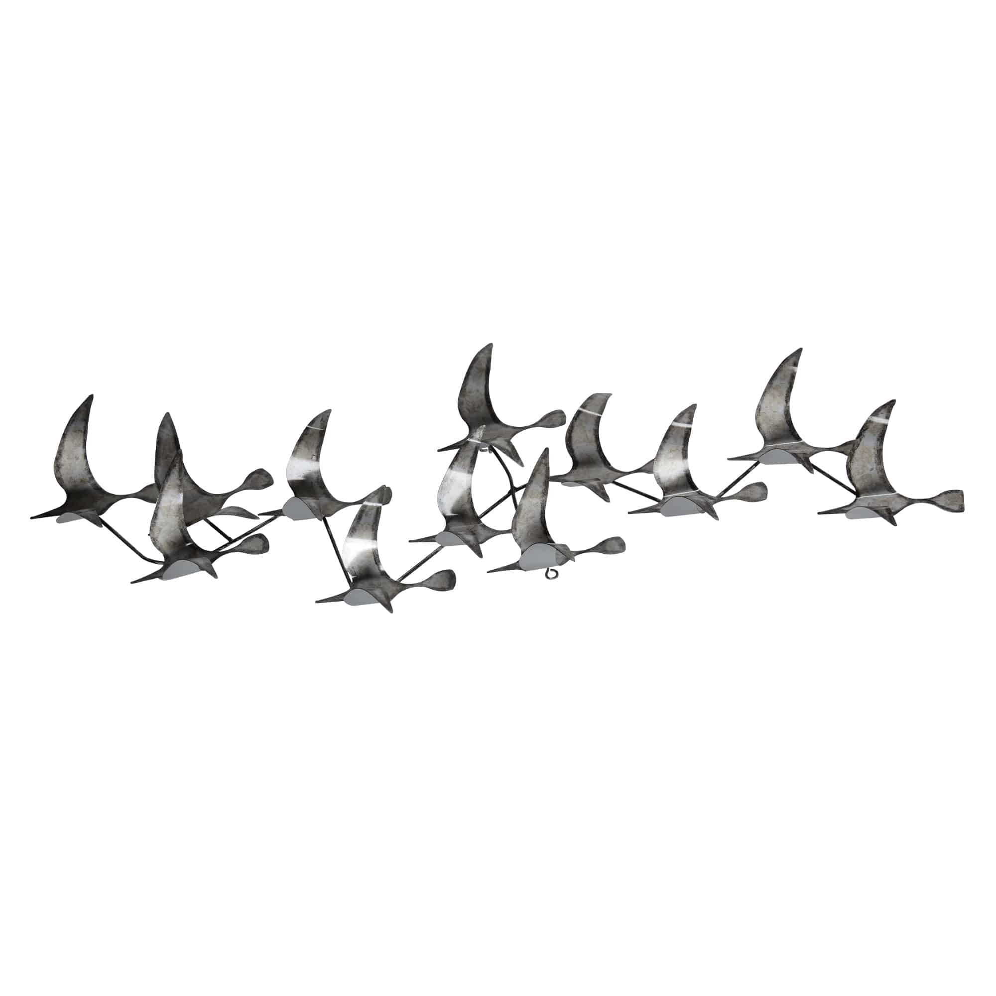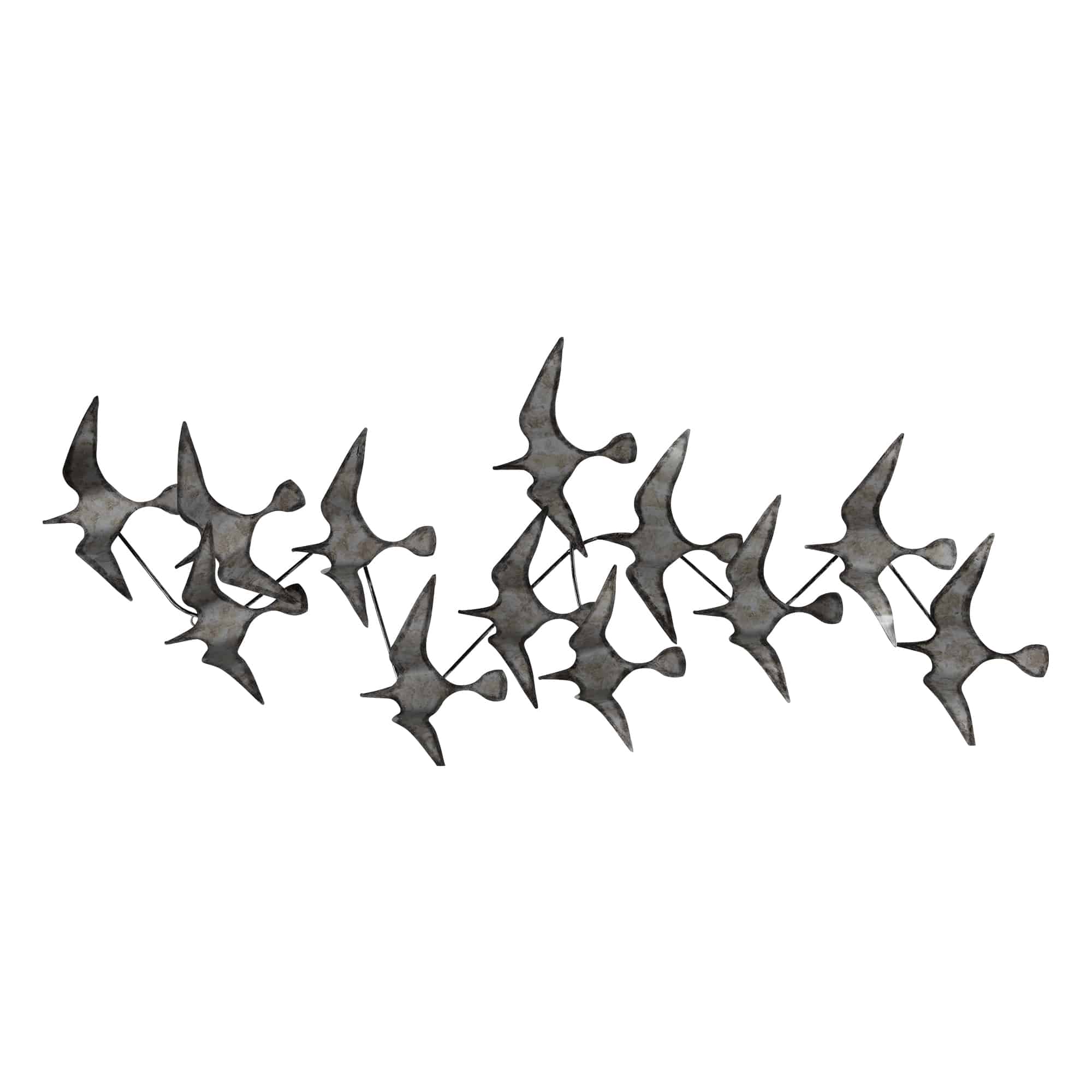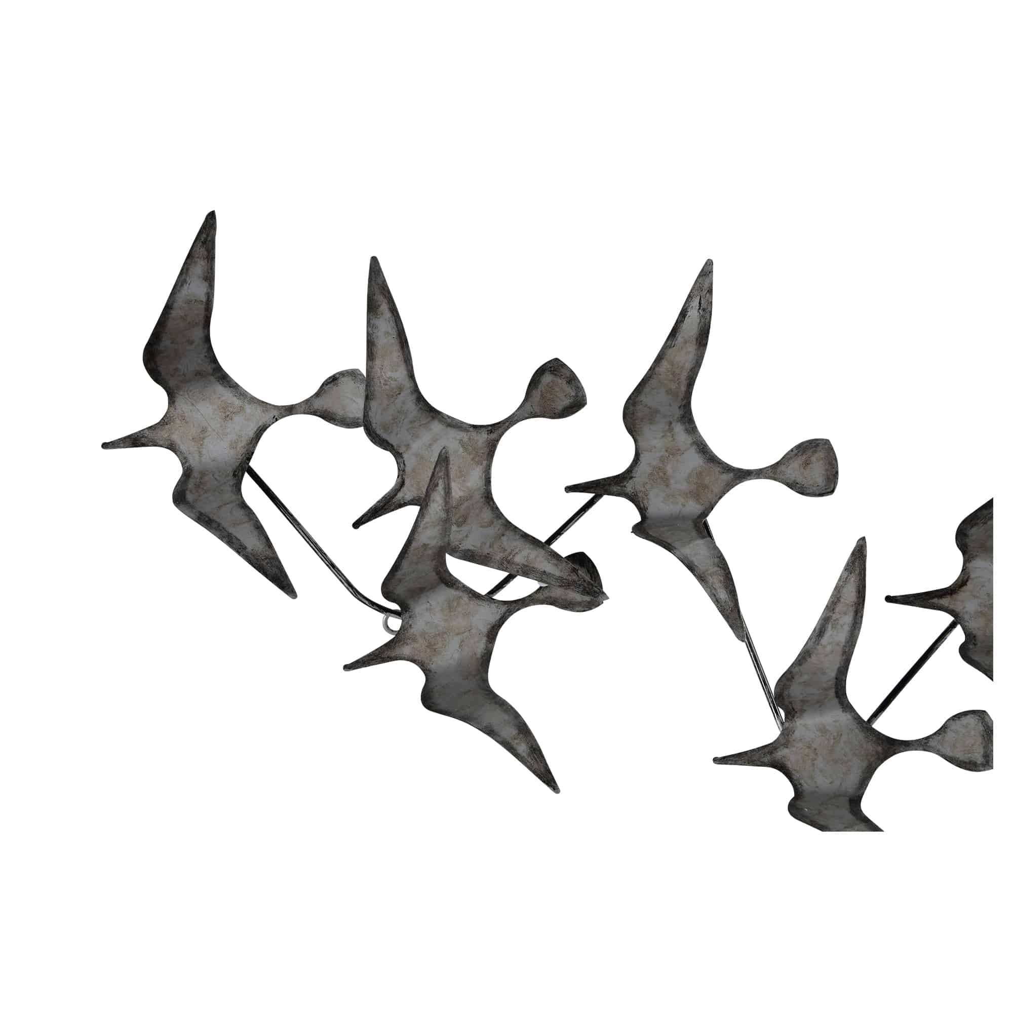 The metallic silhouette of this traditional wall decoration features a flock of birds flying in formation against an invisible wind current. Each gray bird is carefully crafted in iron and connected to the flock by a meandering iron bar that positions the avian flight pattern in place. An intriguing wall ornament over a fireplace or farmhouse-style headboard, the dynamic design of this decorative statue can be hung horizontally or vertically to visually expand the dimensions of your wall space.