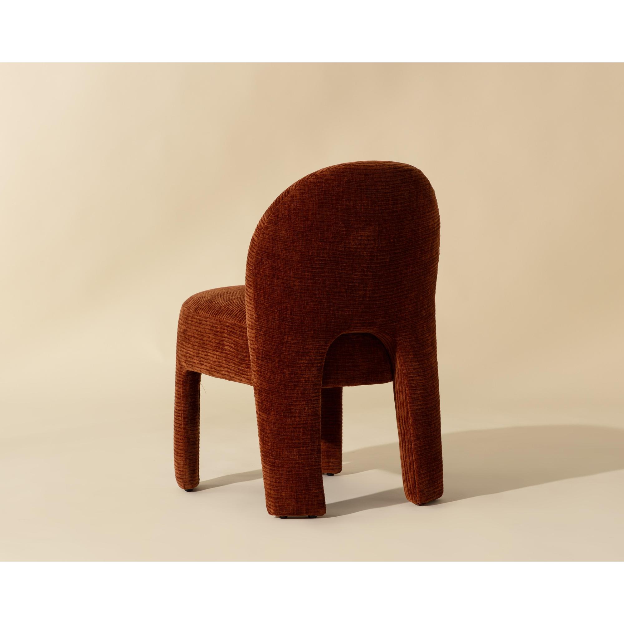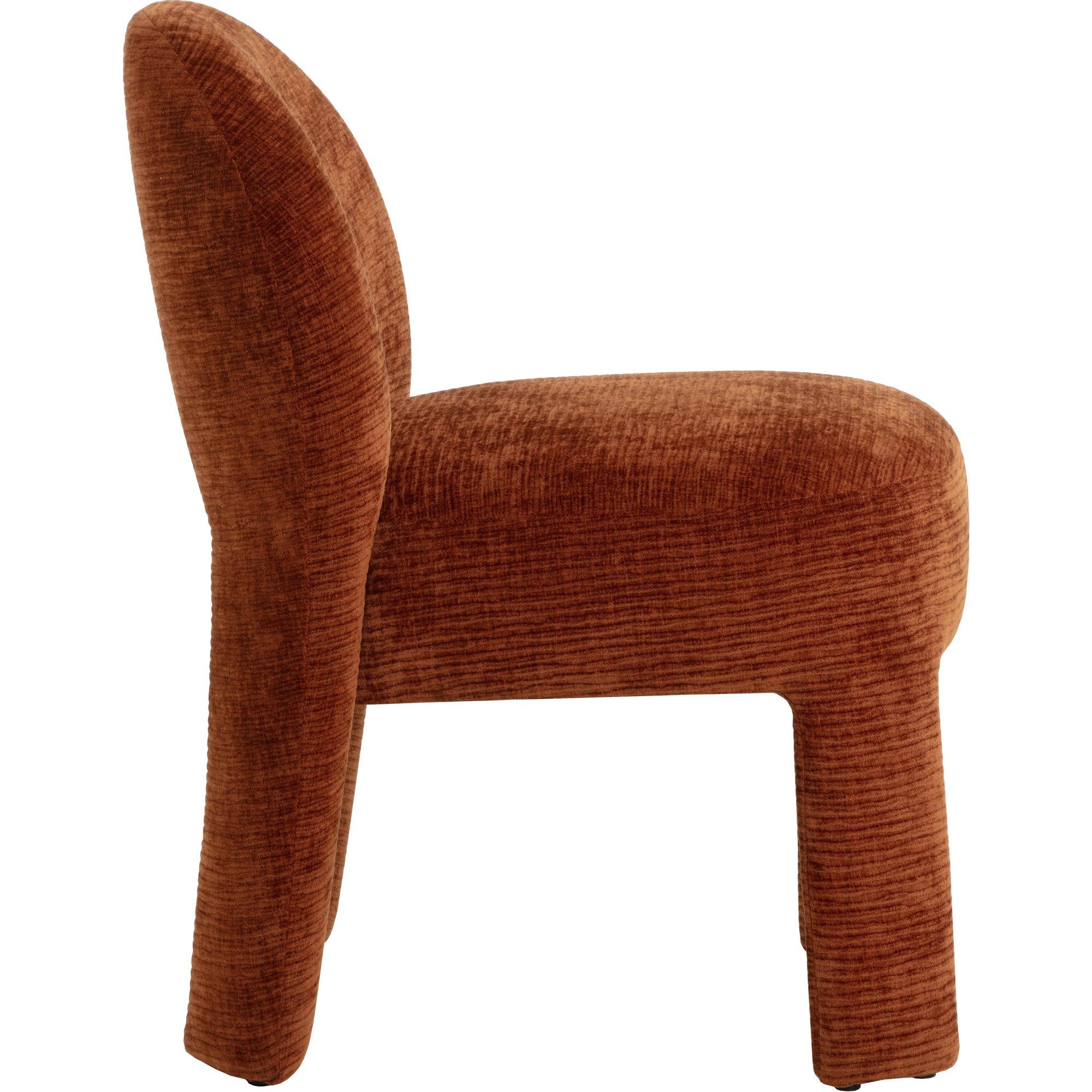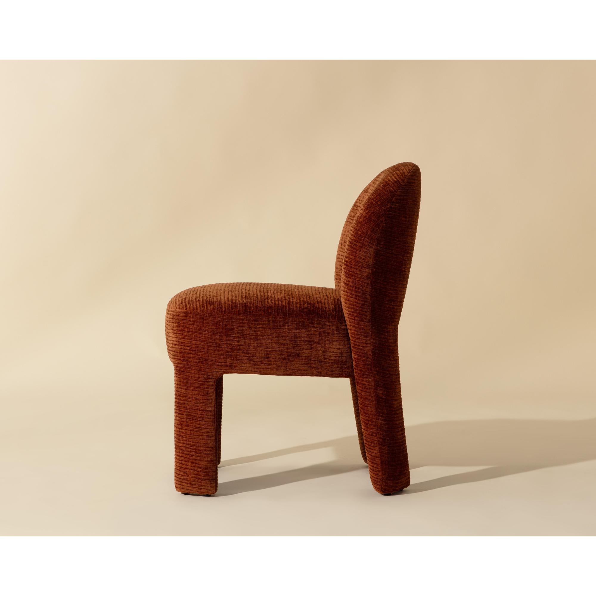 Enjoy the trendy and plush lines of the modern Myrtle Dining Chair. Artfully upholstered in rich textured opera spice performance fabric, this masterfully-built dining chair is a true meeting of style and comfort with its sleek and modern curves and contours.
