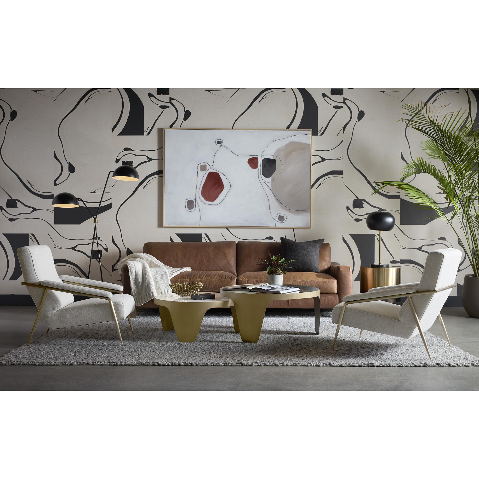 Make a statement with the modern and sculptural design of the Mysaria Nesting Coffee Tables. Features one clear glass top and one white marble top. Finished with an antique brass iron base. As marble is a natural material, unique veining, pitting, fissures, micro-cracks and colour variations are all characteristics that add to the uniqueness and beauty of each piece. Made in India. With refined craftsmanship, this design was brought to life by skilled local artisans. Due to the nature of handcraftsmanship, unique imperfections such as fissures, markings and variations in colour and shape are welcomed and appreciated characteristics for a truly one-of-a-kind piece.