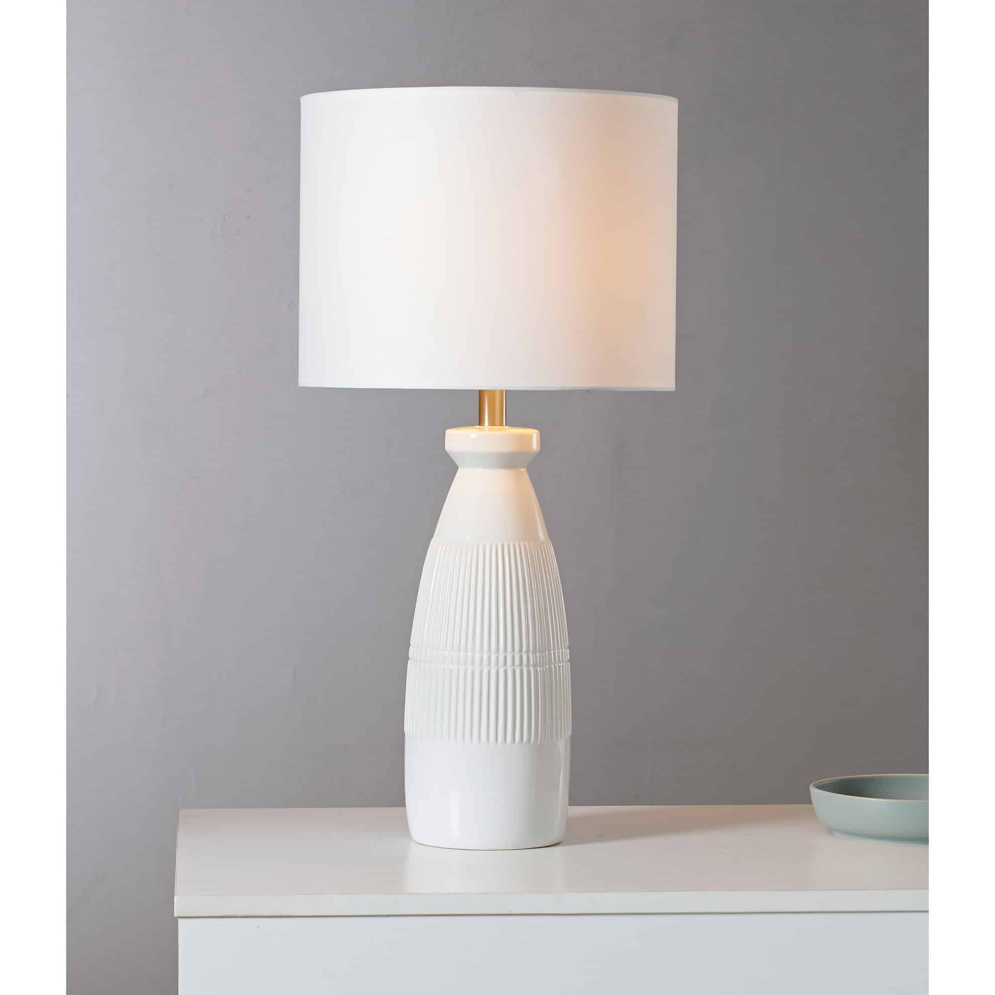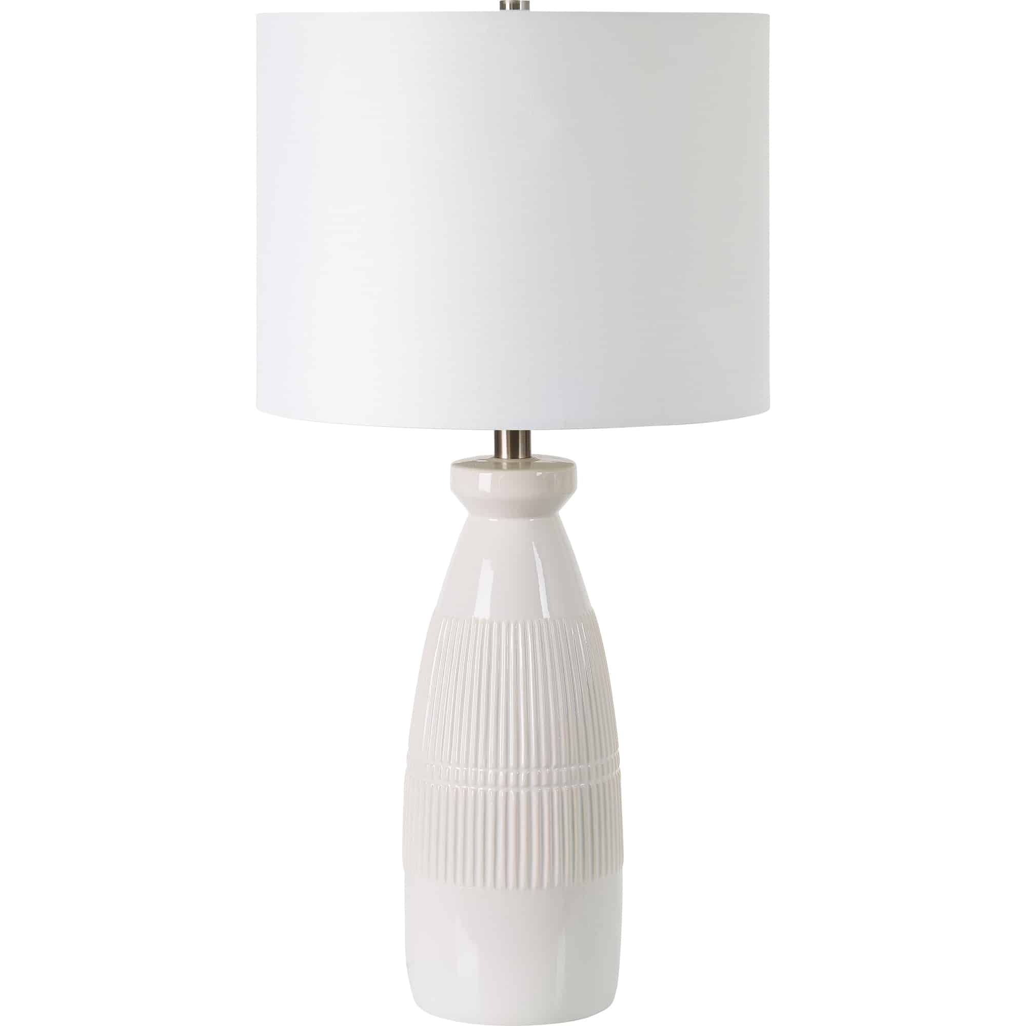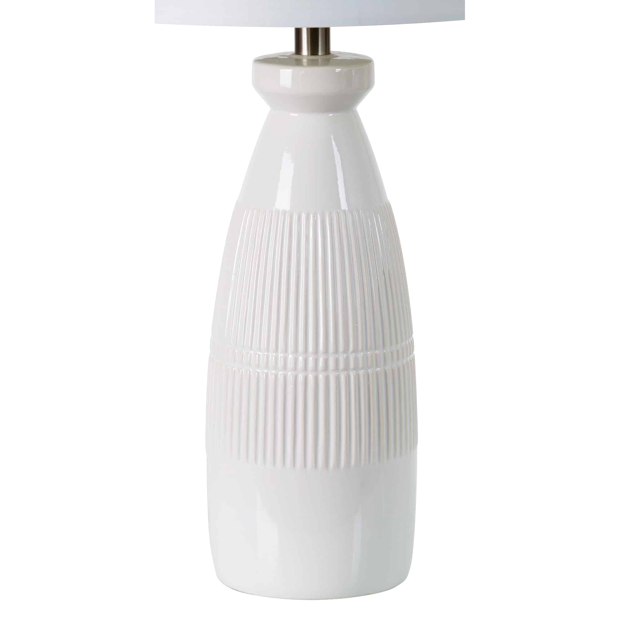 The classic interior takes on a smooth modern air when this lamp is cast in its midst. At 26.25 inches in height and 13 in width and depth, it holds grandeur in stature but also in style. The ceramic base features a gloss glaze finish with finely etched lines and is topped with an off-white cotton shade.