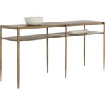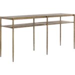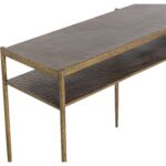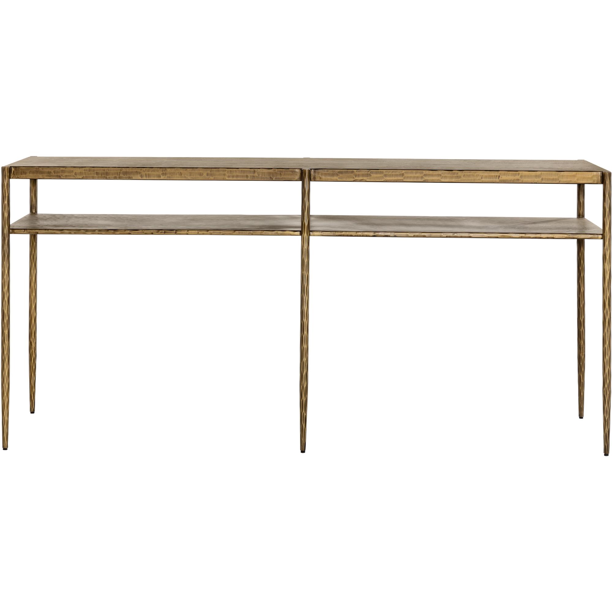 The Naini Console Table captures the essence of handcrafted artistry with its textured hand-hammered look. Its minimalist frame, made from iron with an antique brass finish, will pair well with any interior space and features an extra shelf for bonus storage space.