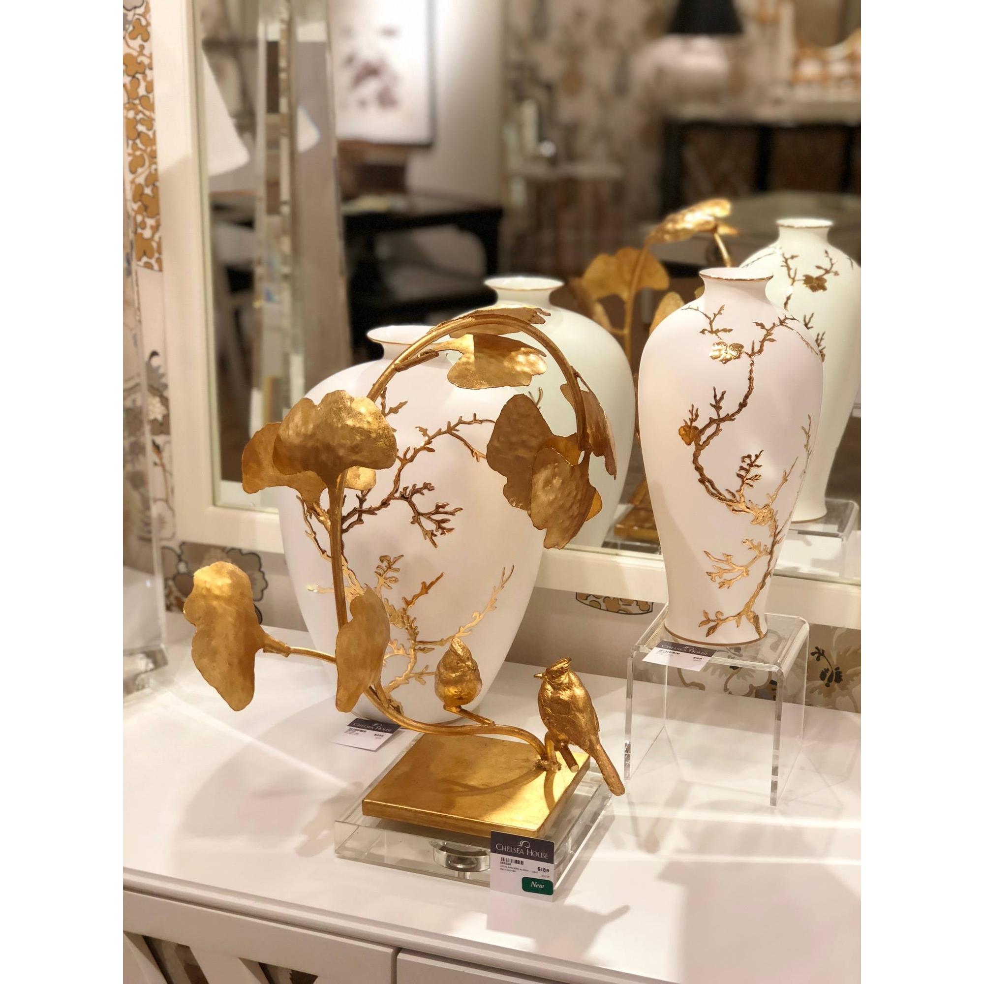 Matte white glazed porcelain vase with metallic gold hand painted cherry blossom design and trim. Vase mouth opening: 2.75w x 2d.