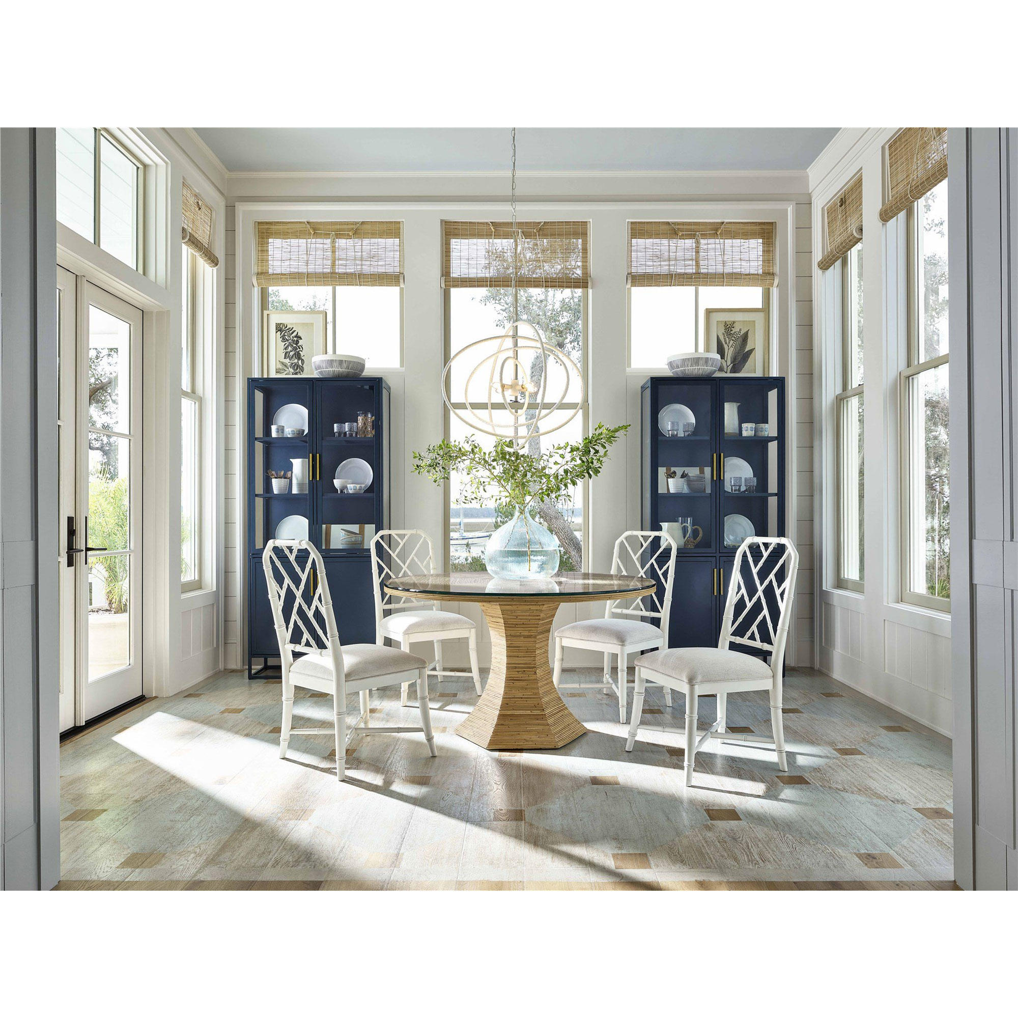 Showcasing a rounded glass top supported by a structured rattan pedestal base, the Nantucket Round Dining Table is the ideal backdrop for brunch, afternoon tea, happy hour cocktails, and more.