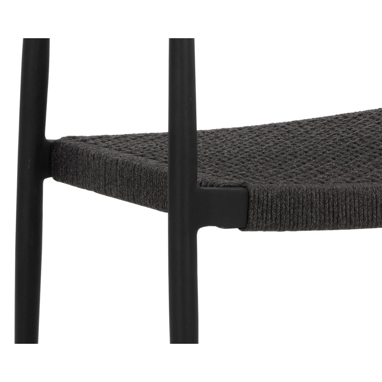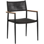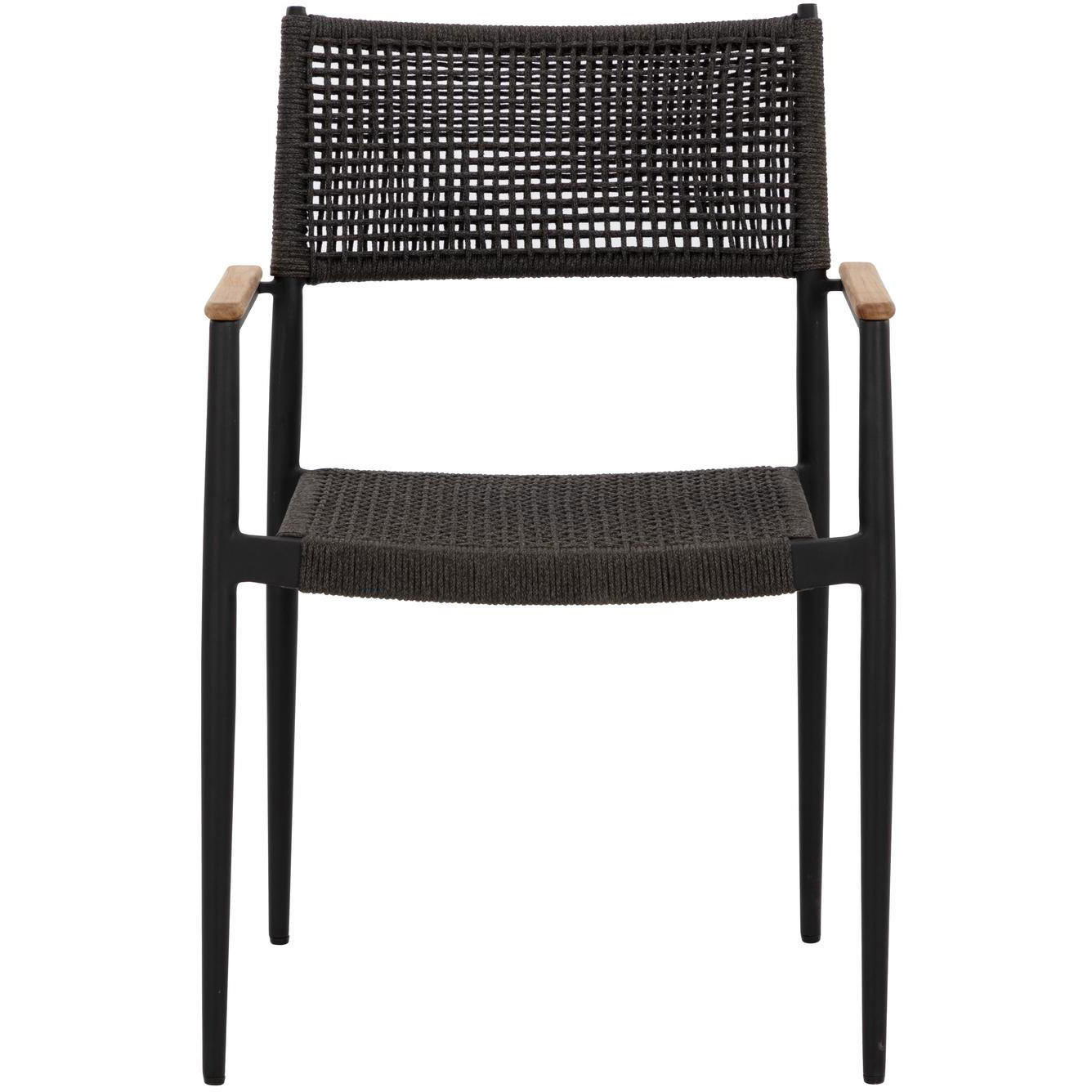 The Nava Stackable Dining Armchair boasts a light and airy design that will resonate in any space. Features solid teak wood detailing on the armrests paired with a black powder-coated aluminum frame. Completed with a dark greymix rope weave on the seat and backrest. Suitable for indoor and covered outdoor spaces.