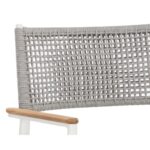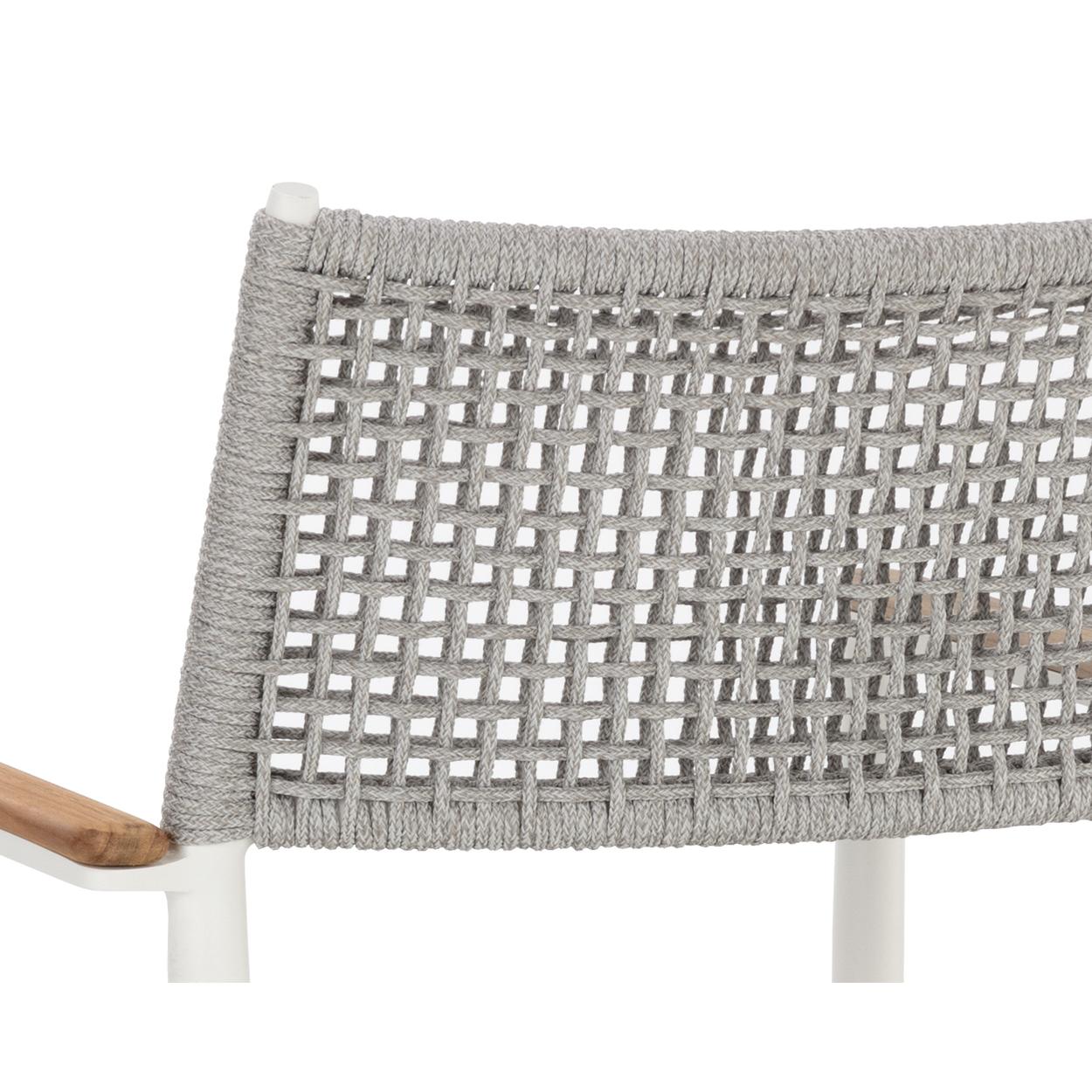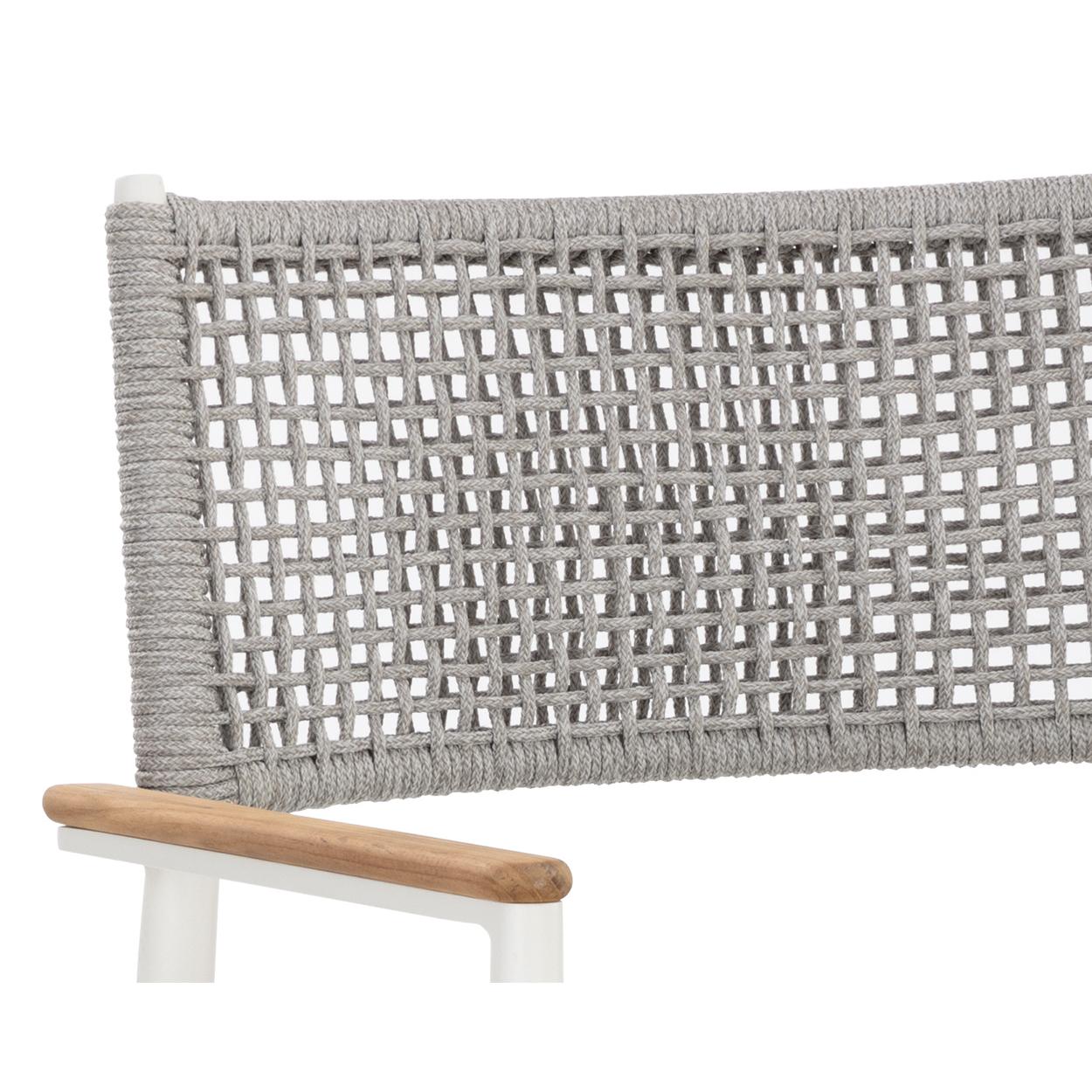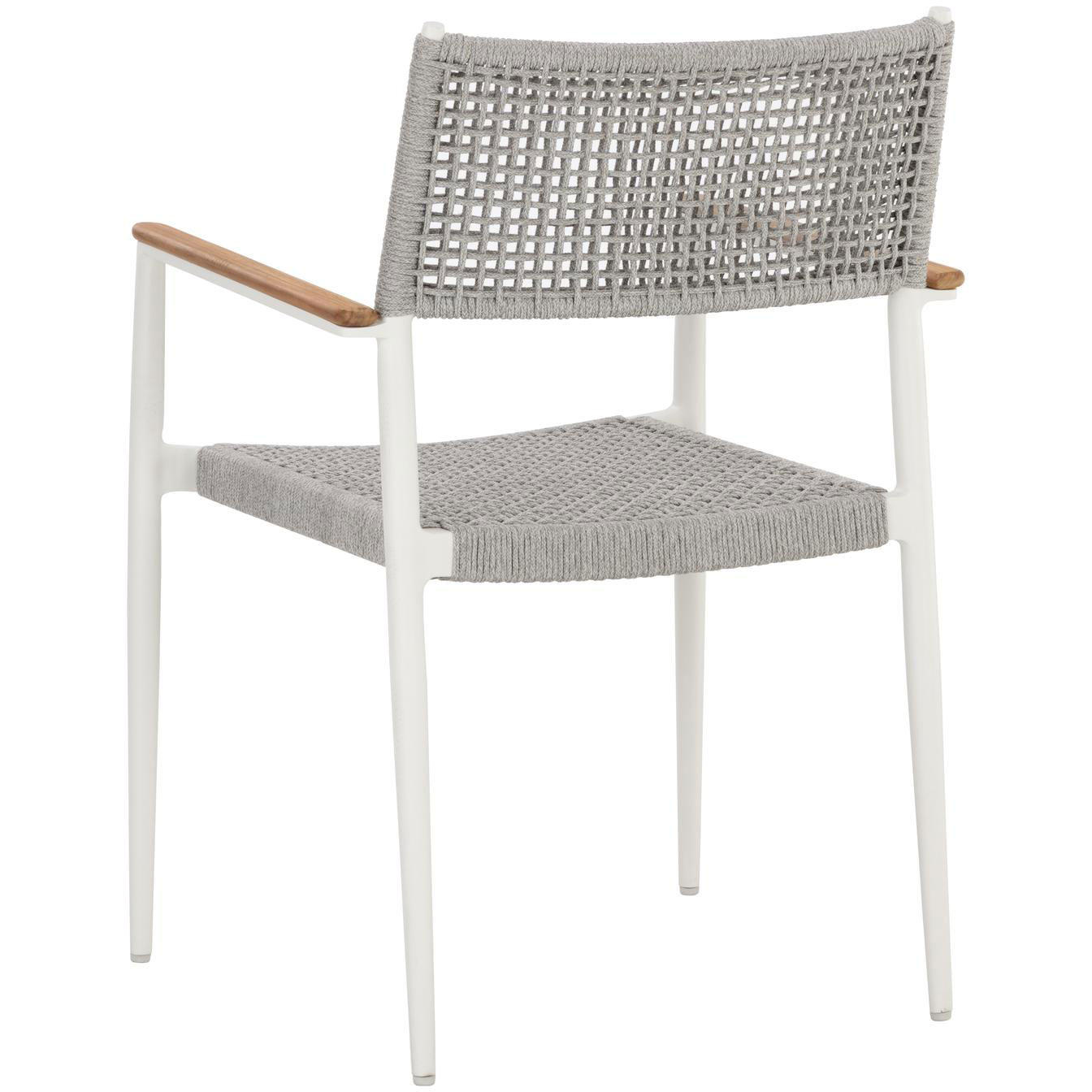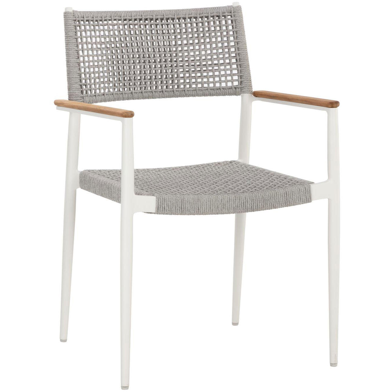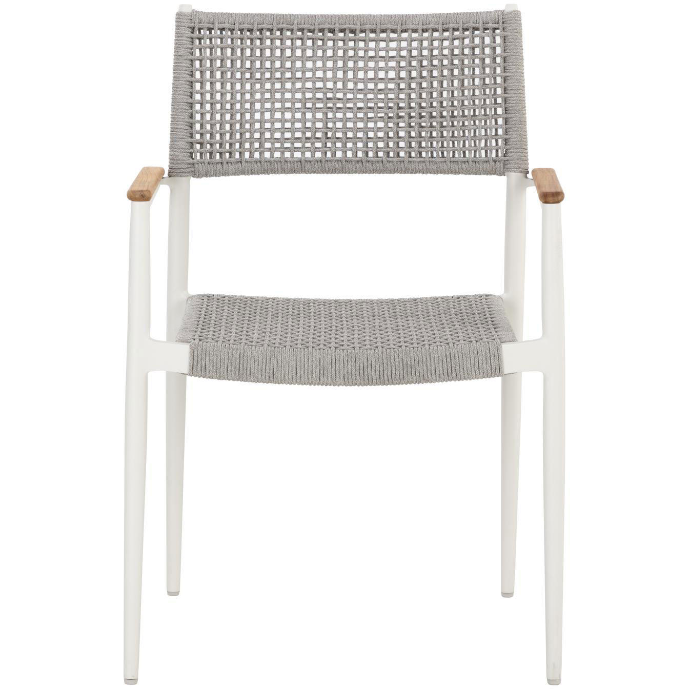 The Nava Stackable Dining Armchair boasts a light and airy design that will resonate in any space. Features solid teak wood detailing on the armrests paired with a white powder-coated aluminum frame. Completed with a greymix rope weave on the seat and backrest. Suitable for indoor and covered outdoor spaces.