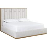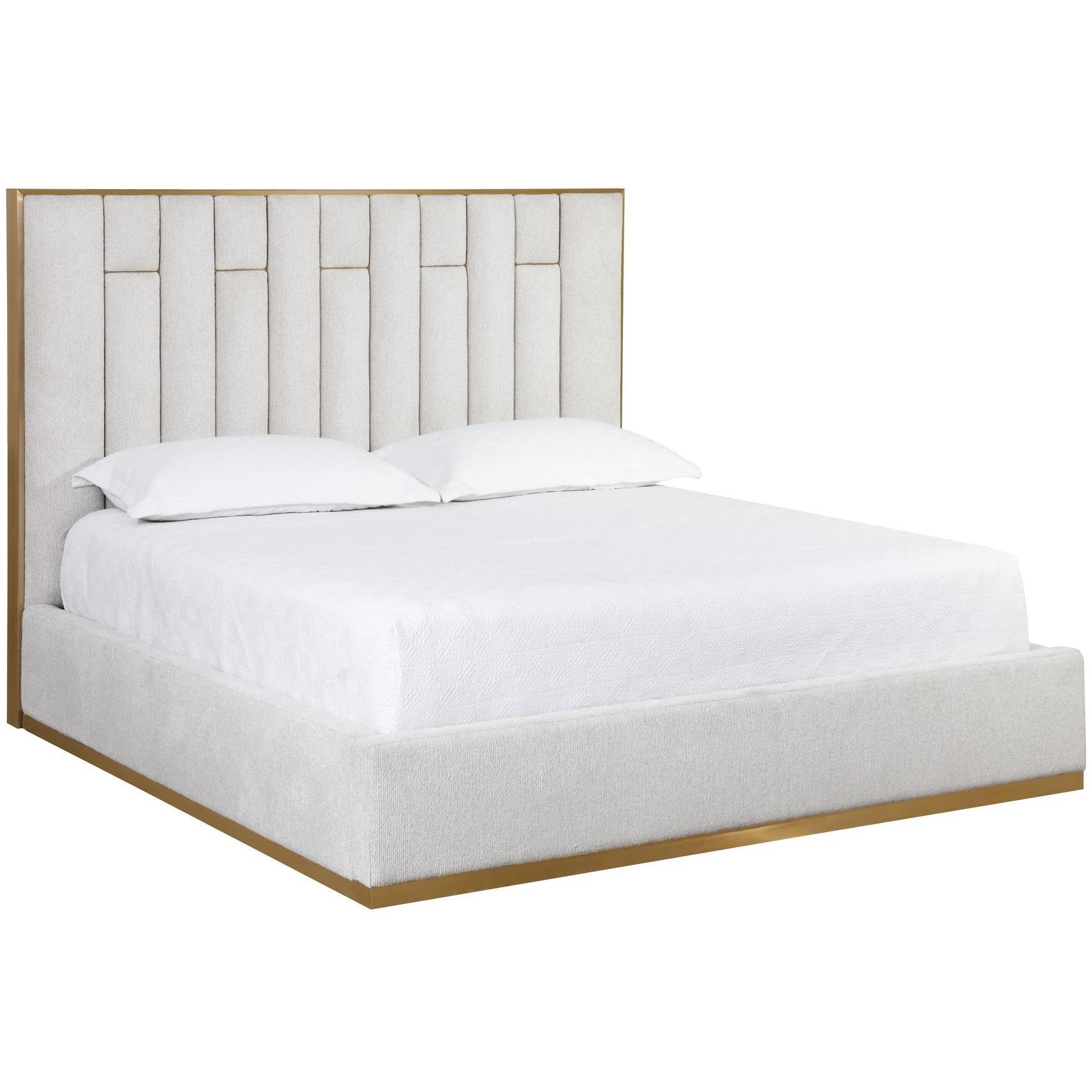 Understated modern elegance meets minimal design in the Nemu Bed. Beautifully upholstered in rhea light barley fabric with a gold stainless steel base. Metal inlay and channel detailing on the headboard elevate the look. No box spring is required and folding slats are included.