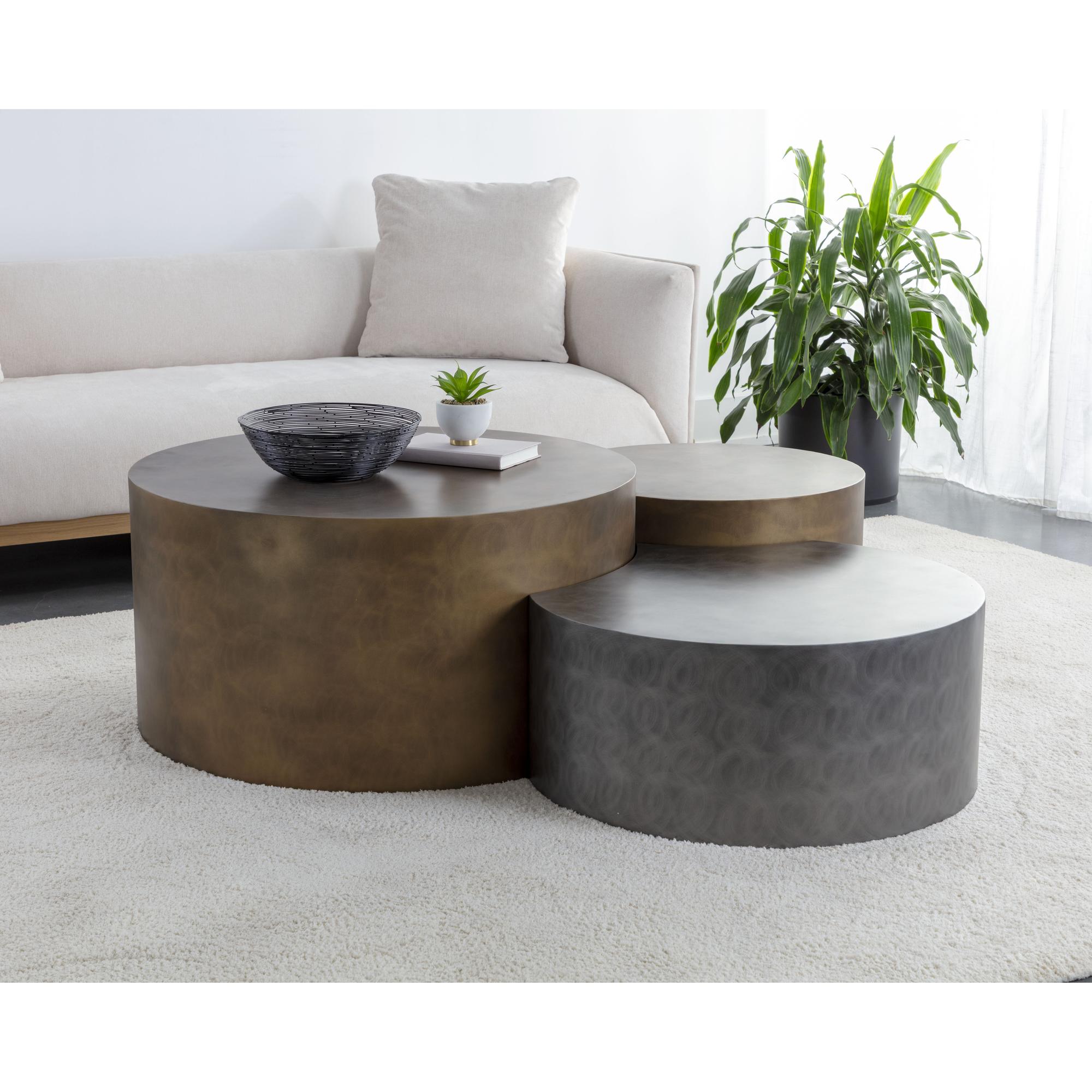 Add ultra contemporary appeal to various spaces with the stunning Neo Coffee Tables. Comprised of three metal pieces designed to fit together at staggered heights and in varying antique brass and nickel finishes. Each table top has a handmade swirl pattern that is unique to each piece and will vary. Function and dimension at its finest. All three pieces sold as a set Made in India. With refined craftsmanship, this design was brought to life by skilled local artisans. Due to the nature of handcraftsmanship, unique imperfections such as fissures, markings and variations in colour and shape are welcomed and appreciated characteristics for a truly one-of-a-kind piece.