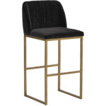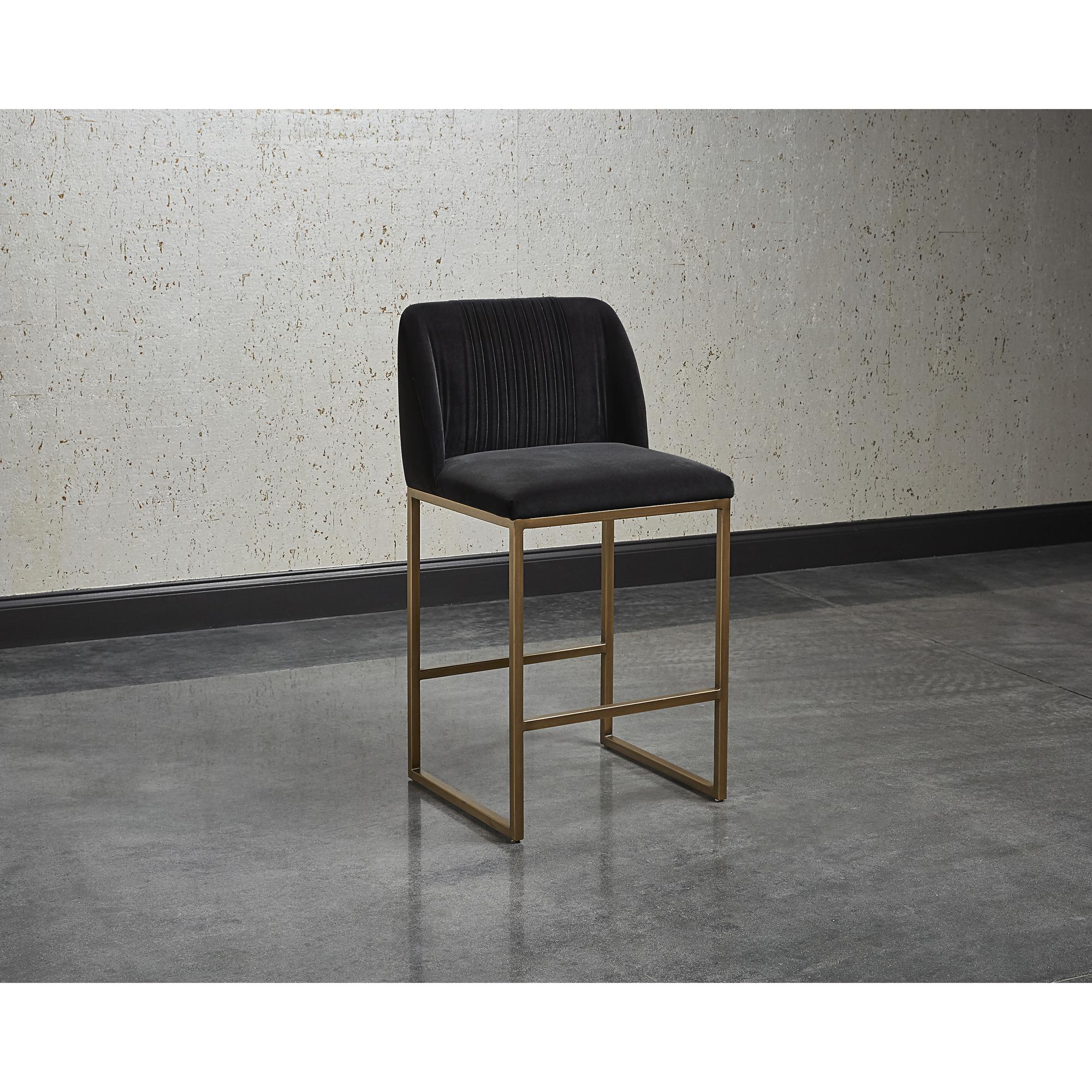 A modern counter stool that offers style and comfort. Features delicate ruching on the rounded seatback and exposed antique brass legs. Stocked in shadow grey fabric. Suitable for various dining, kitchen and bar spaces of all sizes.