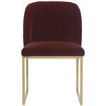 A modern dining chair that offers style and comfort. Features delicate ruching on the rounded seatback and exposed antique brass legs. Stocked in merlot fabric.
