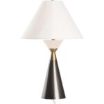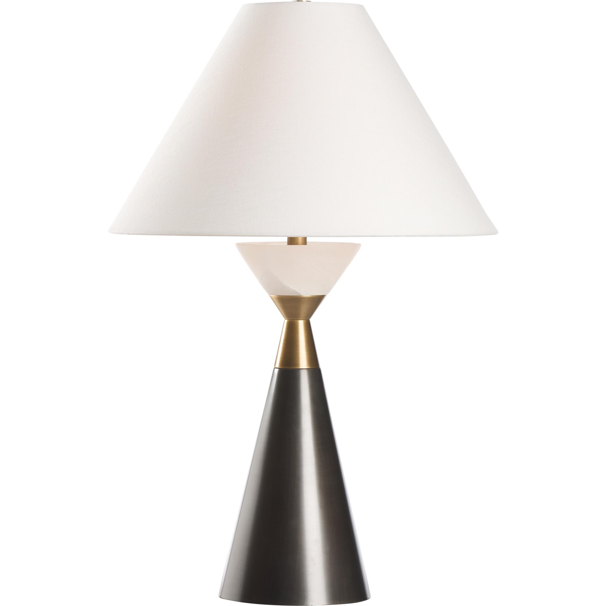A study in balance and contrast, this striking table lamp pairs sculptural form with refined materials. A tapered metal base in a rich dark finish is accented by warm brass details and topped with a luminous alabaster ring that softly diffuses light. The natural stone element adds an elegant, organic touch, while the crisp white shade completes the look with timeless sophistication.