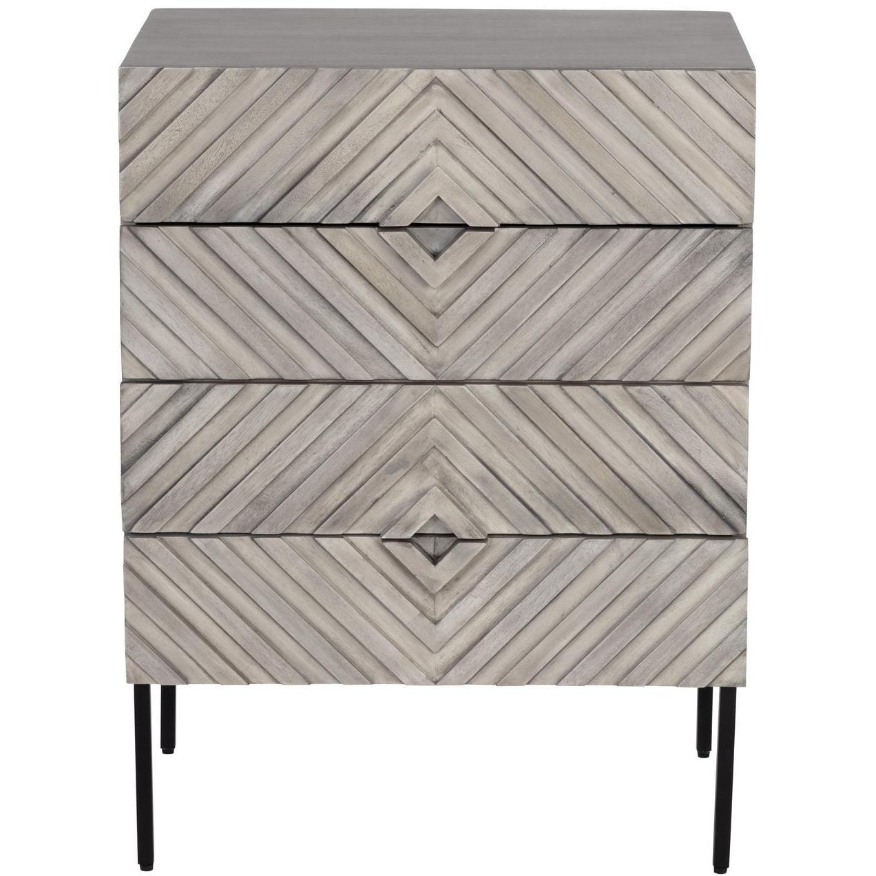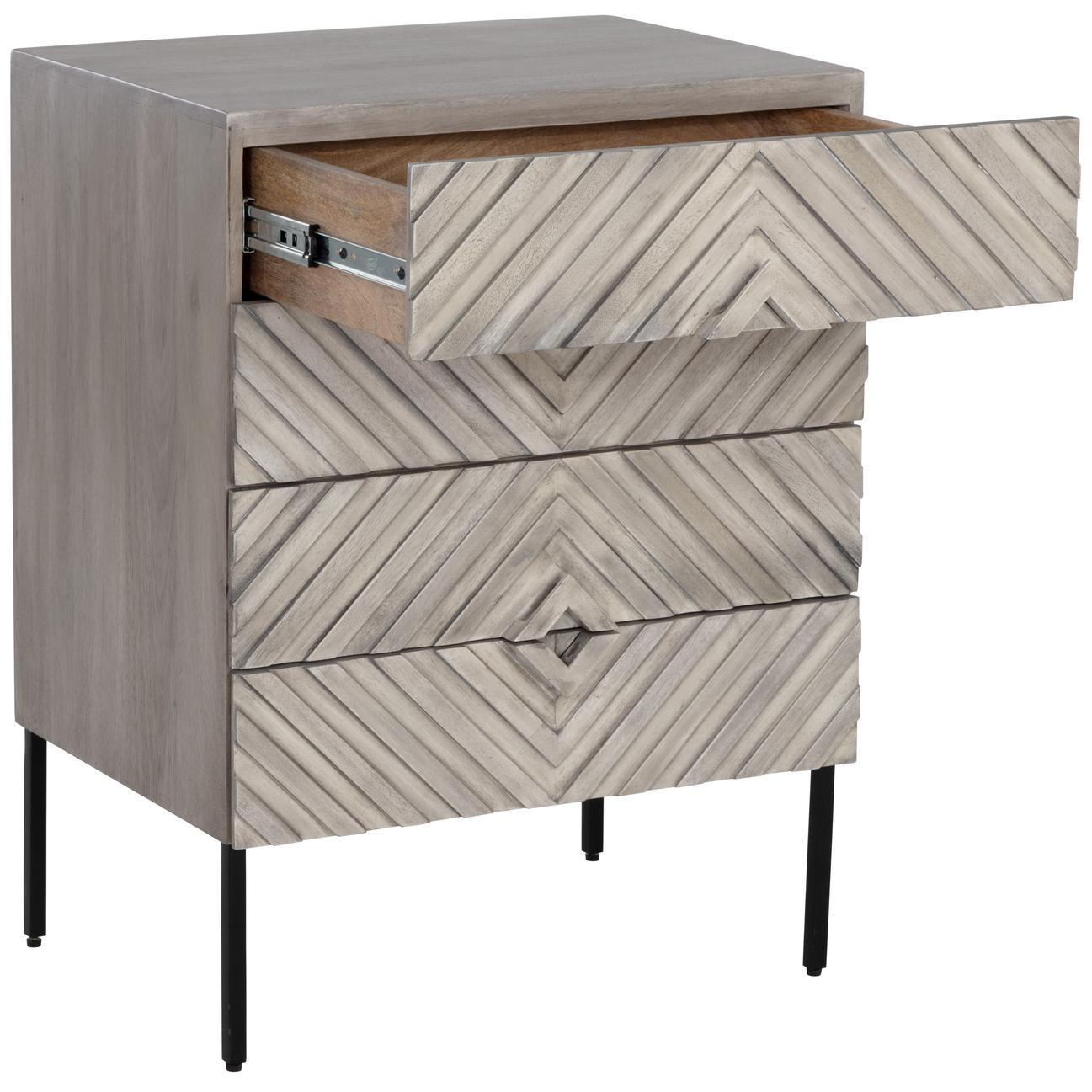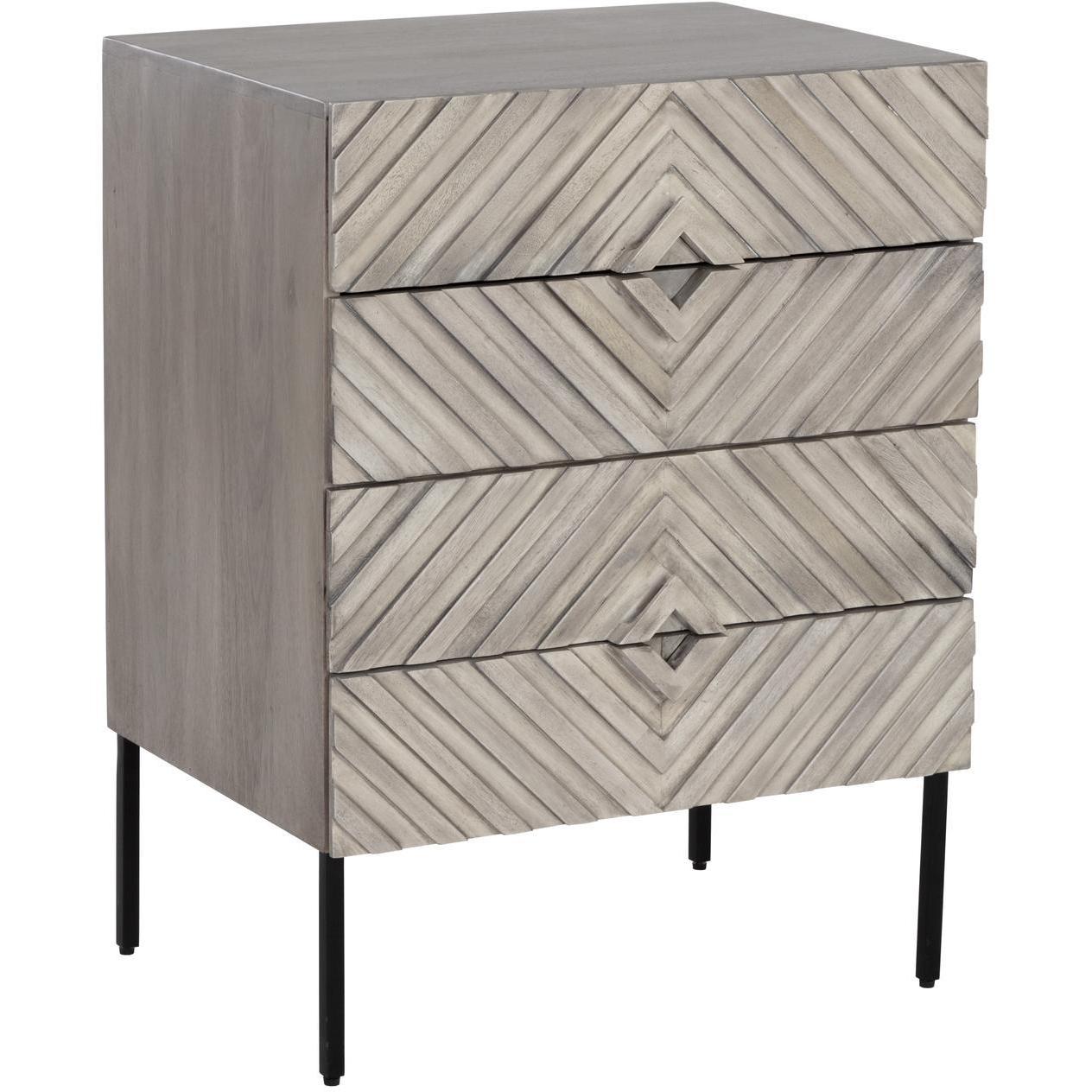 Incorporate an exotic touch to any bedroom space with this nightstand that is inspired by global travels. Made with grey solid mango wood with a hand crafted chevron pattern. Includes four drawers and completed with a black powder coated steel base. Made in India: With refined craftsmanship, this design was brought to life by skilled local artisans. By nature, these materials develop unique imperfections such as fissures, markings and colour variations for a truly one-of-a-kind piece. As wood is an organic, porous material, these pieces will contain natural variation of texture and may also exhibit fine indentations and cracks. Wood pieces will also display a disparity of colour and grain, and visible knots and burls that add to the character of each piece.