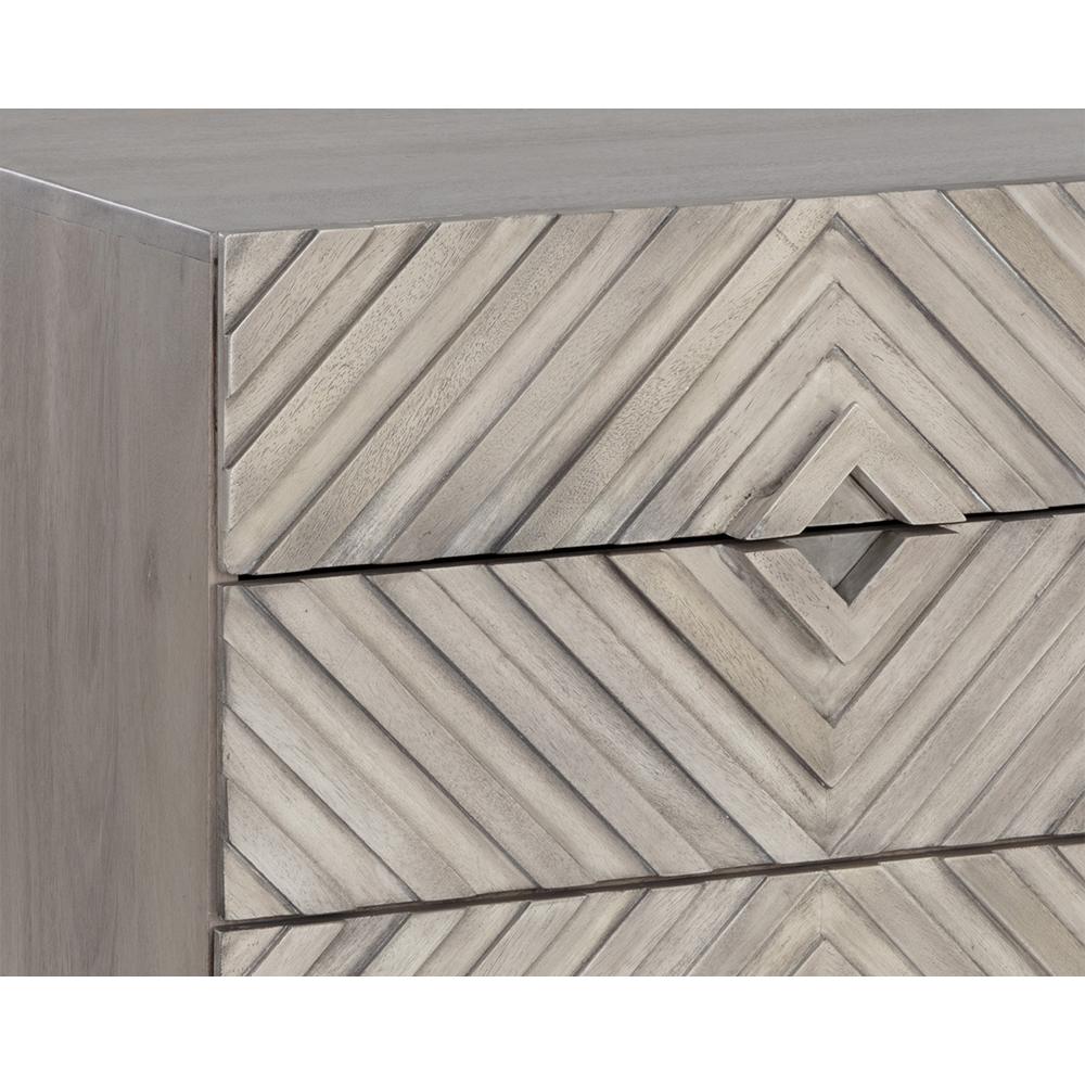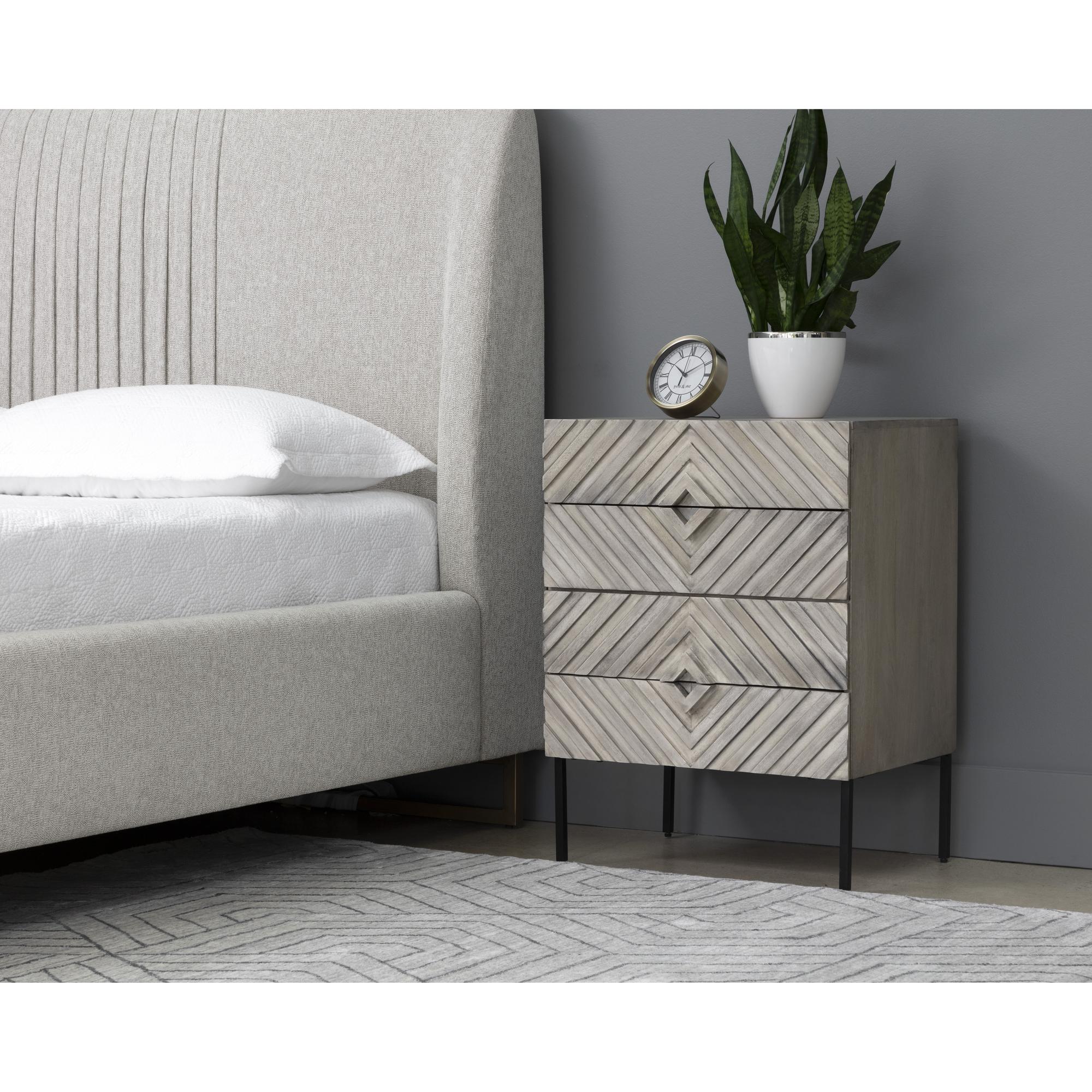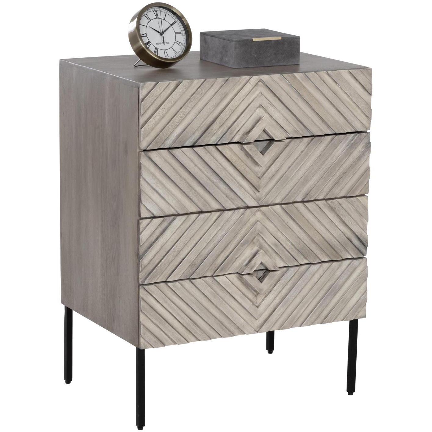 Incorporate an exotic touch to any bedroom space with this nightstand that is inspired by global travels. Made with grey solid mango wood with a hand crafted chevron pattern. Includes four drawers and completed with a black powder coated steel base. Made in India: With refined craftsmanship, this design was brought to life by skilled local artisans. By nature, these materials develop unique imperfections such as fissures, markings and colour variations for a truly one-of-a-kind piece. As wood is an organic, porous material, these pieces will contain natural variation of texture and may also exhibit fine indentations and cracks. Wood pieces will also display a disparity of colour and grain, and visible knots and burls that add to the character of each piece.