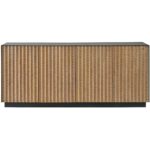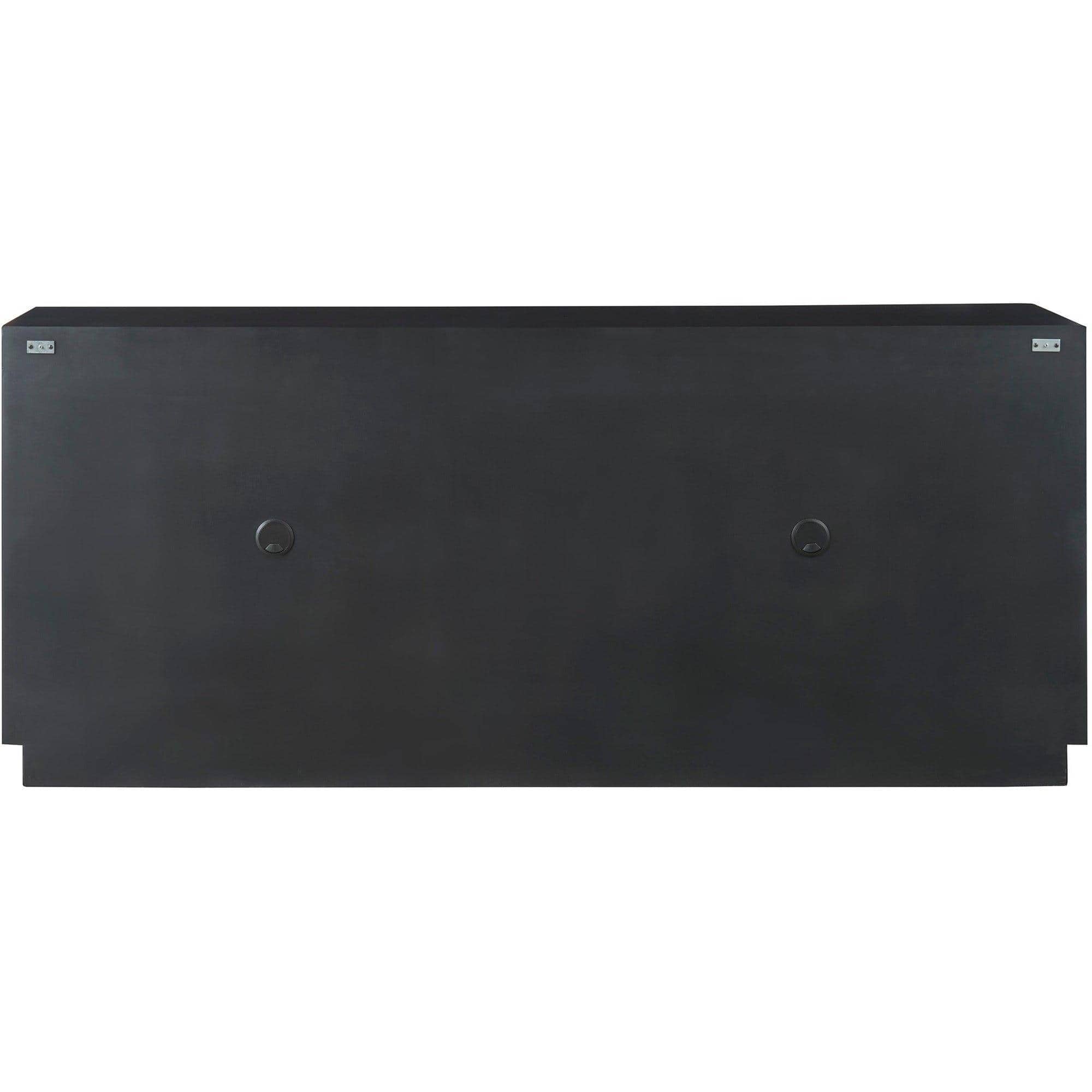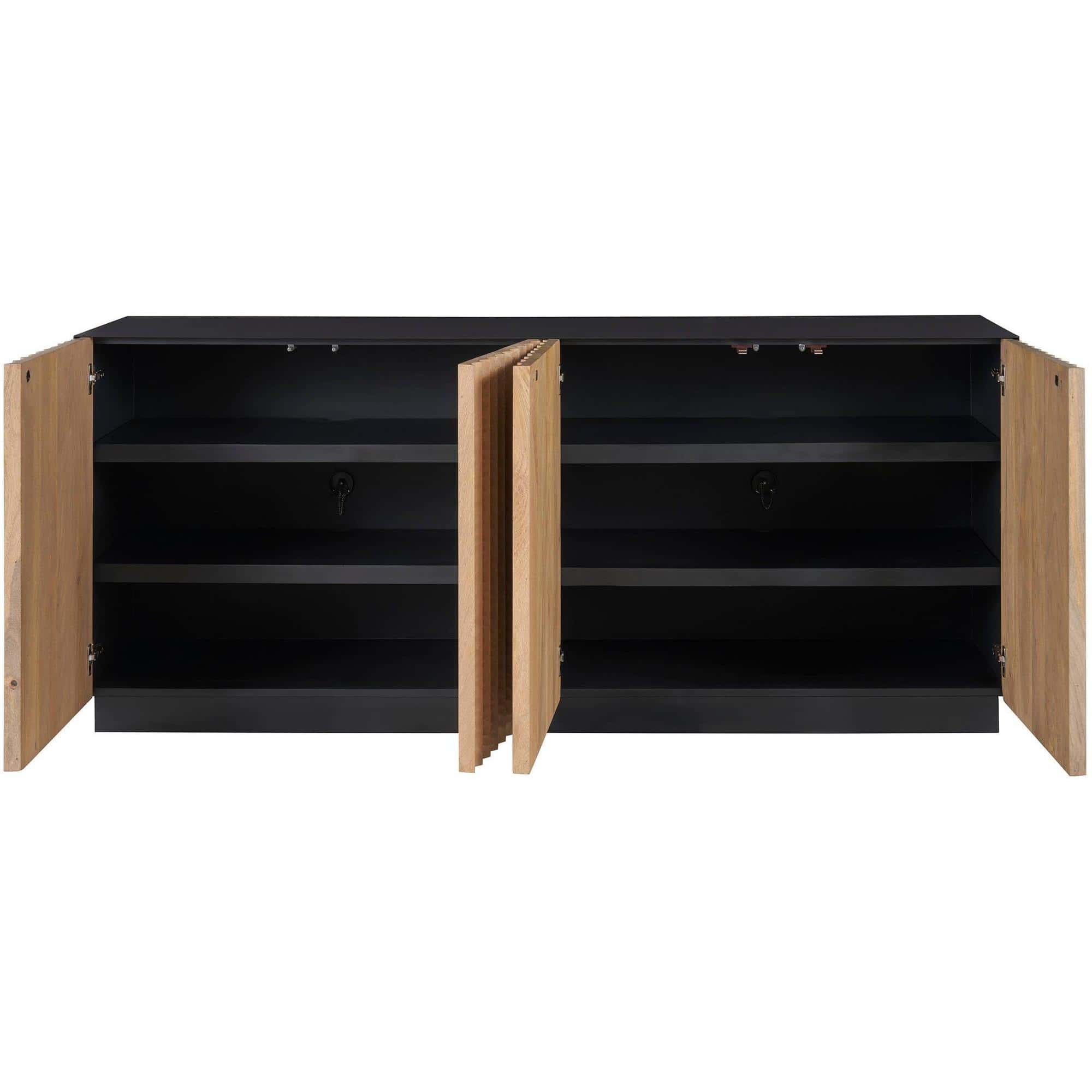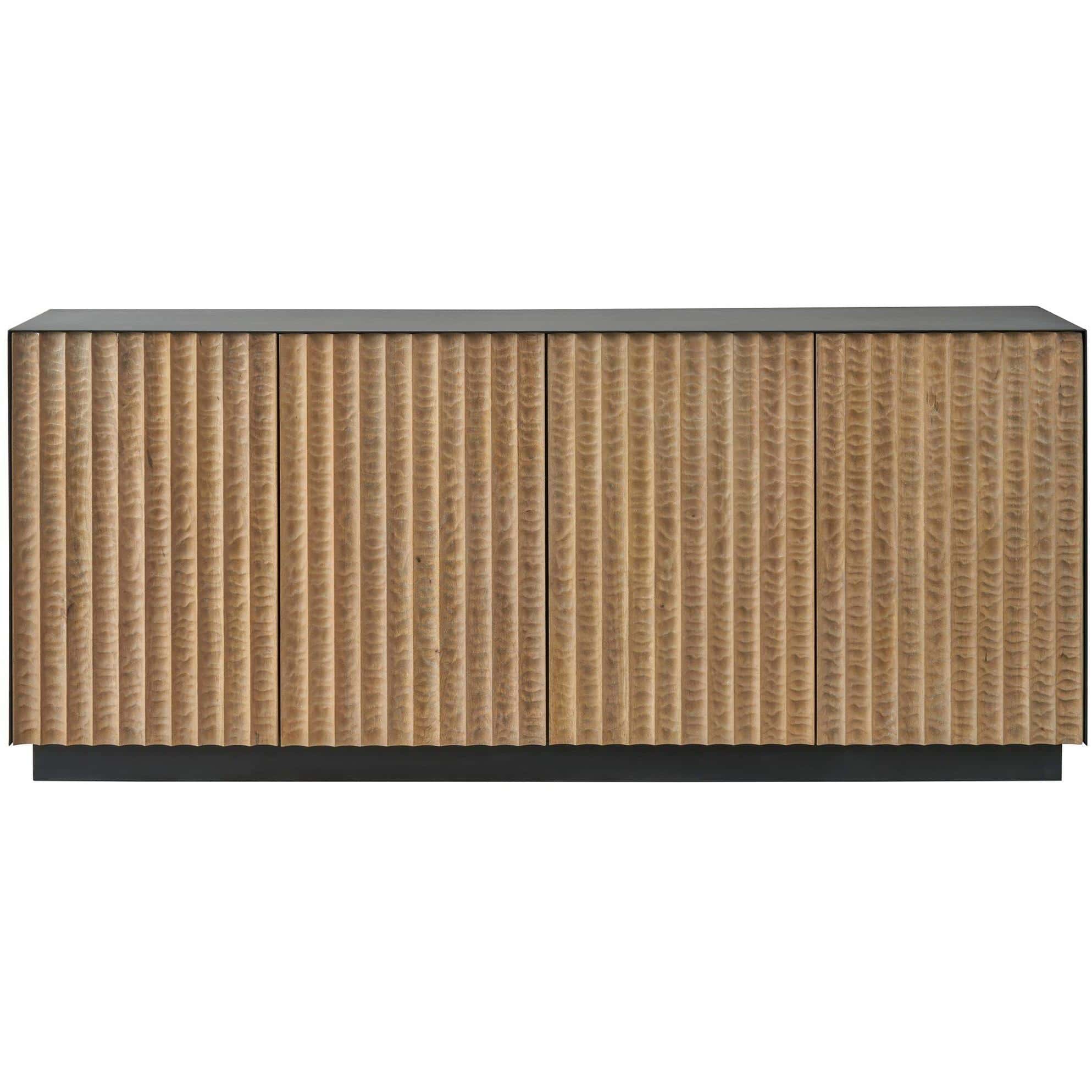 The Noir Credenza is a grand statement piece, with four intricately carved wooden doors nestled within a striking metal frame. It artfully combines whimsical touches with mid-century influences, presenting a unique interpretation of modern design that adds character and sophistication to any setting.