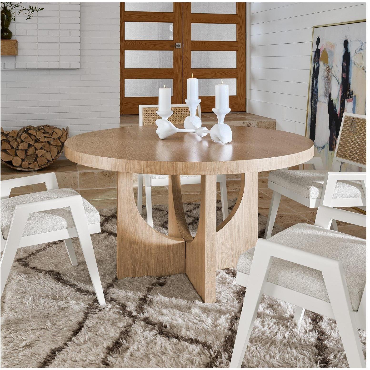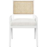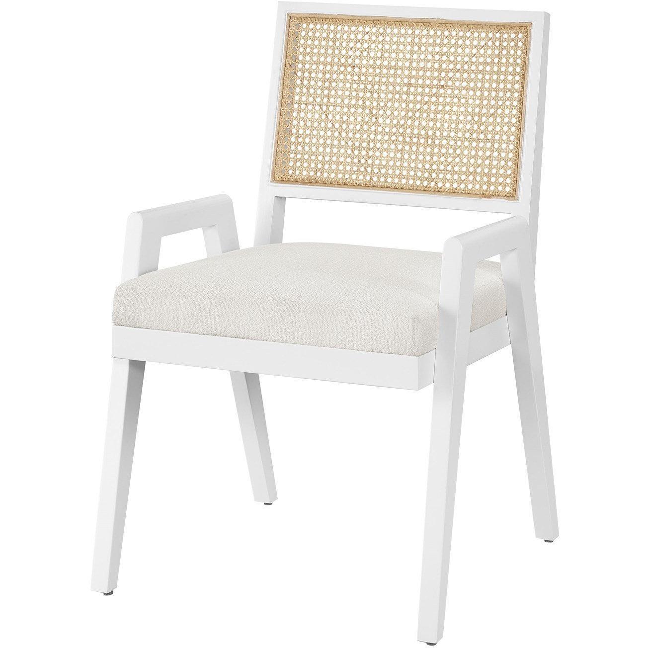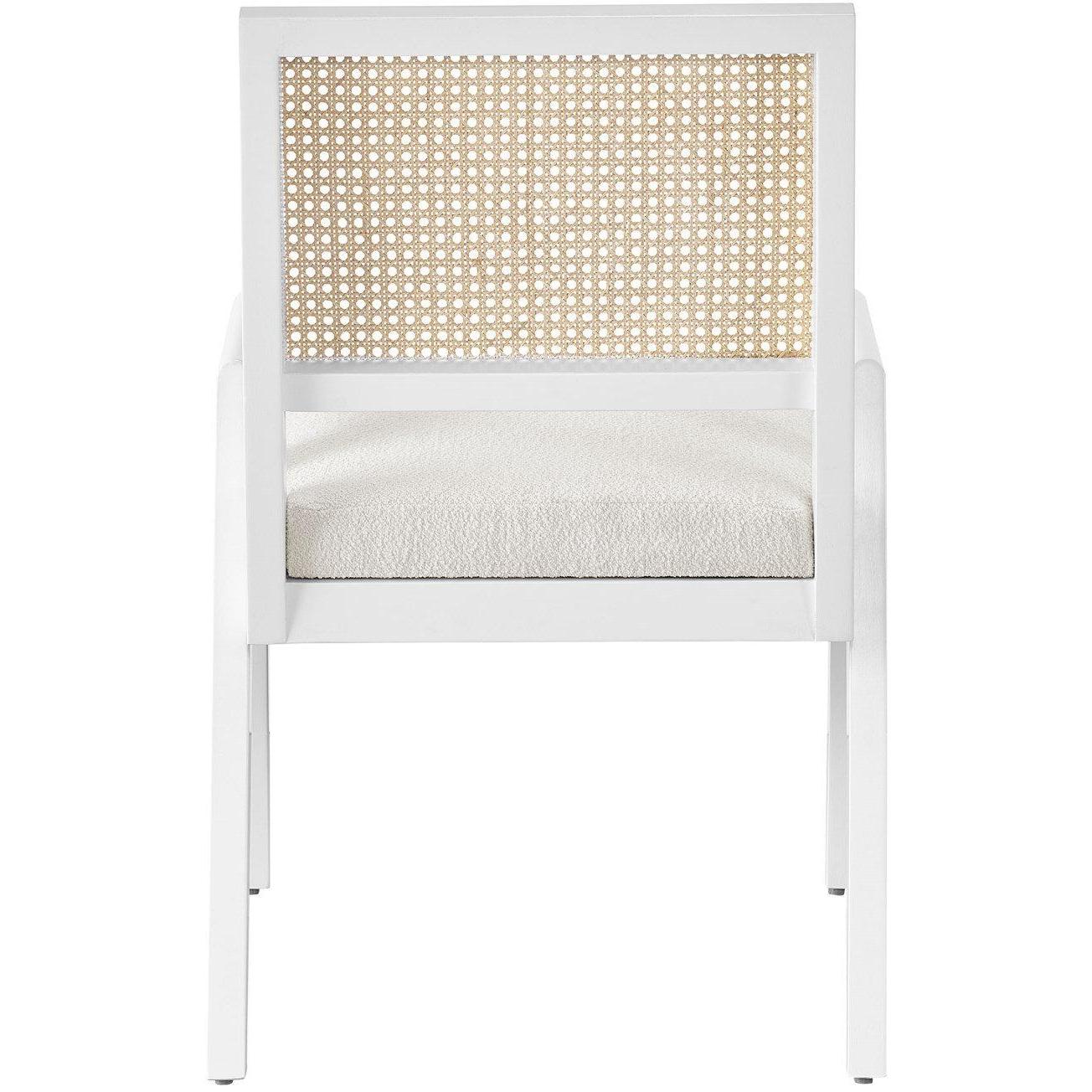 The Cane Back Arm Chair brings subtle bohemian vibes to home interiors with its striking pairing of materials, including a woven cane back, a crisp white body and a plush upholstered seat cushion.