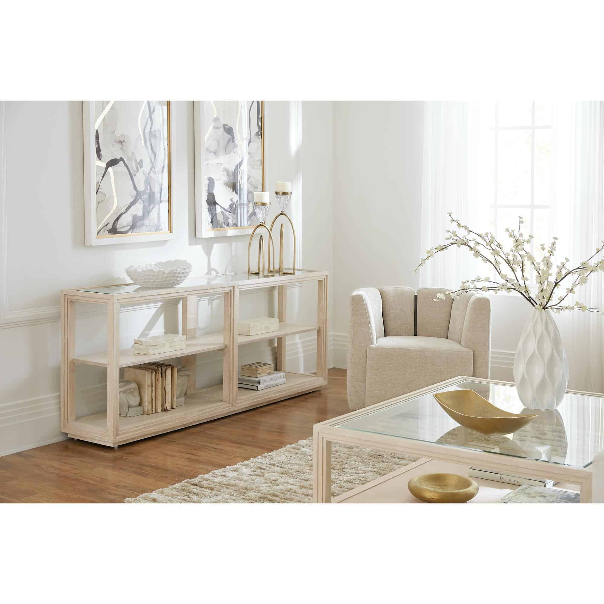 Finish: Sandstone: cathedral and quartered oak veneers with light wire brushing along with transparent and opaque stains to create this serene finish. Silver metal accent on top.