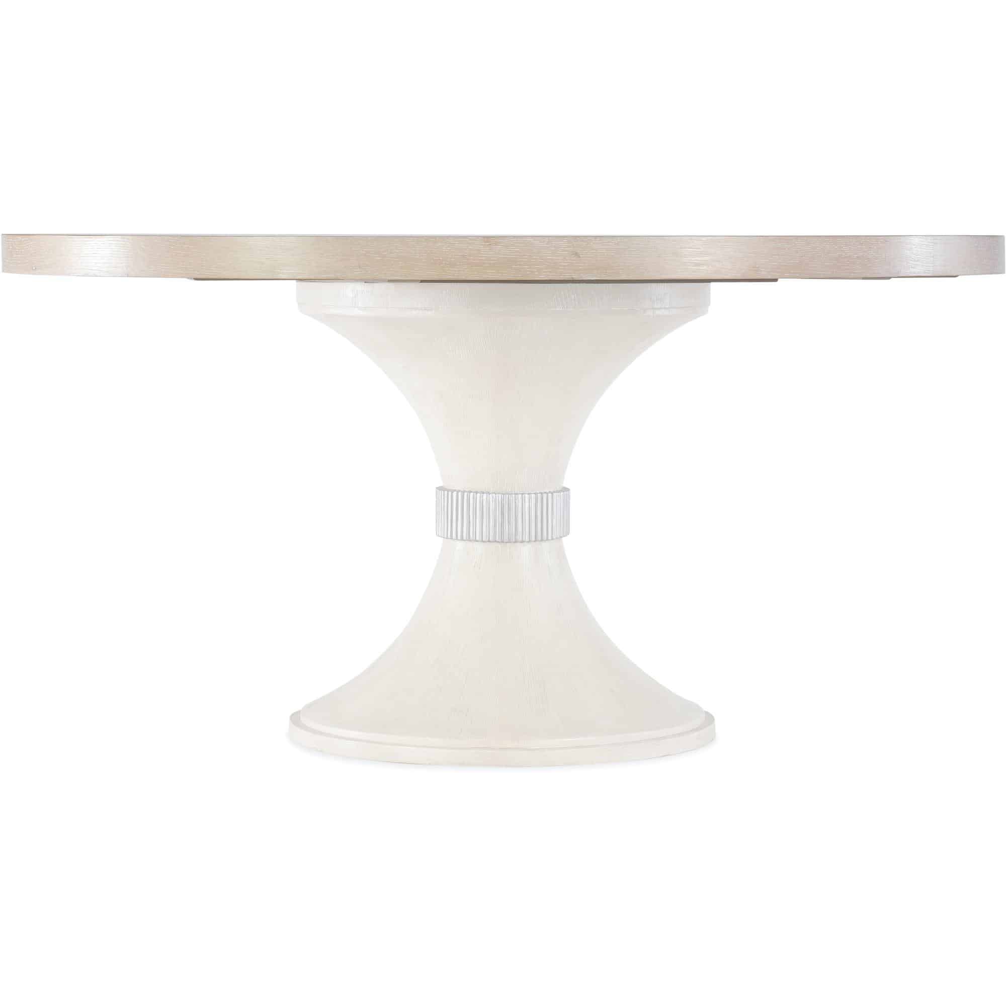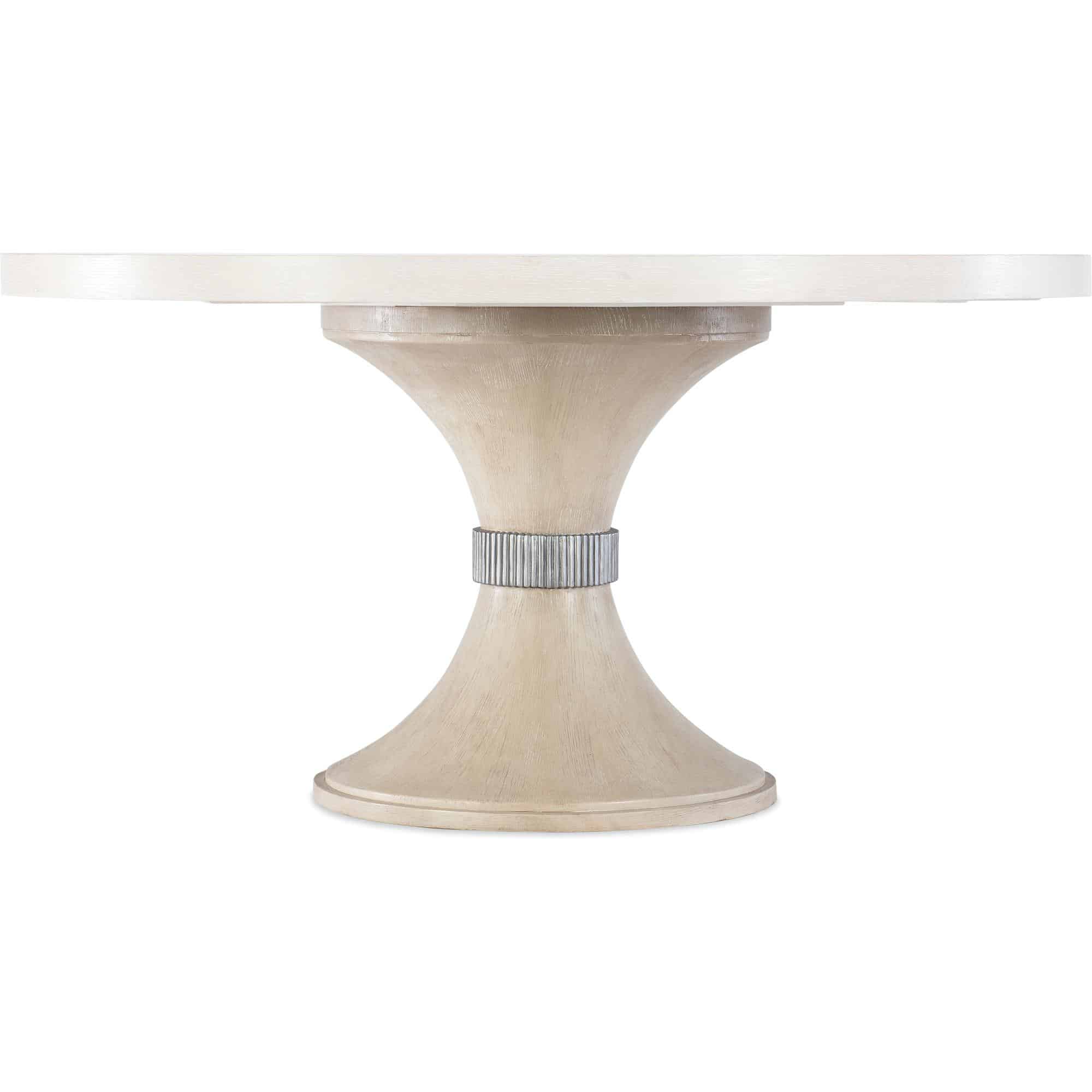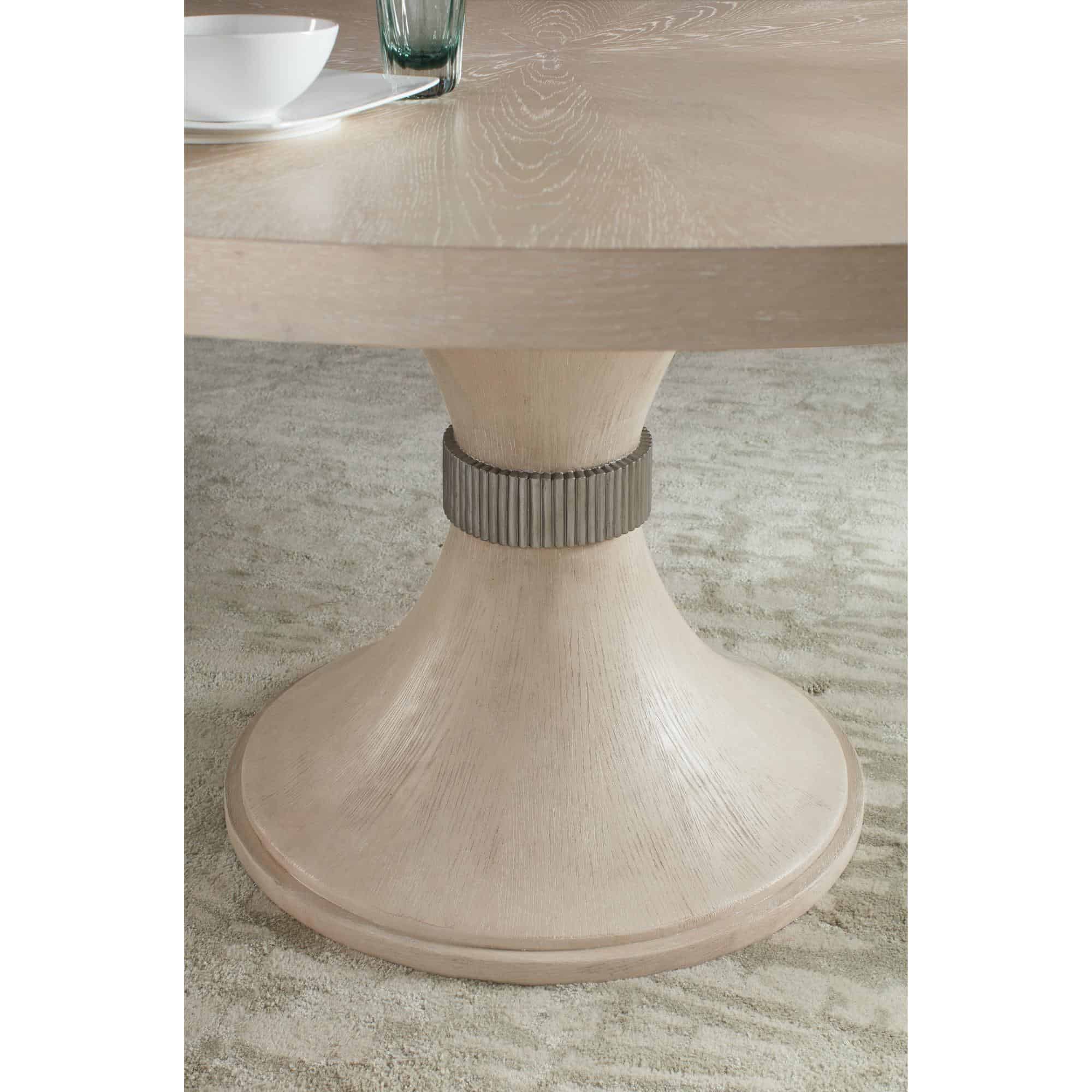 Finish: Sandstone: cathedral and quartered oak veneers with light wire brushing along with transparent and opaque stains to create this serene finish. Silver metallic collar accent on pedestal base.
