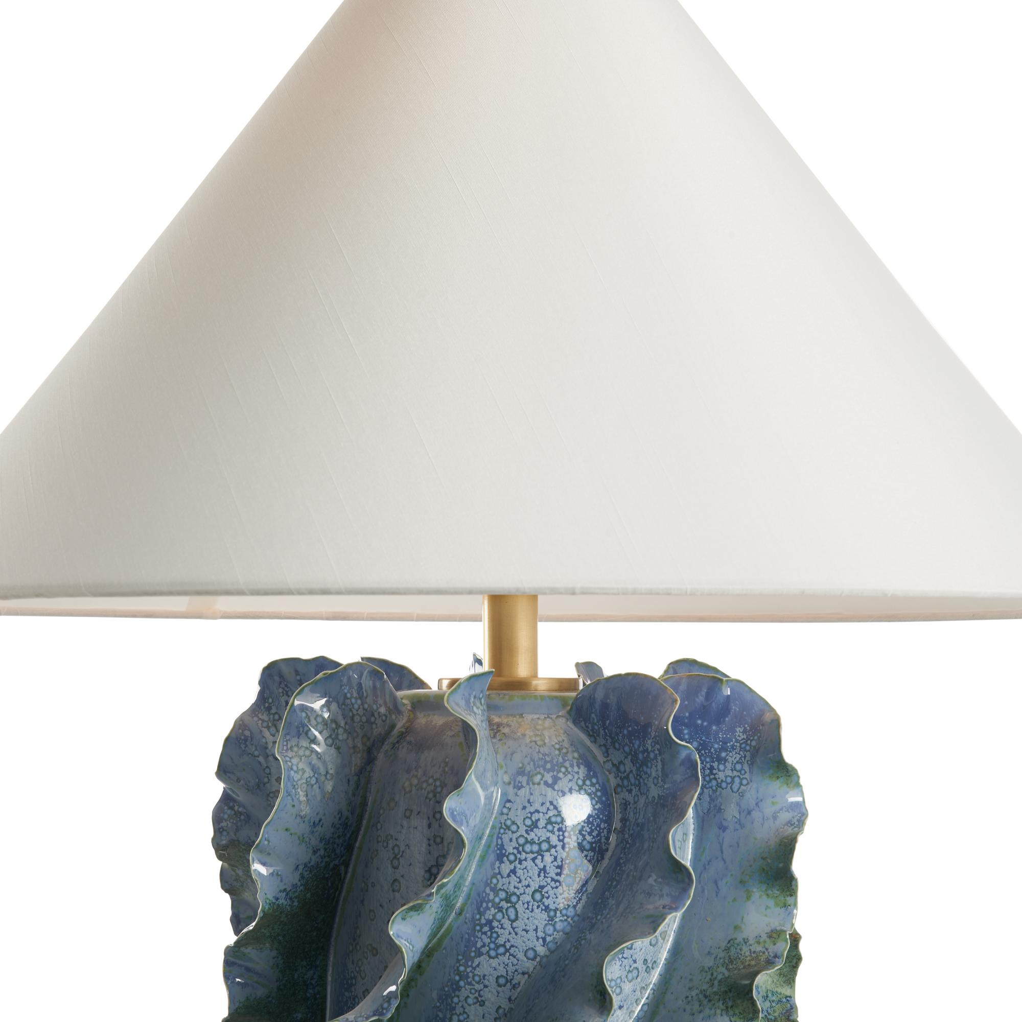 This ceramic lamp features soothing shades of blue and green, blending together like ocean tides. Its surface is adorned with scalloped protrusions reminiscent of gentle waves, adding texture and movement to the design. A clear base provides a modern, airy contrast, grounding the piece while keeping the focus on its unique and beautiful form.