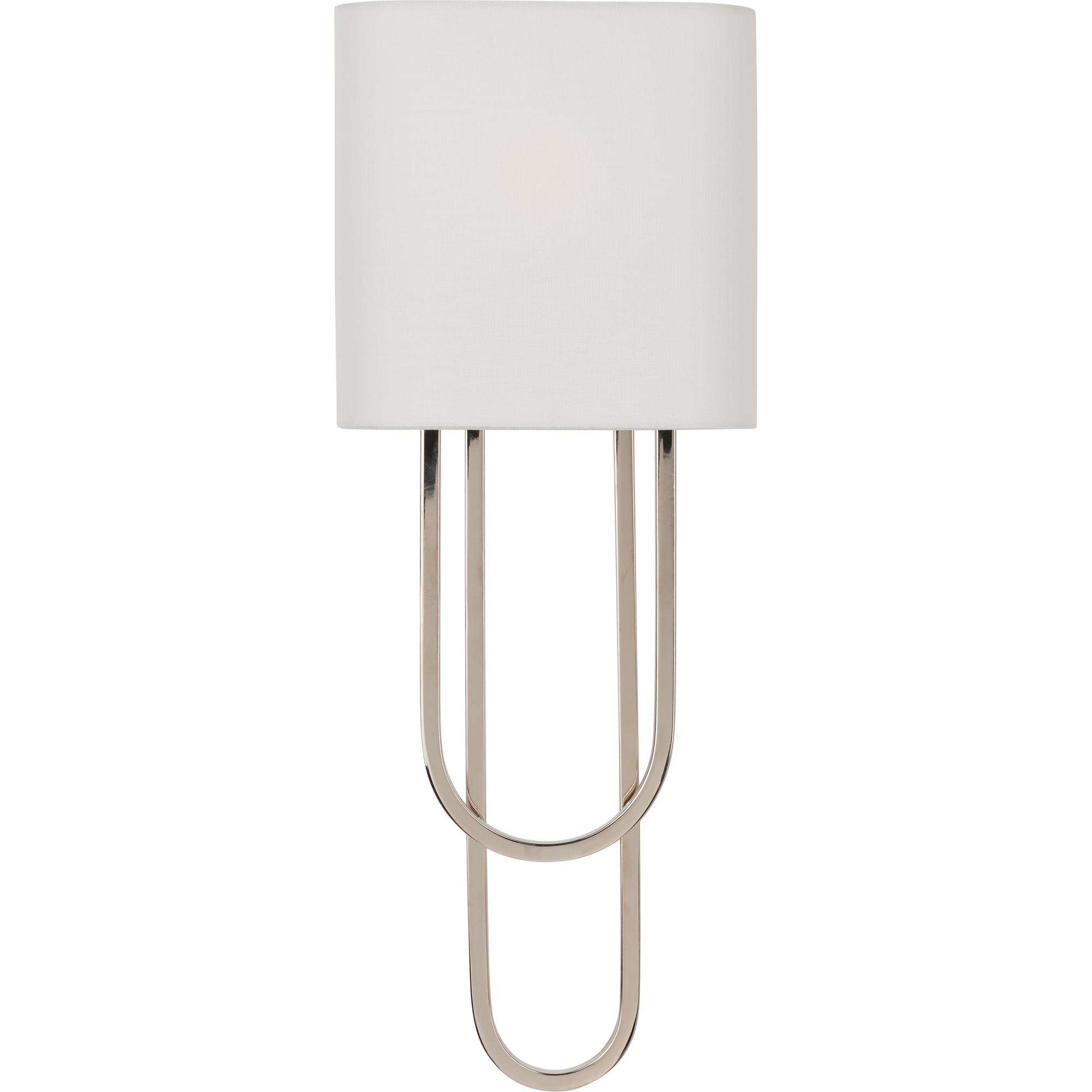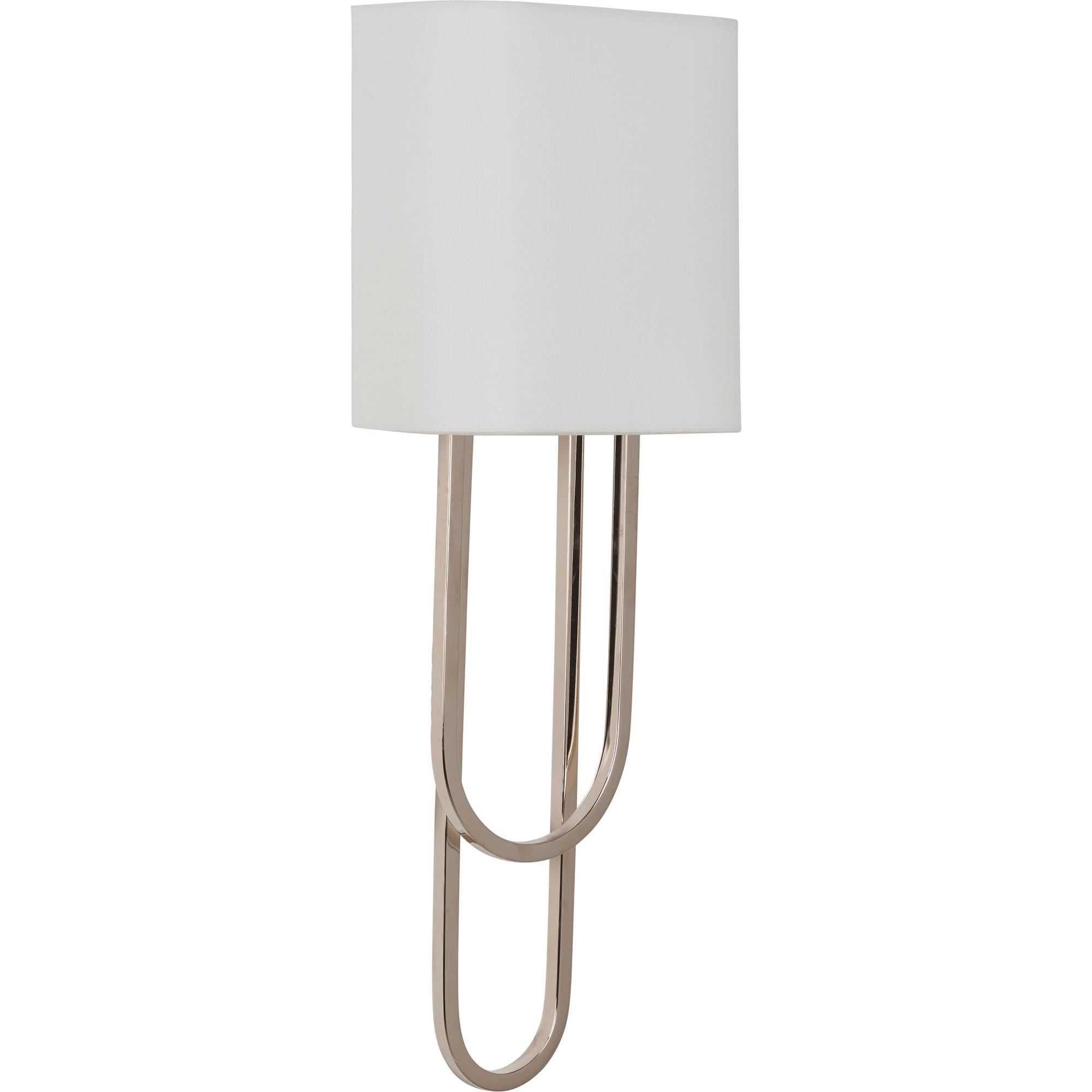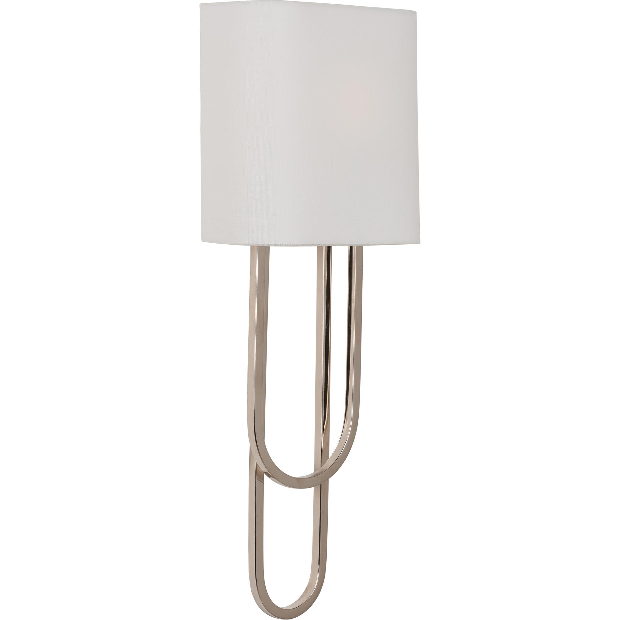 The Odeon Sconce features unique curves and features a polished nickel finish and sleek white shade. Designed by Jamie Merida