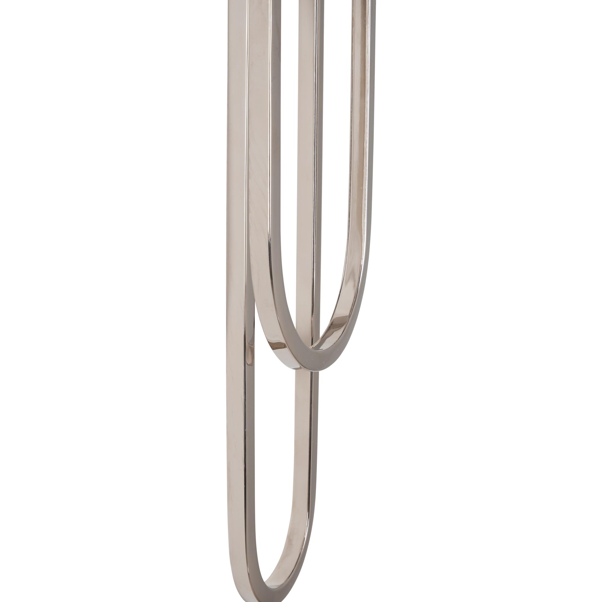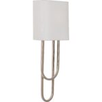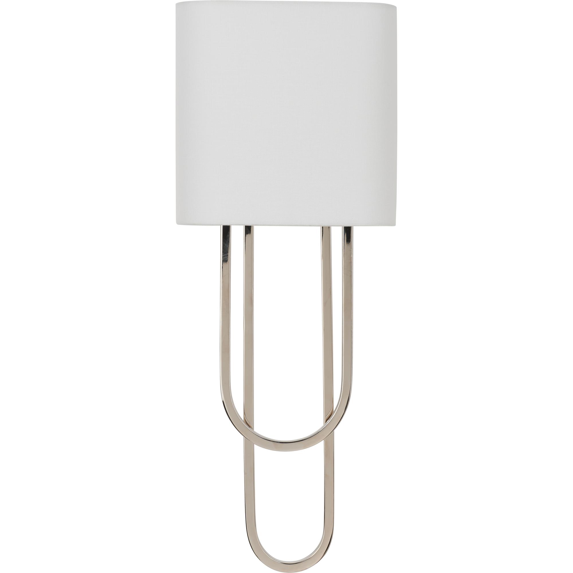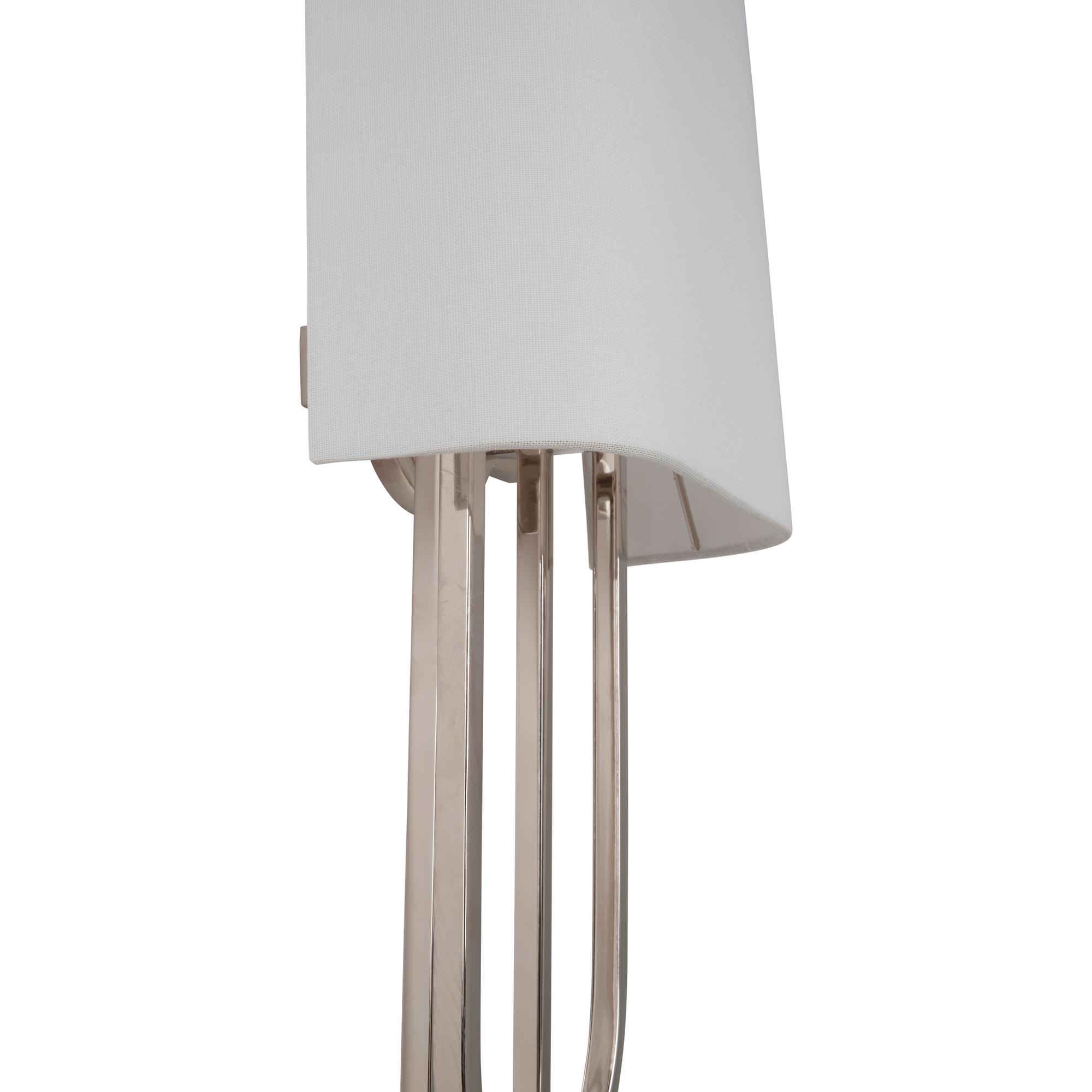 The Odeon Sconce features unique curves and features a polished nickel finish and sleek white shade. Designed by Jamie Merida