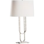 This lamp features a uniquely sculpted body with elegant, flowing curves that create a sense of movement and sophistication. Its polished nickel finish gives it a sleek ambiance. Perfect as a statement piece, it blends classic charm with modern artistry. Designed by Jamie Merida.