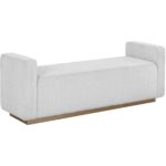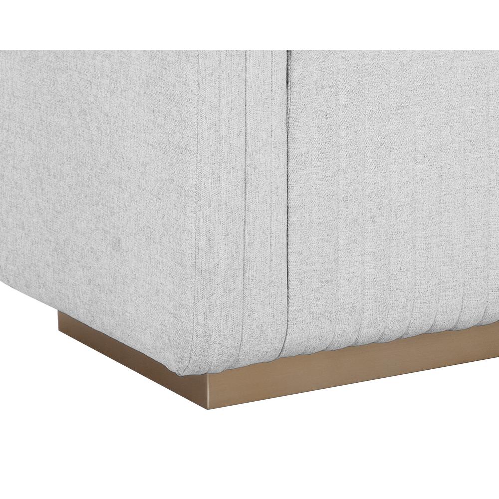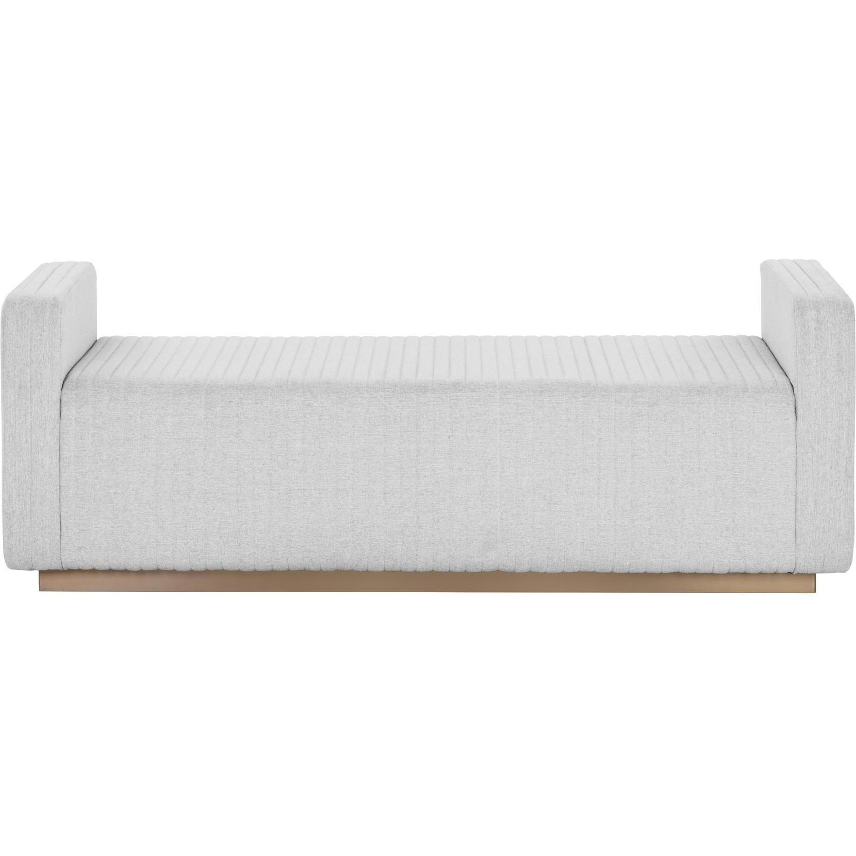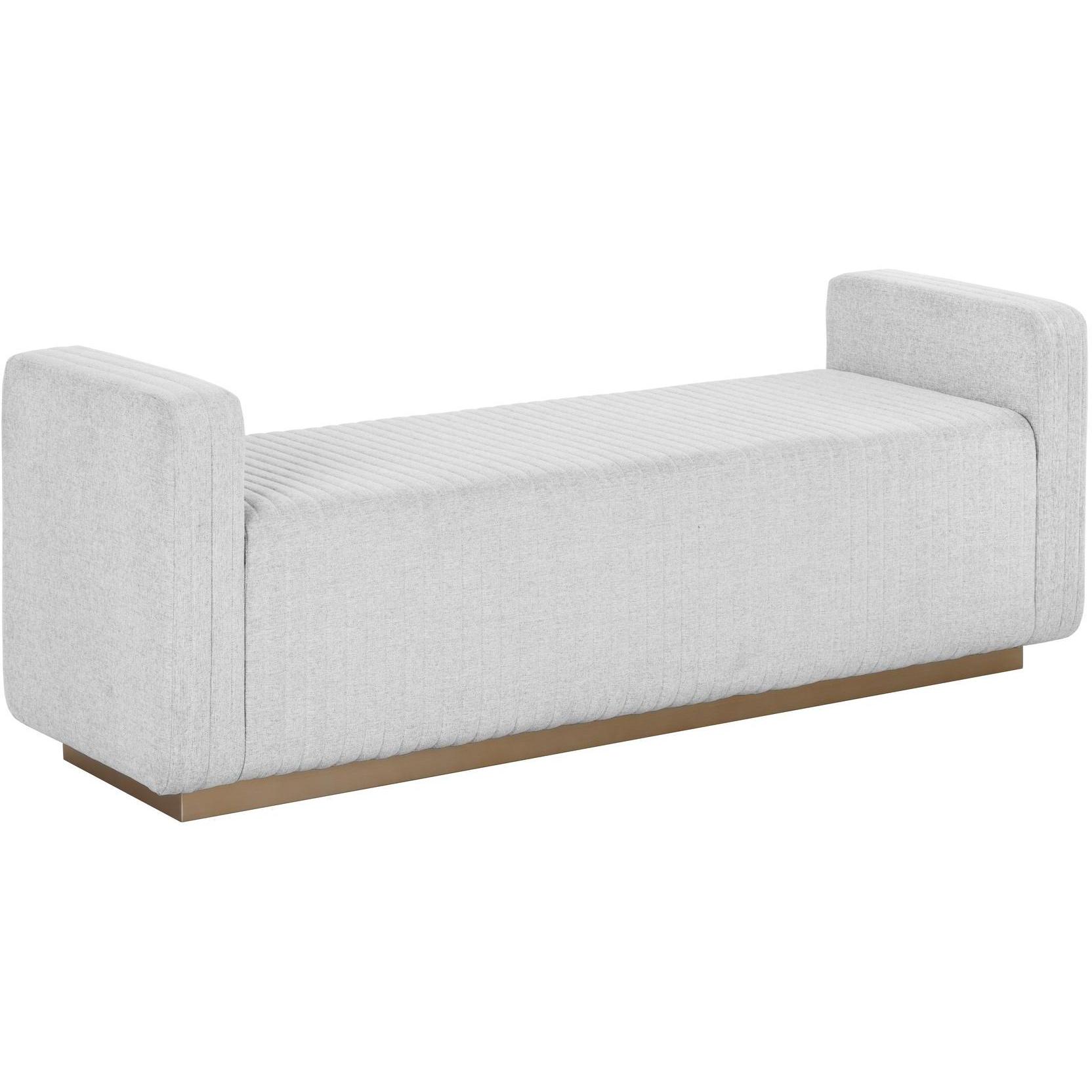 Boasting a chic block design, this modern bench features a minimalist design with high impact. Upholstered in ernst silverstone fabric with channel tufting. Completed with a striking antique brass stainless steel base. Also available in maven black faux leather.