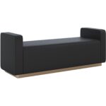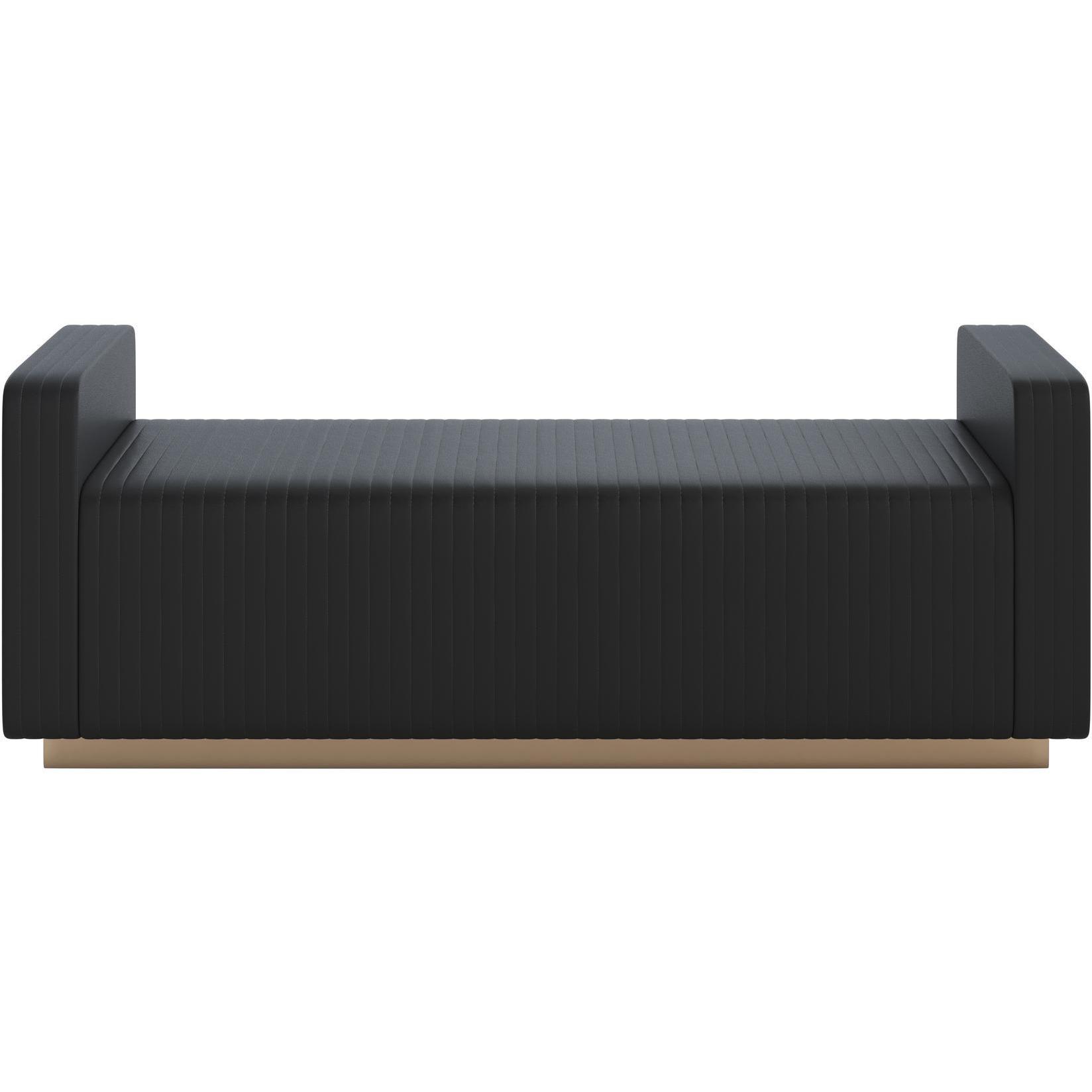 Boasting a chic block design, this modern bench features a minimalist design with high impact. Upholstered in maven black faux leather with channel tufting. Completed with a striking antique brass stainless steel base. Also available in ernst silverstone fabric. Handle With Care: This design has been crafted with faux leather. Faux leather is manufactured to reflect the natural characteristics of leather; as such, colour variations, markings wrinkles, grooves, and light scratches are appreciated characteristics. No two pieces will be alike.