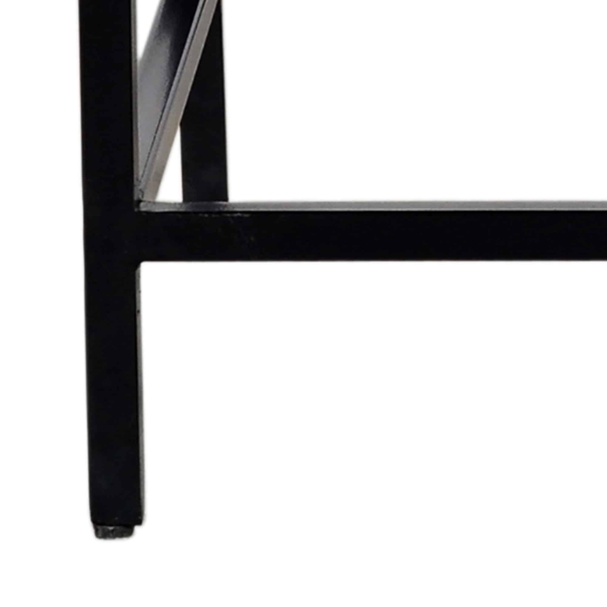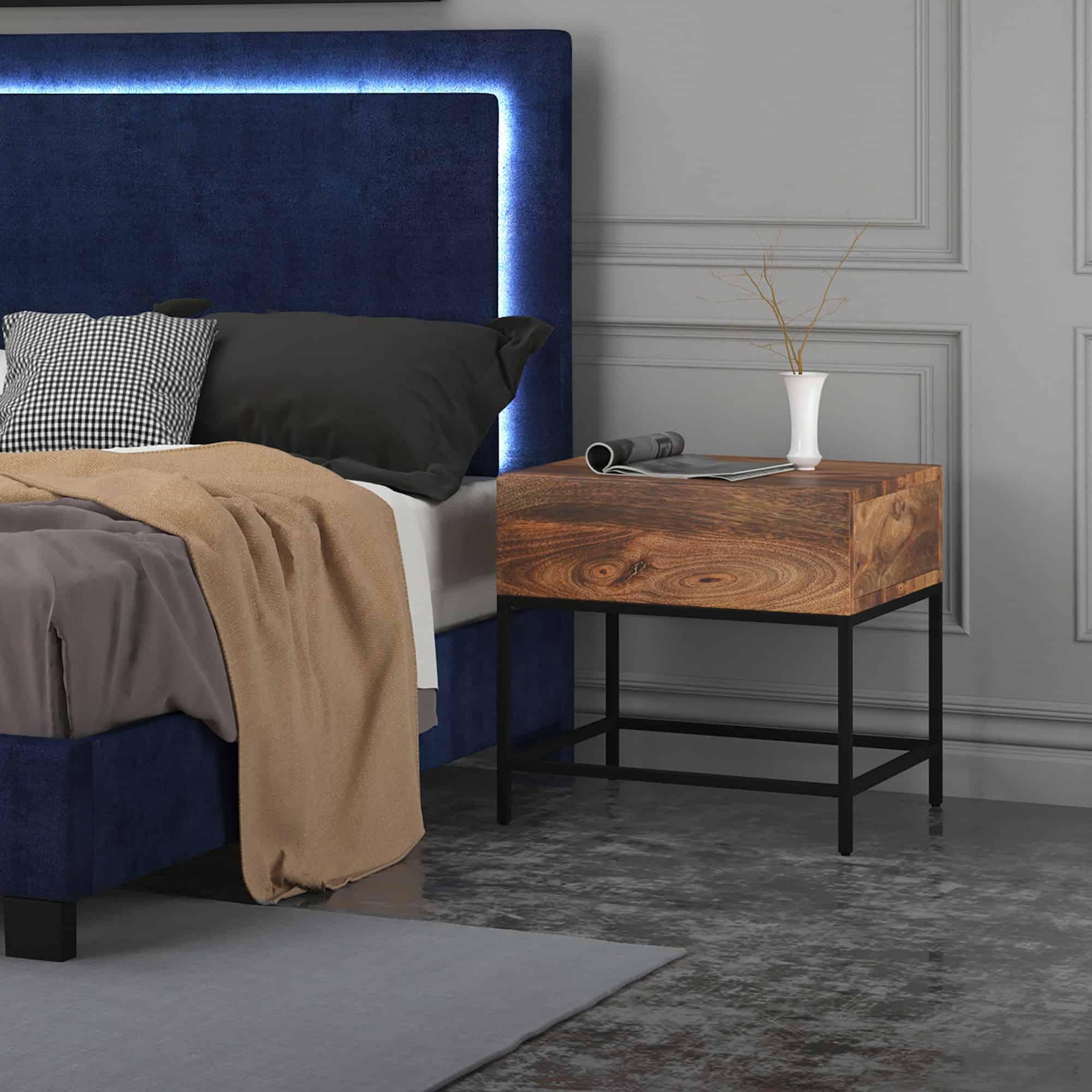 This rustic modern accent table has a spacious drawer for things that you want out of the way but still within reach – think remote controls, reading glasses, and coasters. The black wrought iron frame adds a stylish component to this piece while providing sturdy support. The sustainable solid wood table top is finished beautifully in a natural burnt finish, preserving the accentuating features of the mango wood. Great for a casual living space, in a bedroom, or hallway.