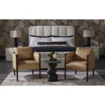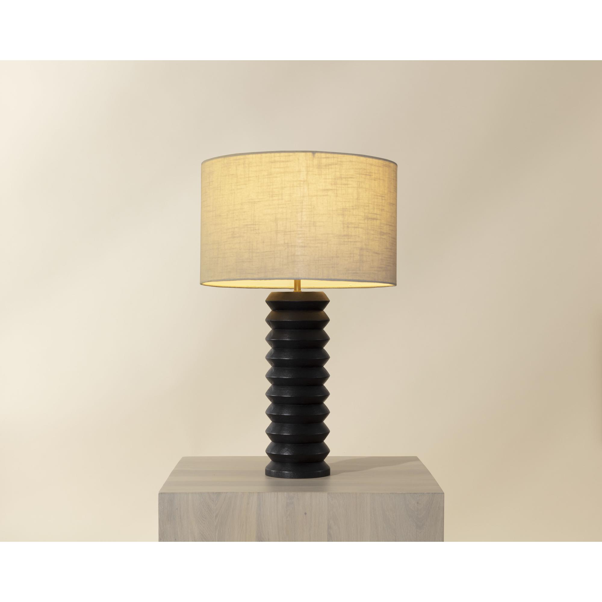 Organic shapes descend in a cylindrical form to create the Oletto Table Lamp. Made from black mango wood and topped with a cream linen shade, this piece features grooves and ridges for a tactile touch.