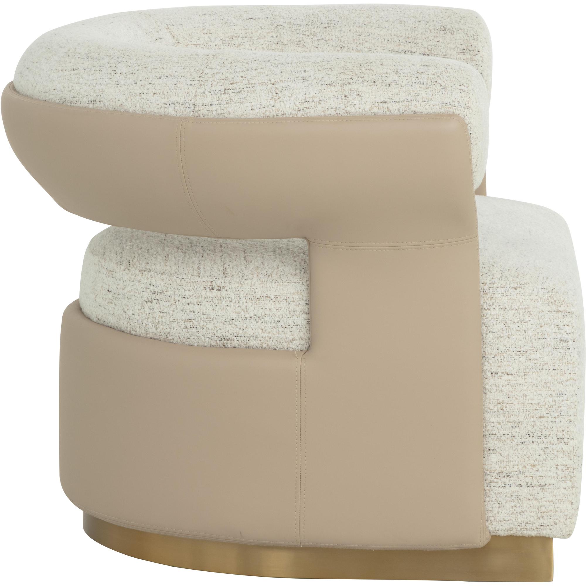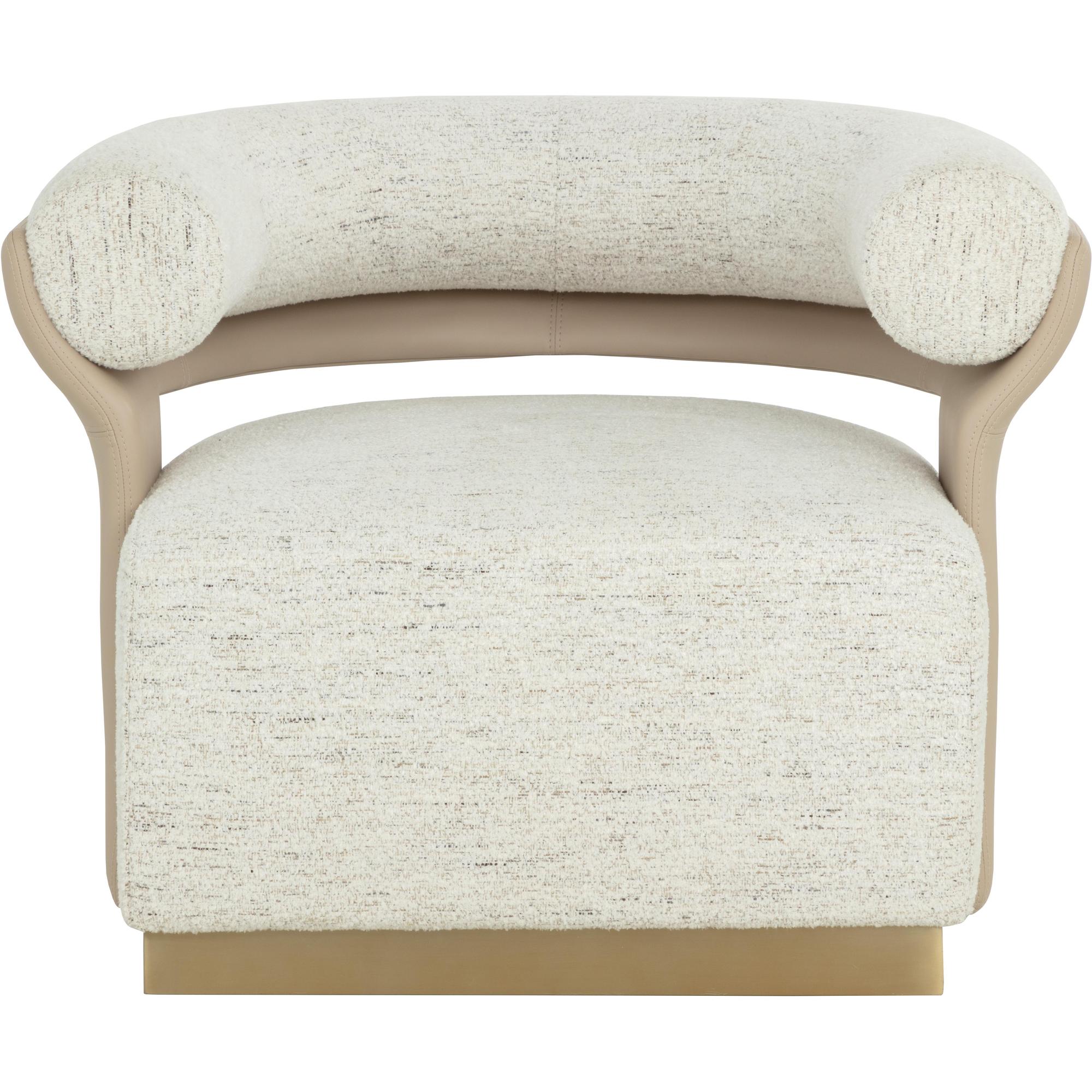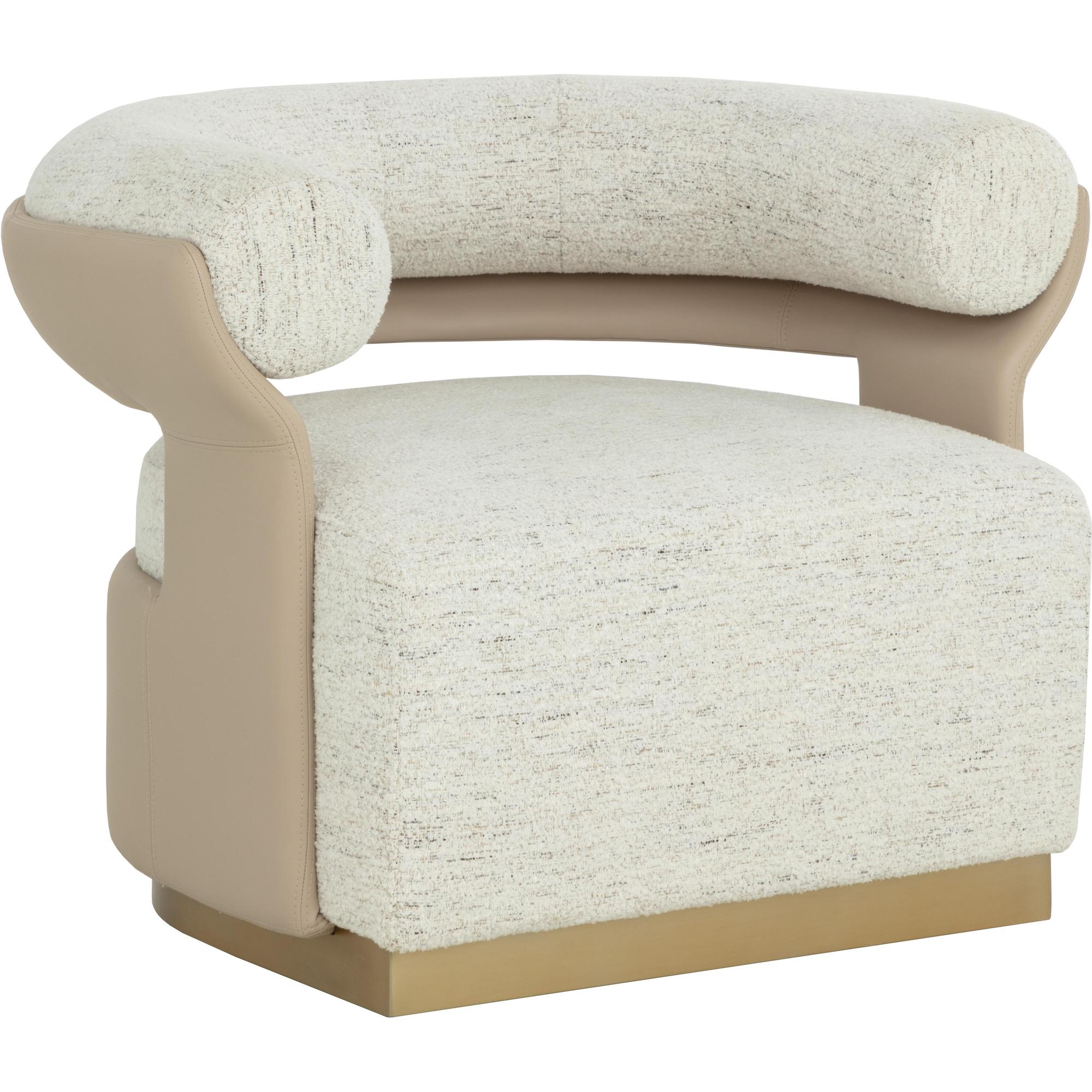 Generously curved and sculpted, the Olida Swivel Lounge Chair is a great show of contemporary style and personality. Expertly upholstered in hailey moon fabric and accented with nappa beige faux leather and a polished metal base for a demonstration of sharp and shapely ingenuity.