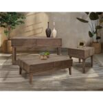 - Lightly distressed wood with a brown multi-step lacquer finish.