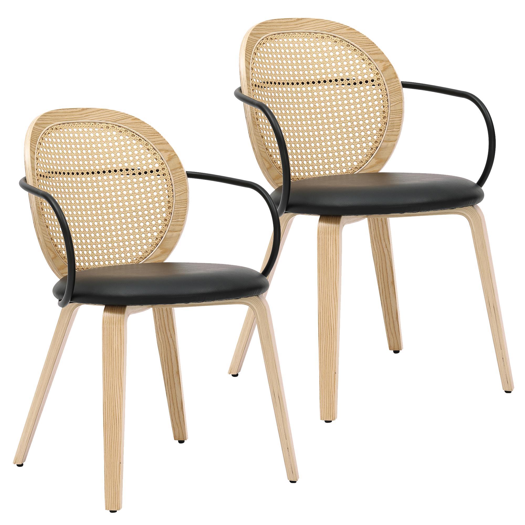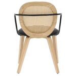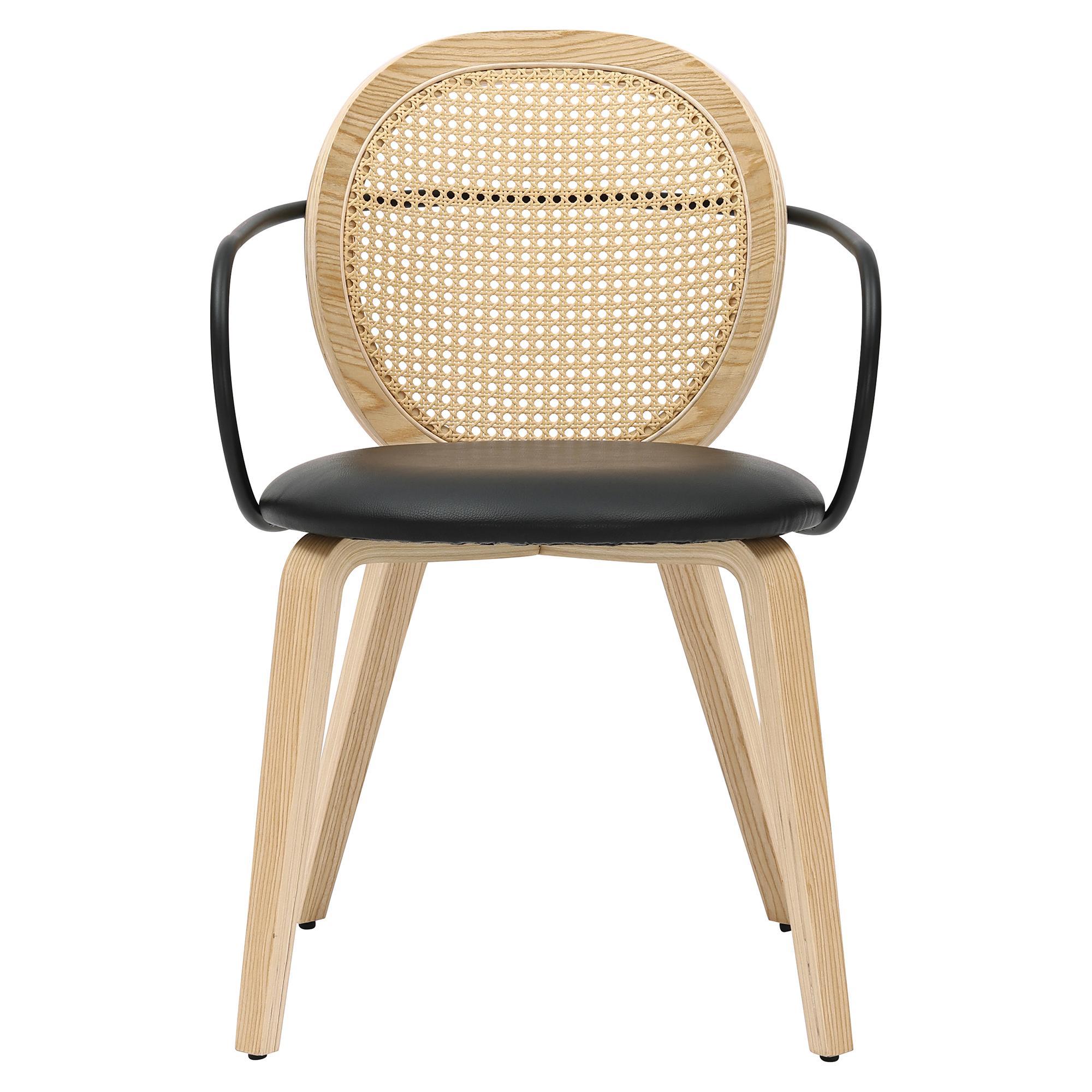 Bringing timeless elegance to the forefront with a modern twist. The faux rattan on the chair back creates a soft and inviting look while the black metal wrap-around arms and black faux leather seat give a more updated look to these chairs. The light oak finish of the bentwood frame and legs is the perfect finishing touch to tie it all together. Great for formal or casual dining spaces.