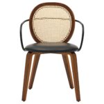 Bringing timeless elegance to the forefront with a modern twist. The faux rattan on the chair back creates a soft and inviting look while the black metal wrap-around arms and black faux leather seat give a more updated look to these chairs. The walnut finish of the bentwood frame and legs is the perfect finishing touch to tie it all together. Great for formal or casual dining spaces.