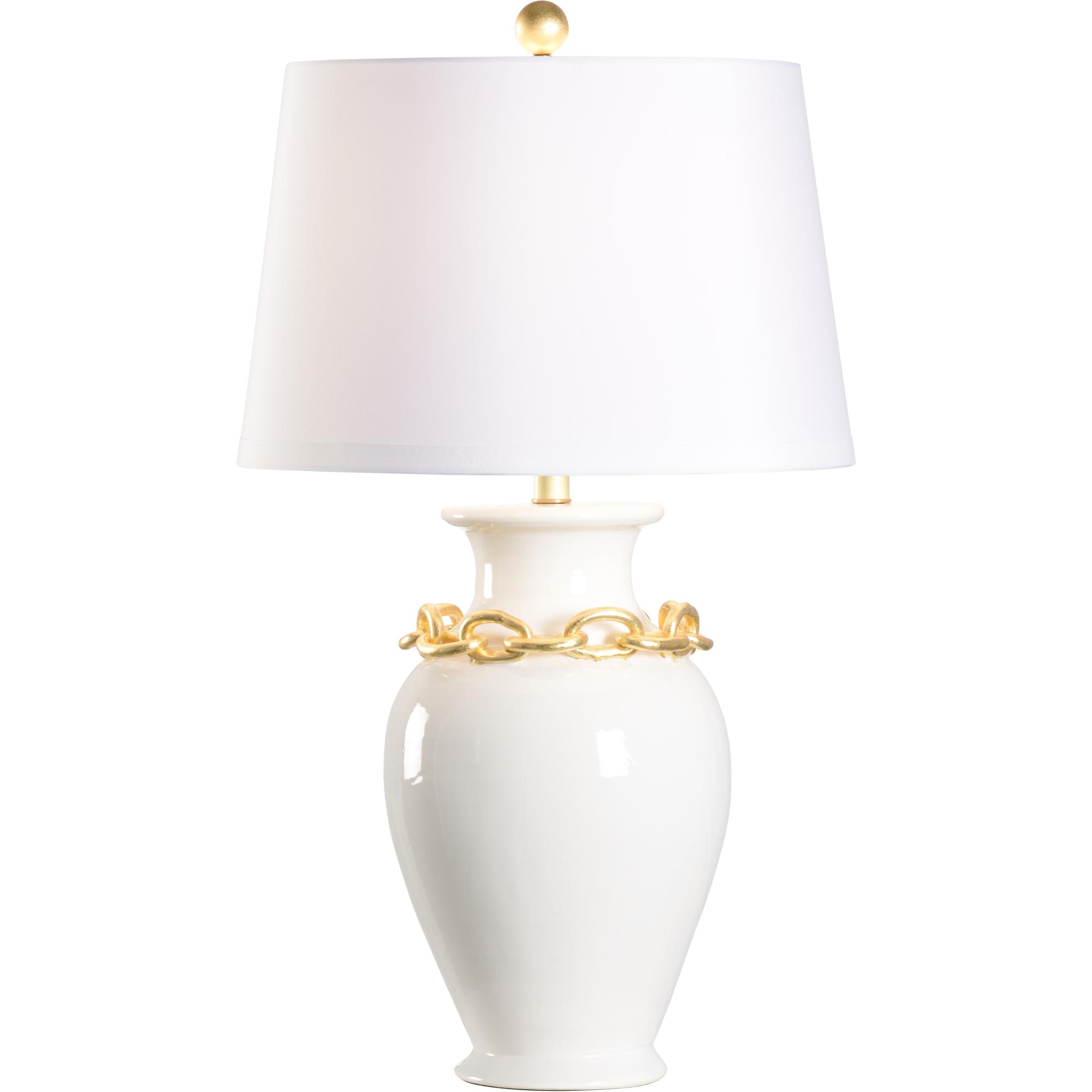 Hand sculpted in Italy, oro lamp features a shimmering gold leaf chain on a white glazed ceramic. A white silk empire shade and classic gold ball finial complete this elegant design.
