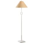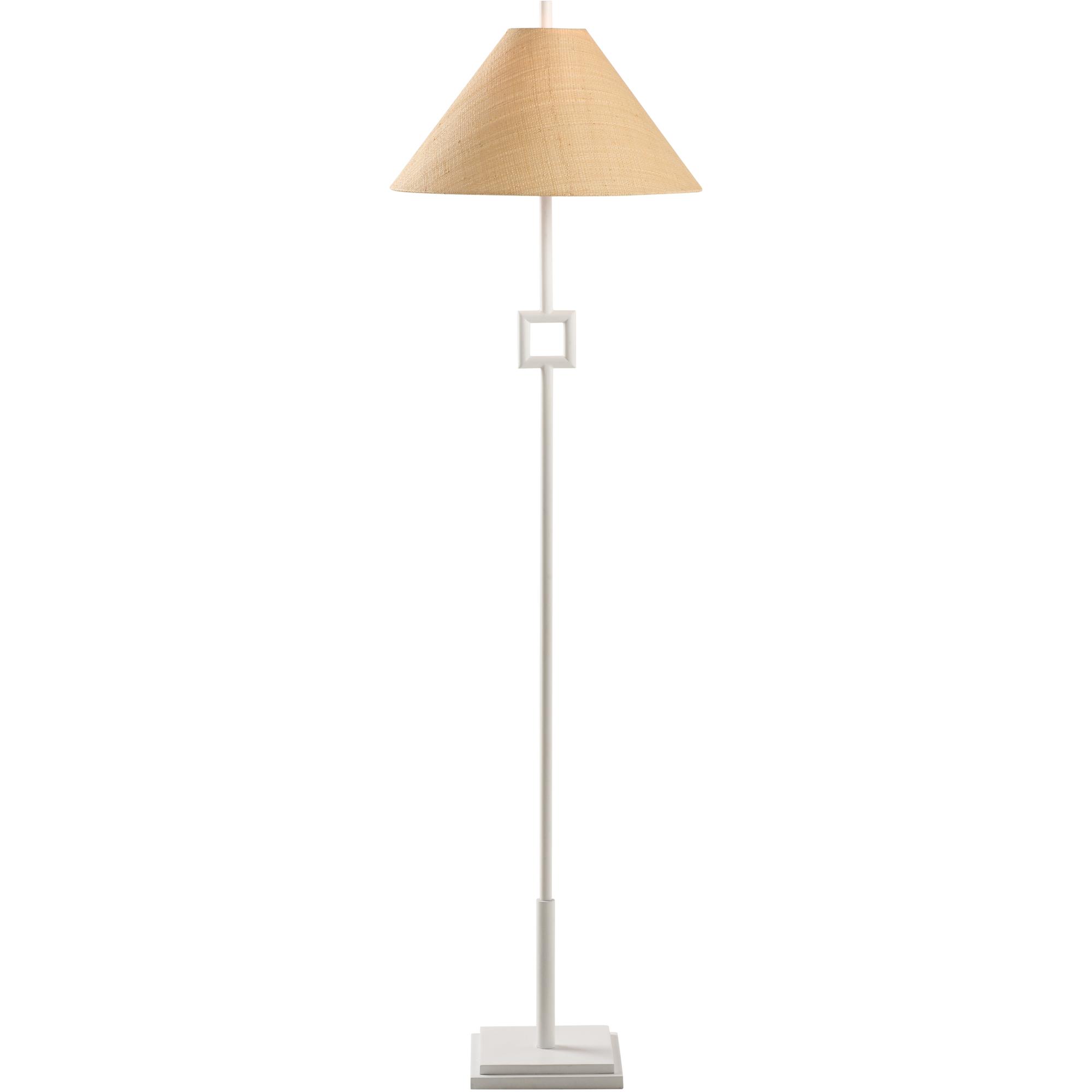 This sleek metal floor lamp features a modern silhouette with a bold square accent, adding a touch of architectural elegance. Finished in a matte white, it exudes charm and sophistication, making it a perfect statement piece for any contemporary or classic space. Designed by Jamie Merida.